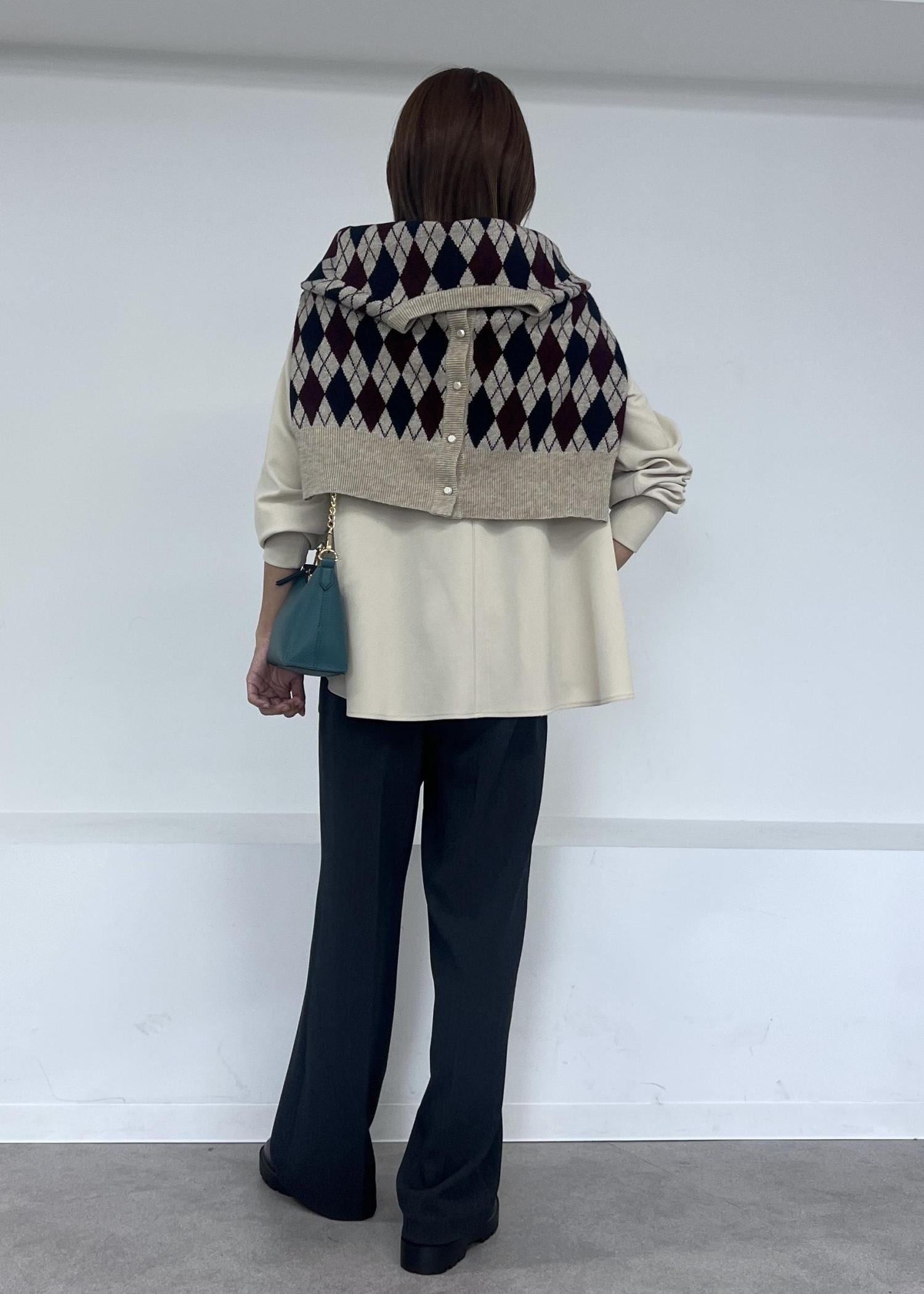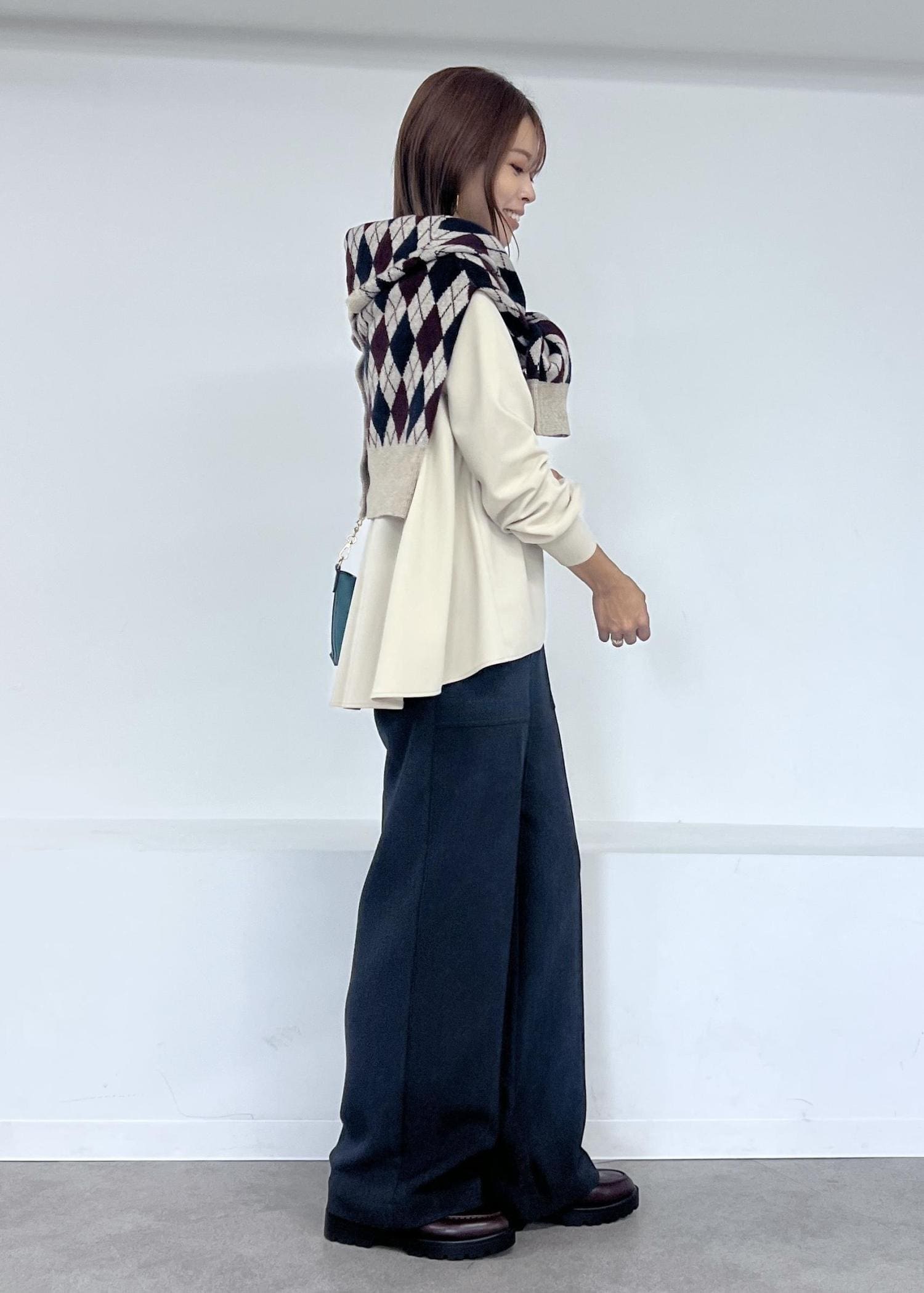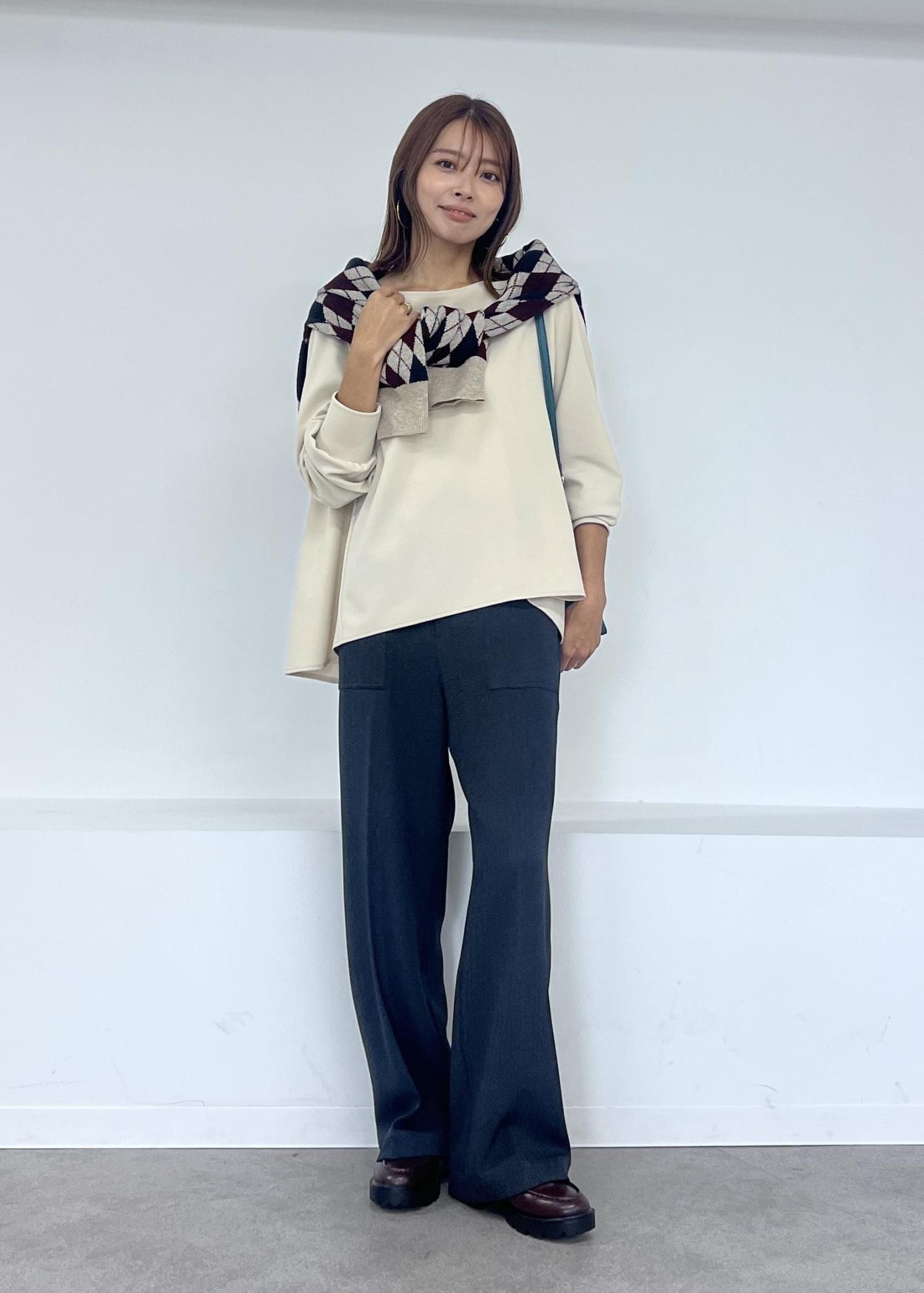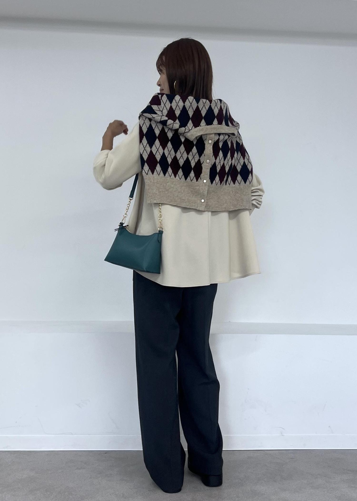 アーガイル柄のカーディガンを肩掛けして、大人カジュアルスタイルにしました。