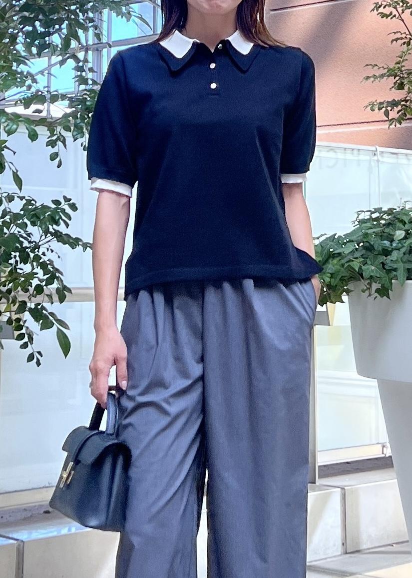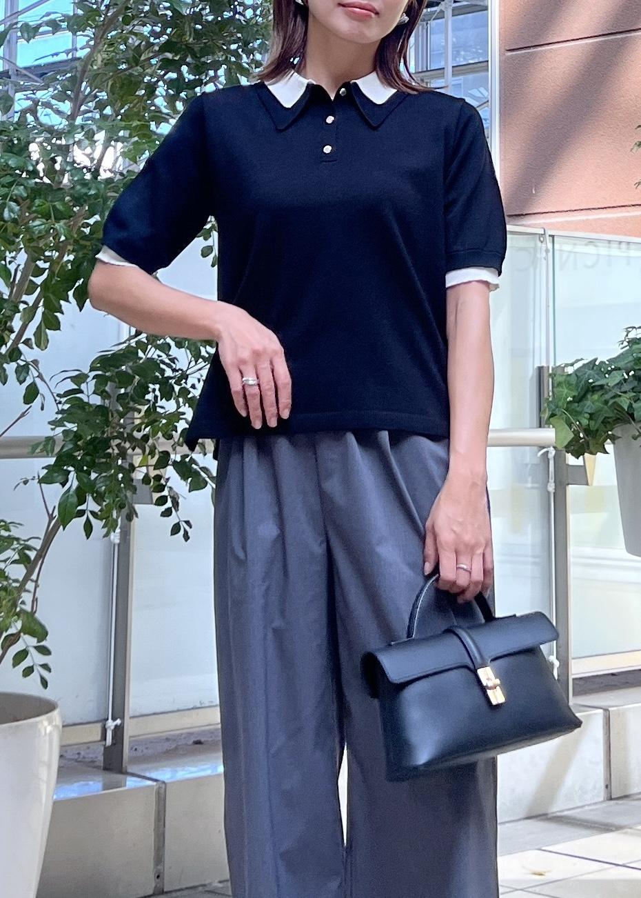 重ね着風の襟デザインがポイントのニットは、柔らかくしなやかな生地感で居心地も楽ちん。