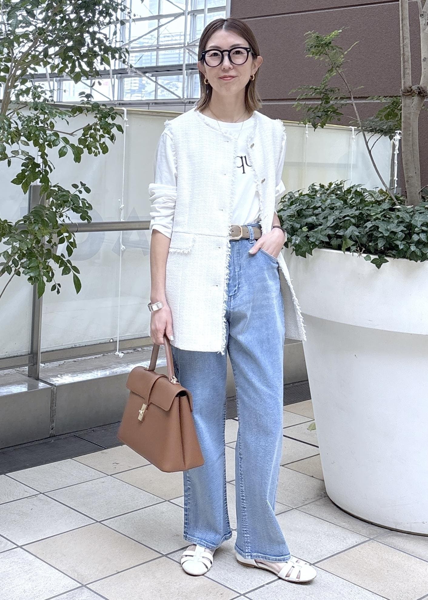 ベージュのシアートップスを合わせて、シンプルな大人カジュアルなスタイリングにしました。