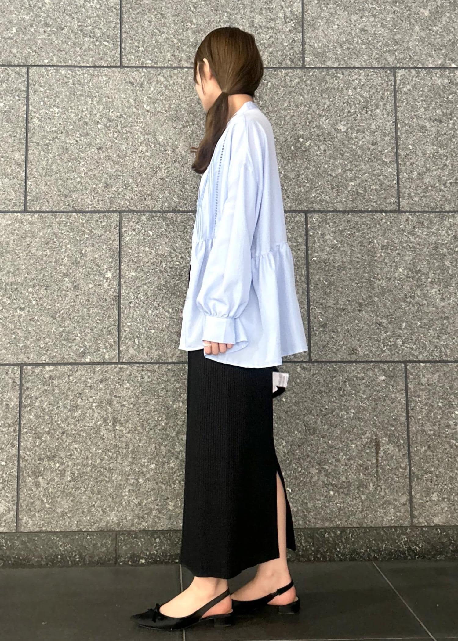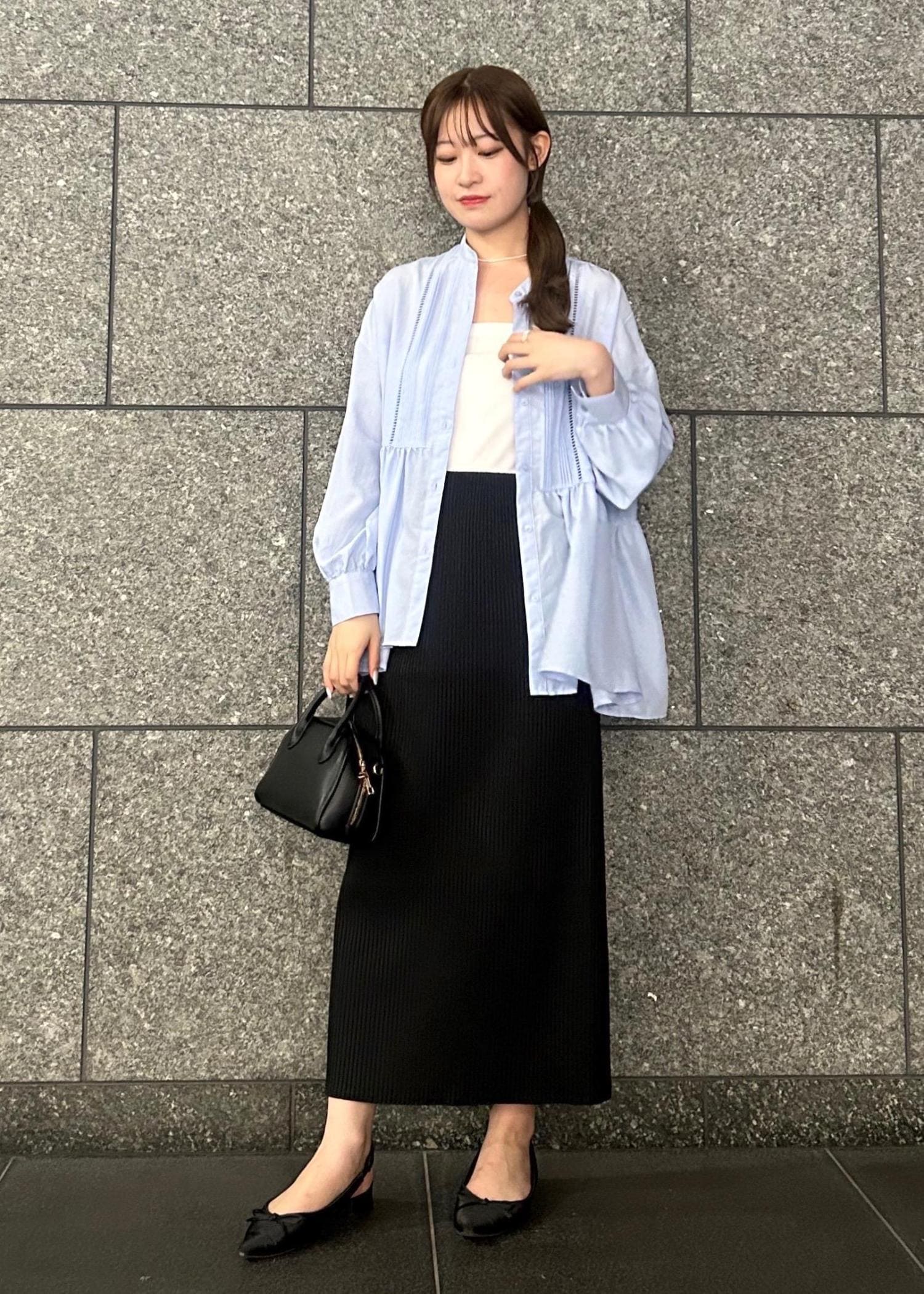 Iラインのスカートとブラックの小物を使って、カジュアルになりすぎず、大人らしさをプラスしました!