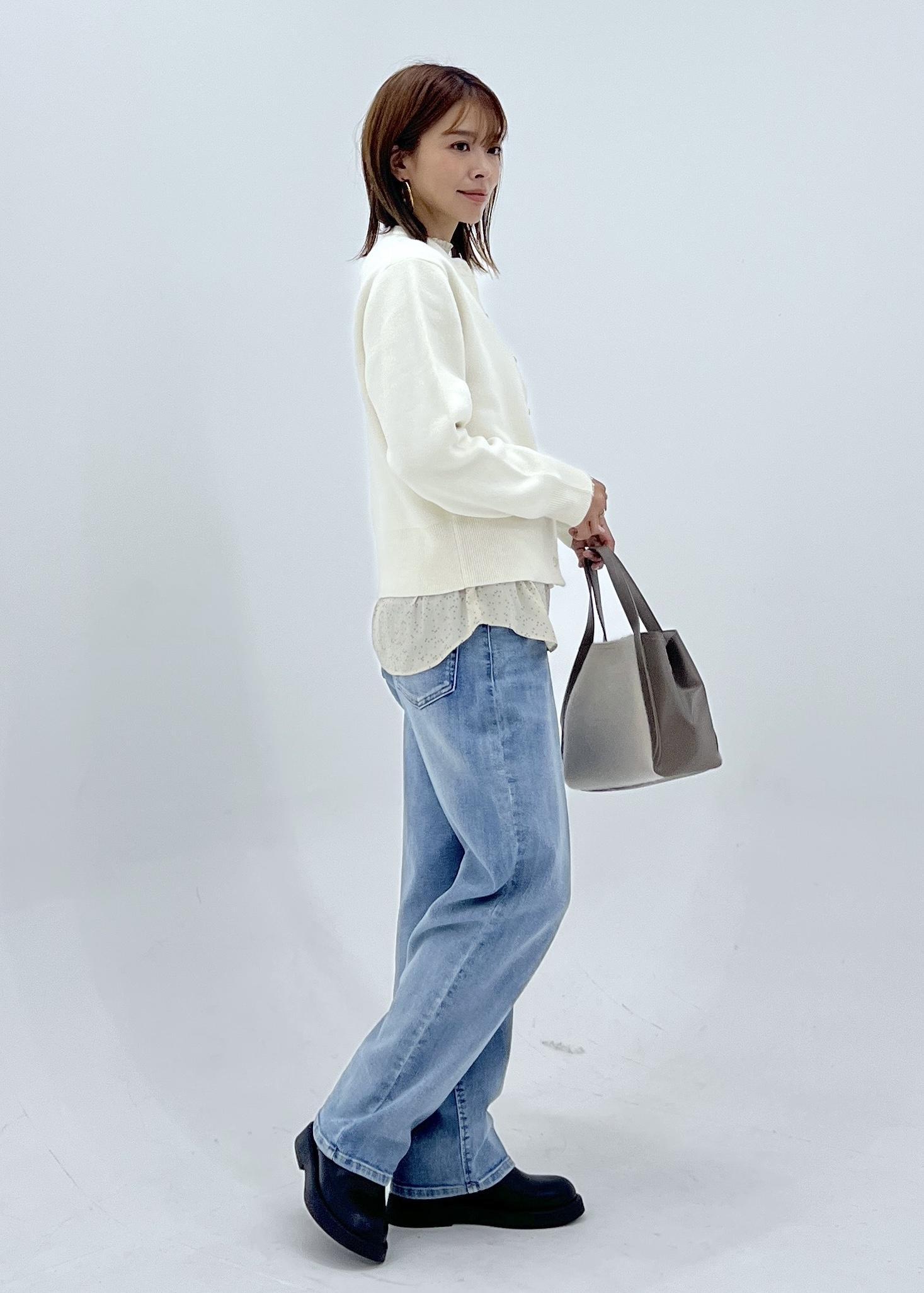 甘くなりすぎないようにデニムで大人カジュアルなスタイリングにしました。