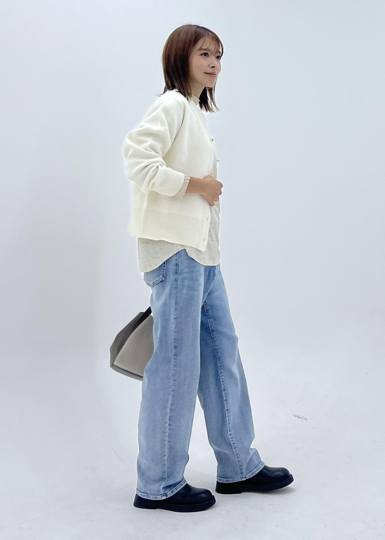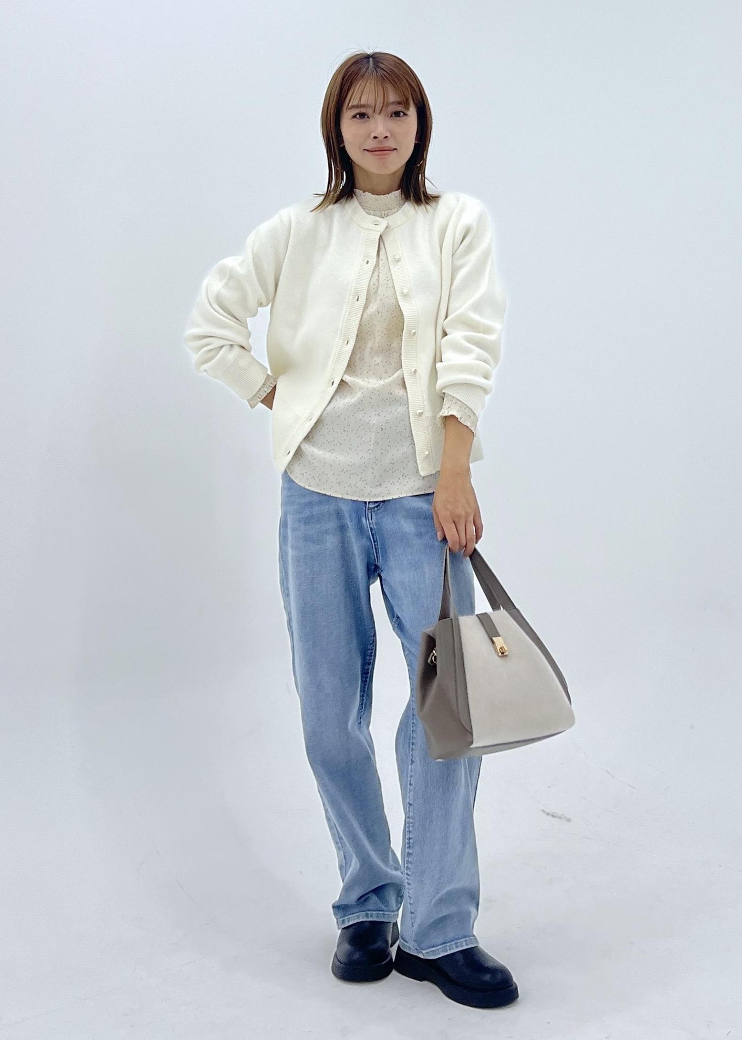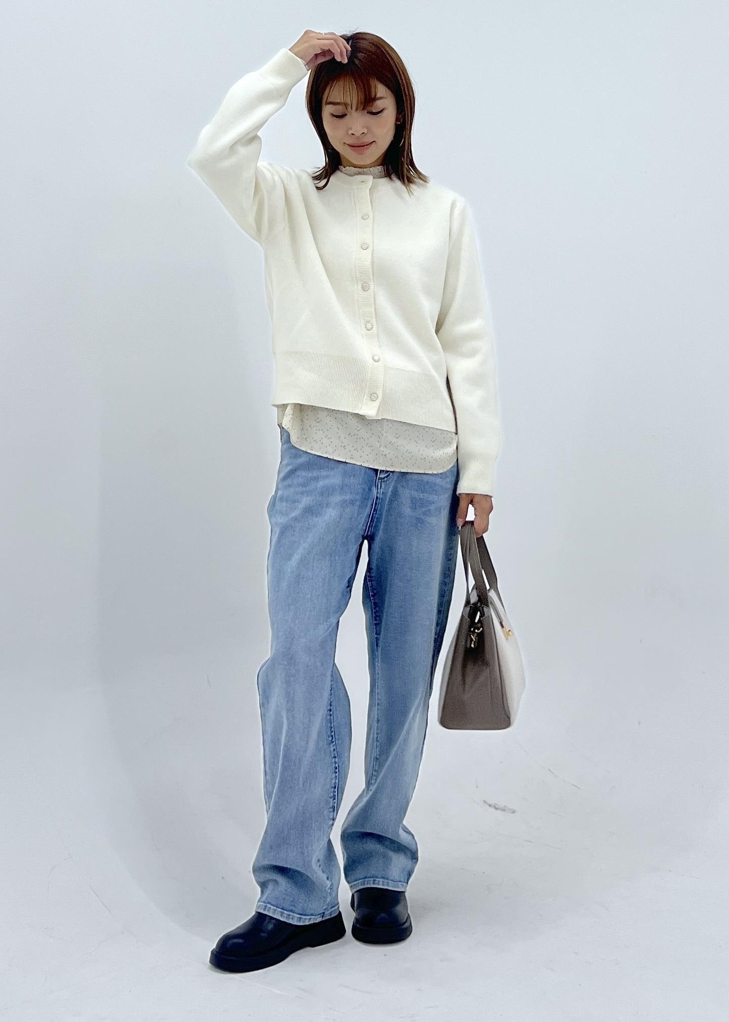 着回し力の高い白ニットのカーディガンは、クルーネックで綺麗めカジュアルなコーデにおすすめ。