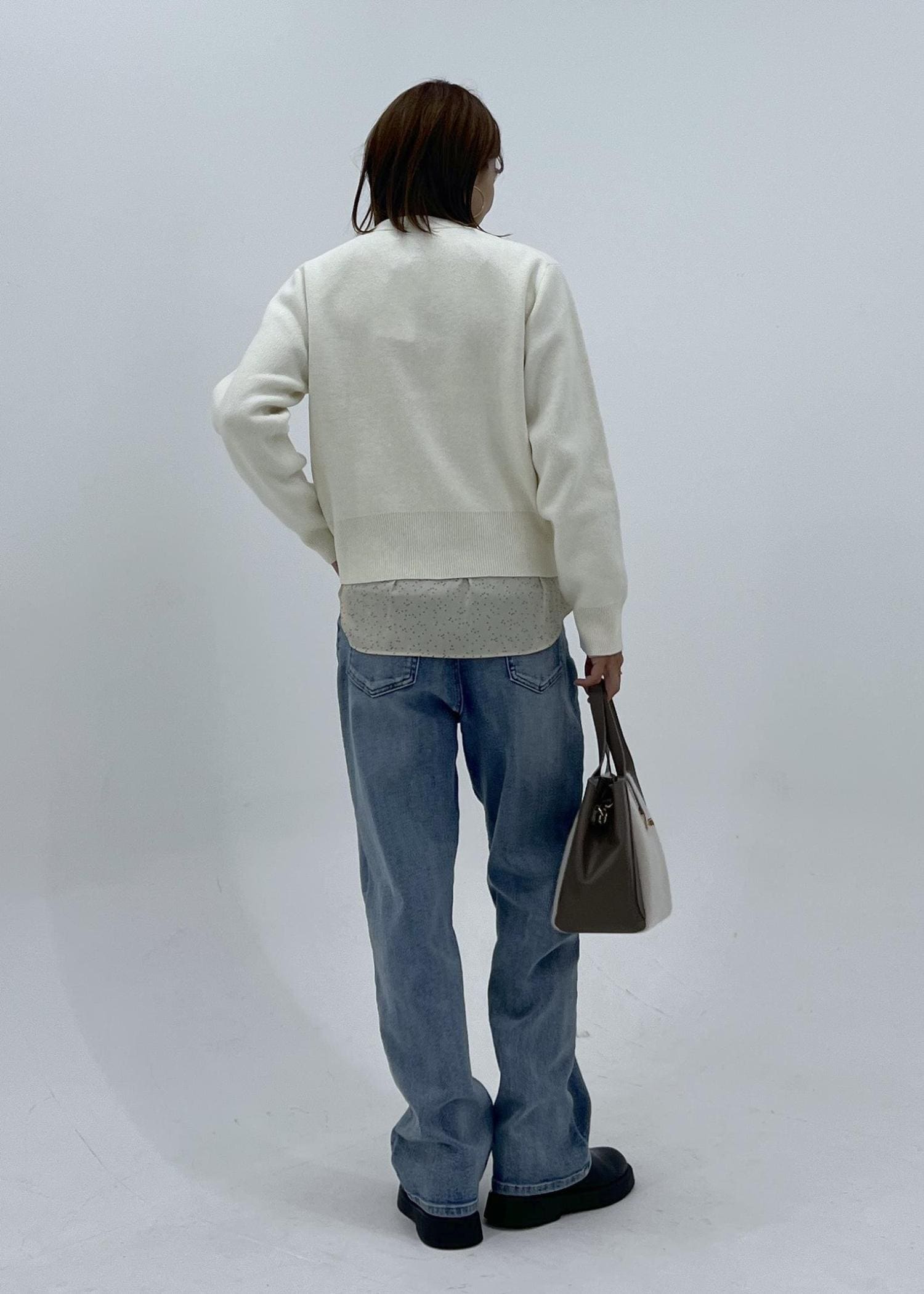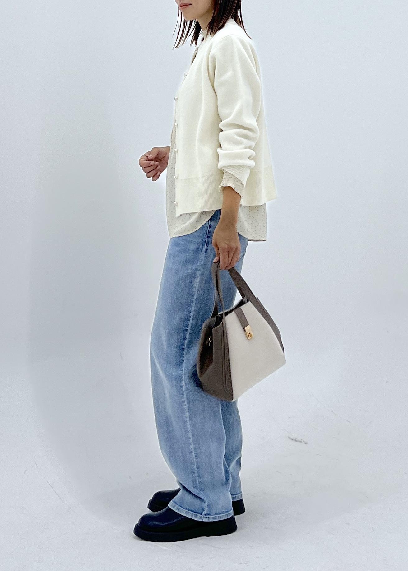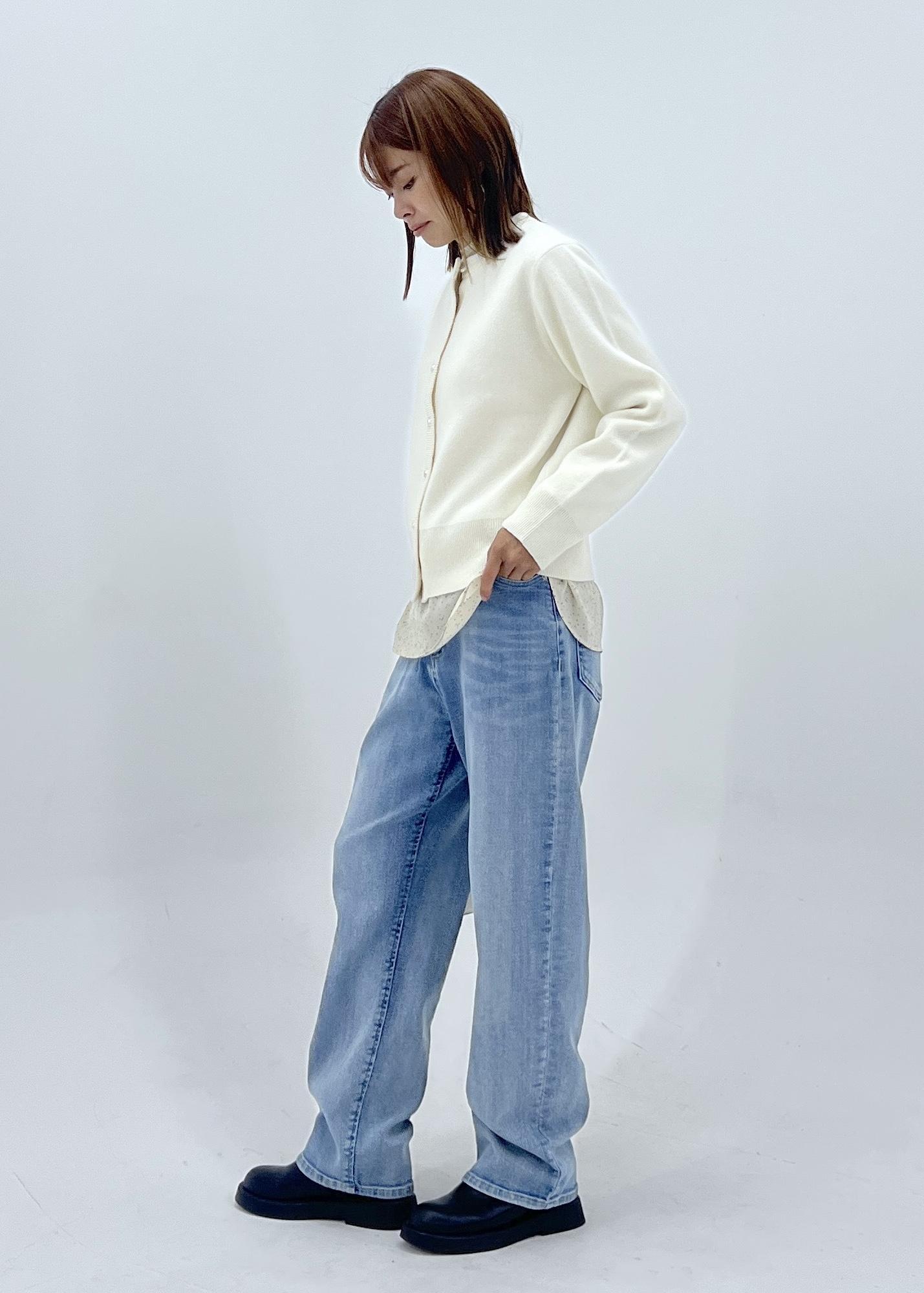 着回し力の高い白ニットのカーディガンは、クルーネックで綺麗めカジュアルなコーデにおすすめ。