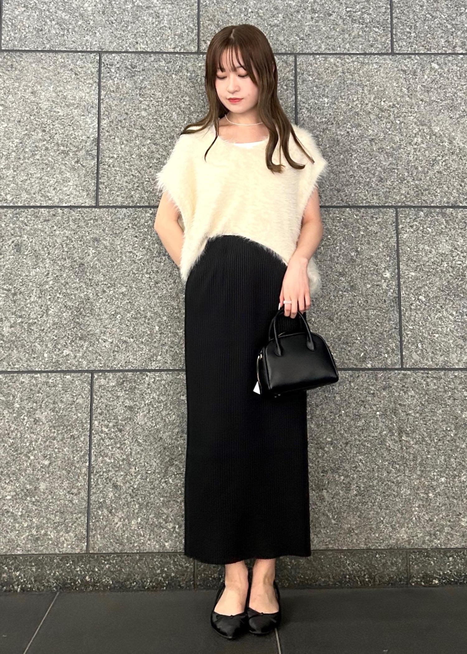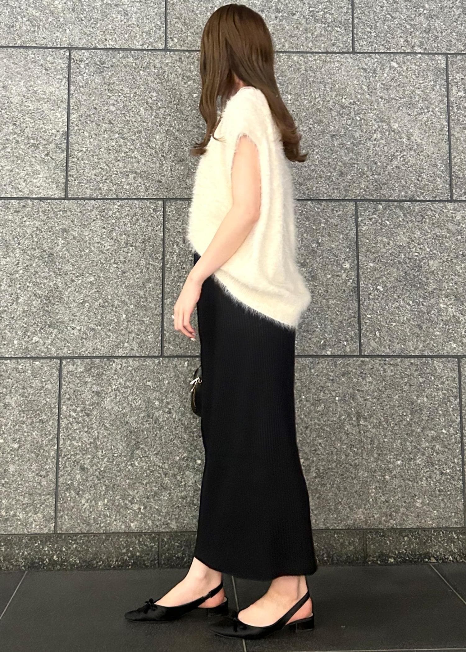 VネックデザインのフェザーニットとIラインスカートを合わせて、大人らしさを演出した「きれいめコーデ」に仕上げました!