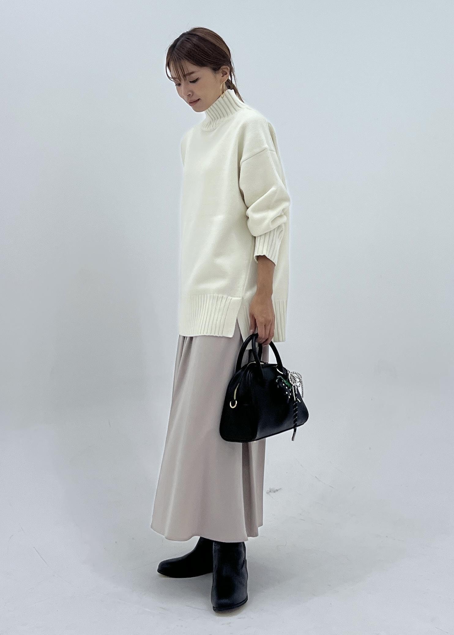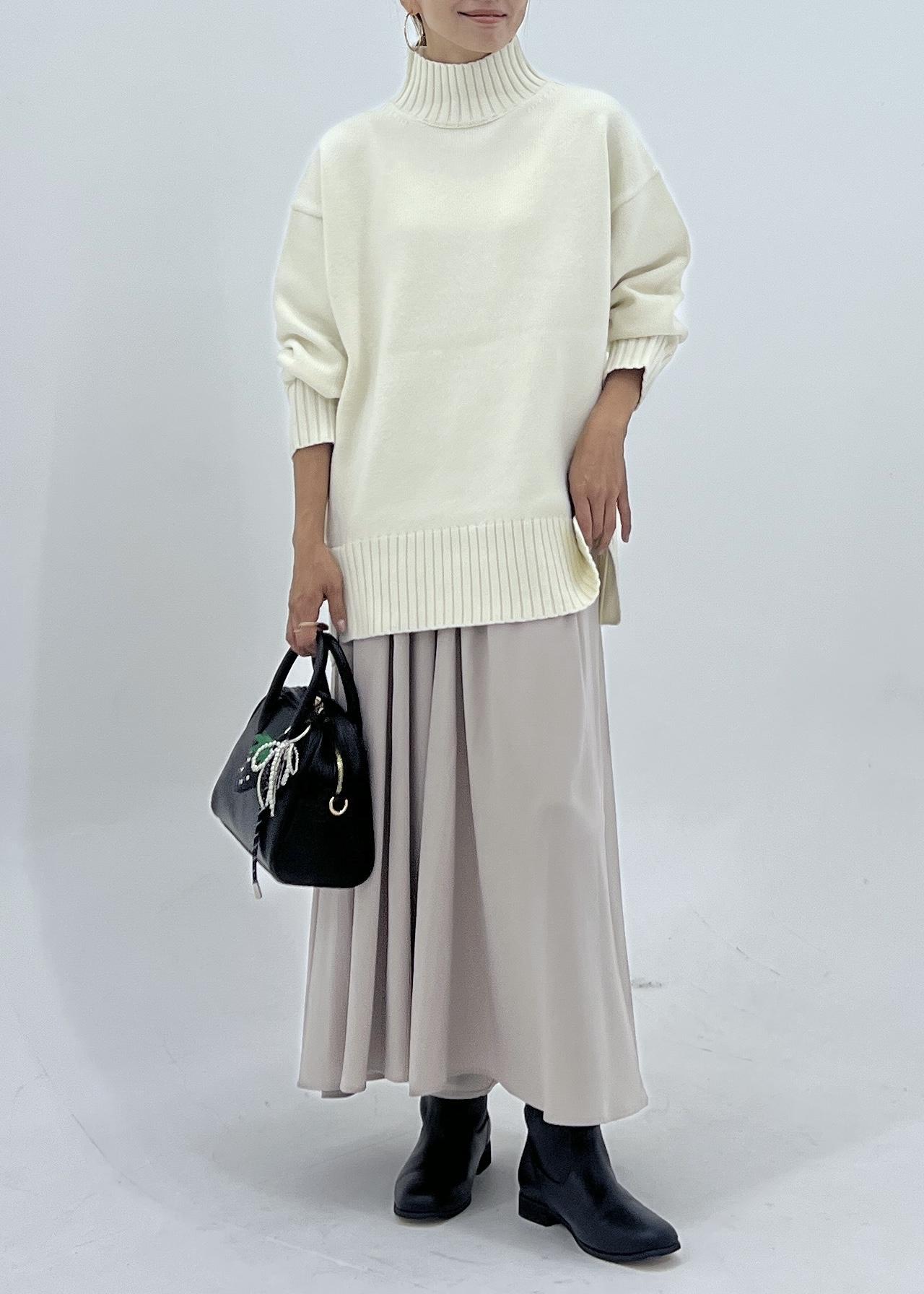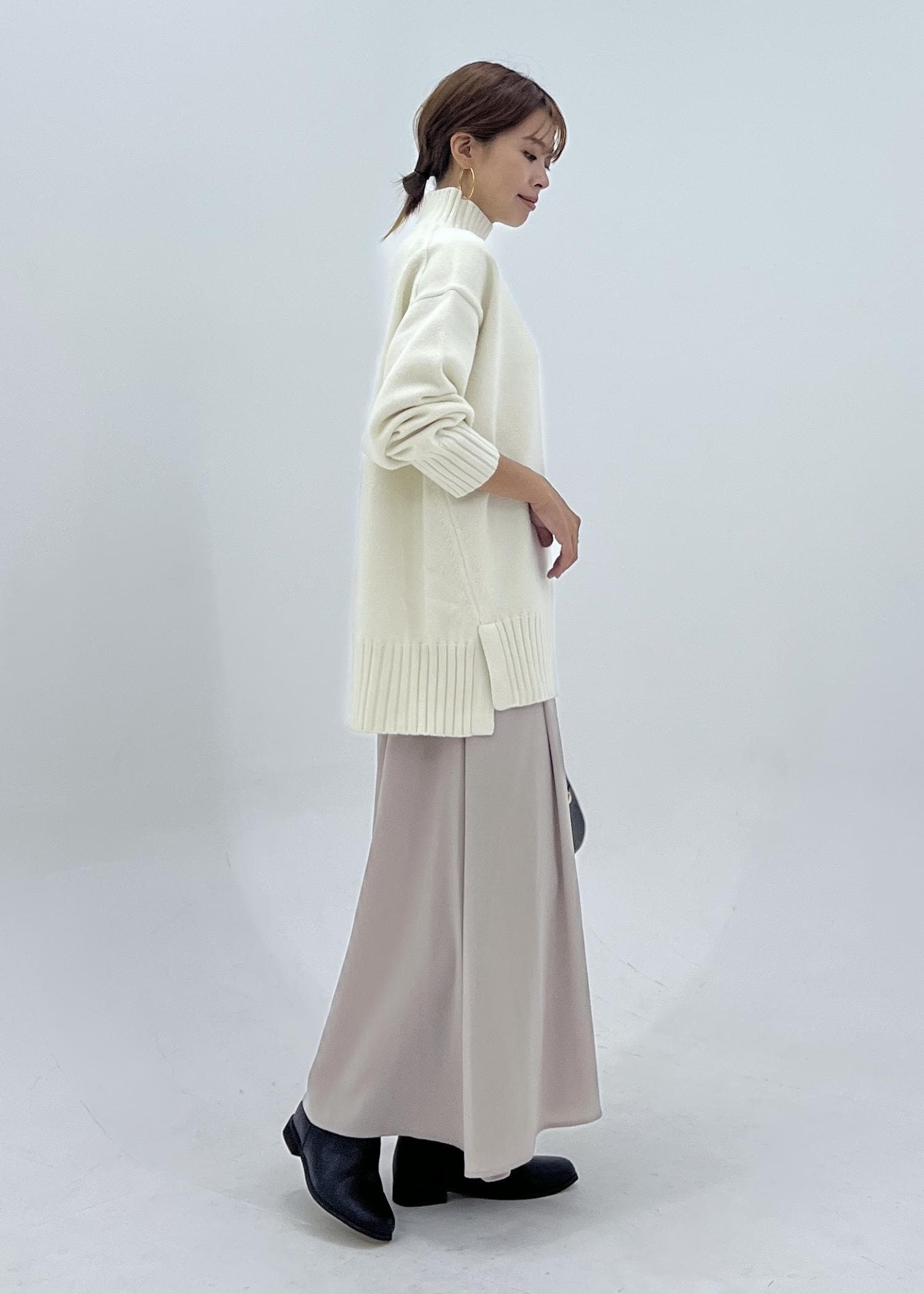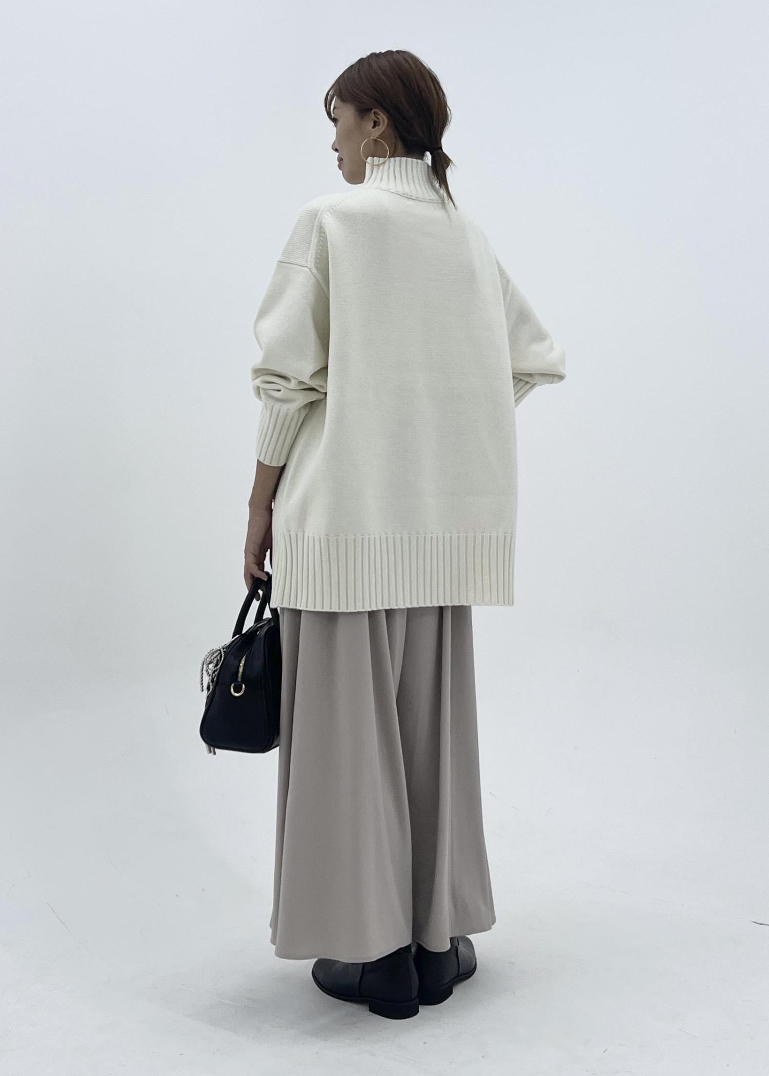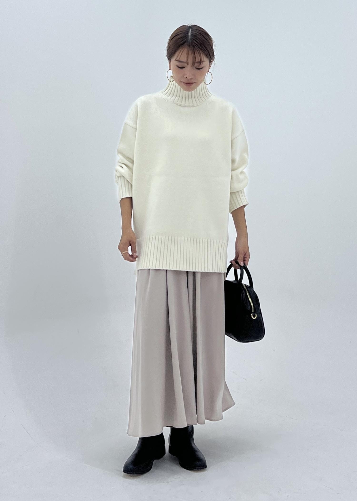 安心感のあるミドル丈のニットは、サラッと柔らかいスカーチョを合わせて大人コーデに。