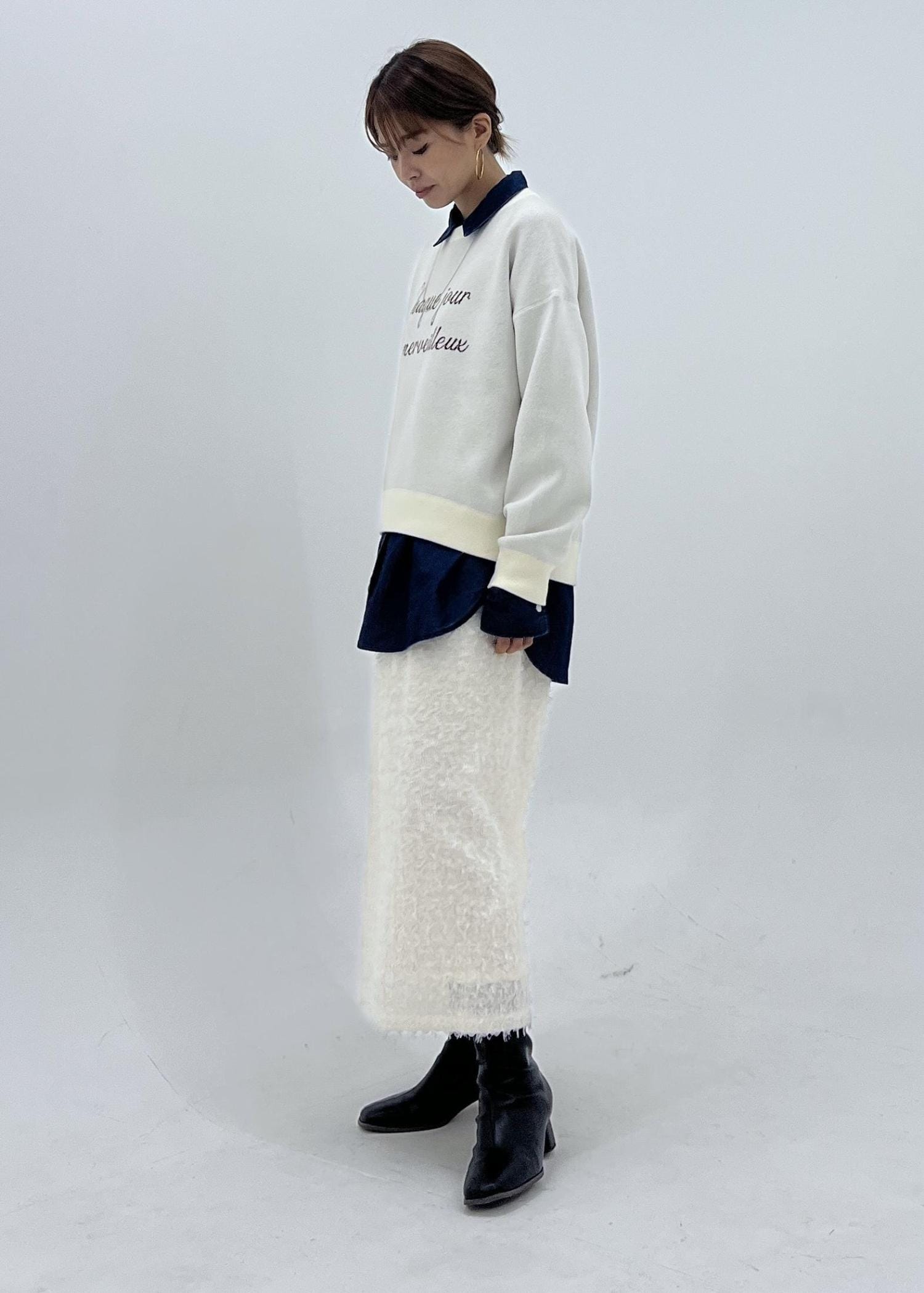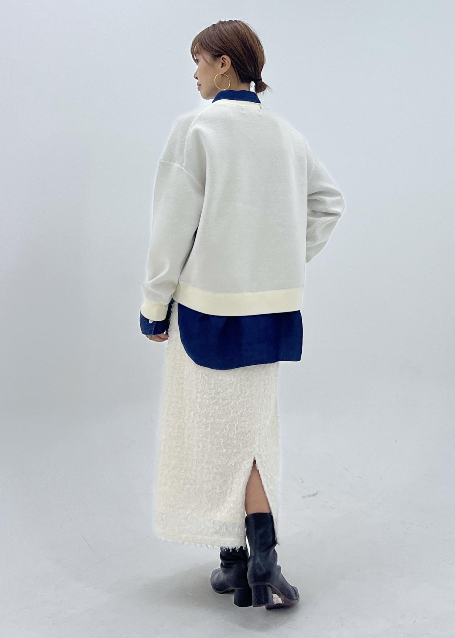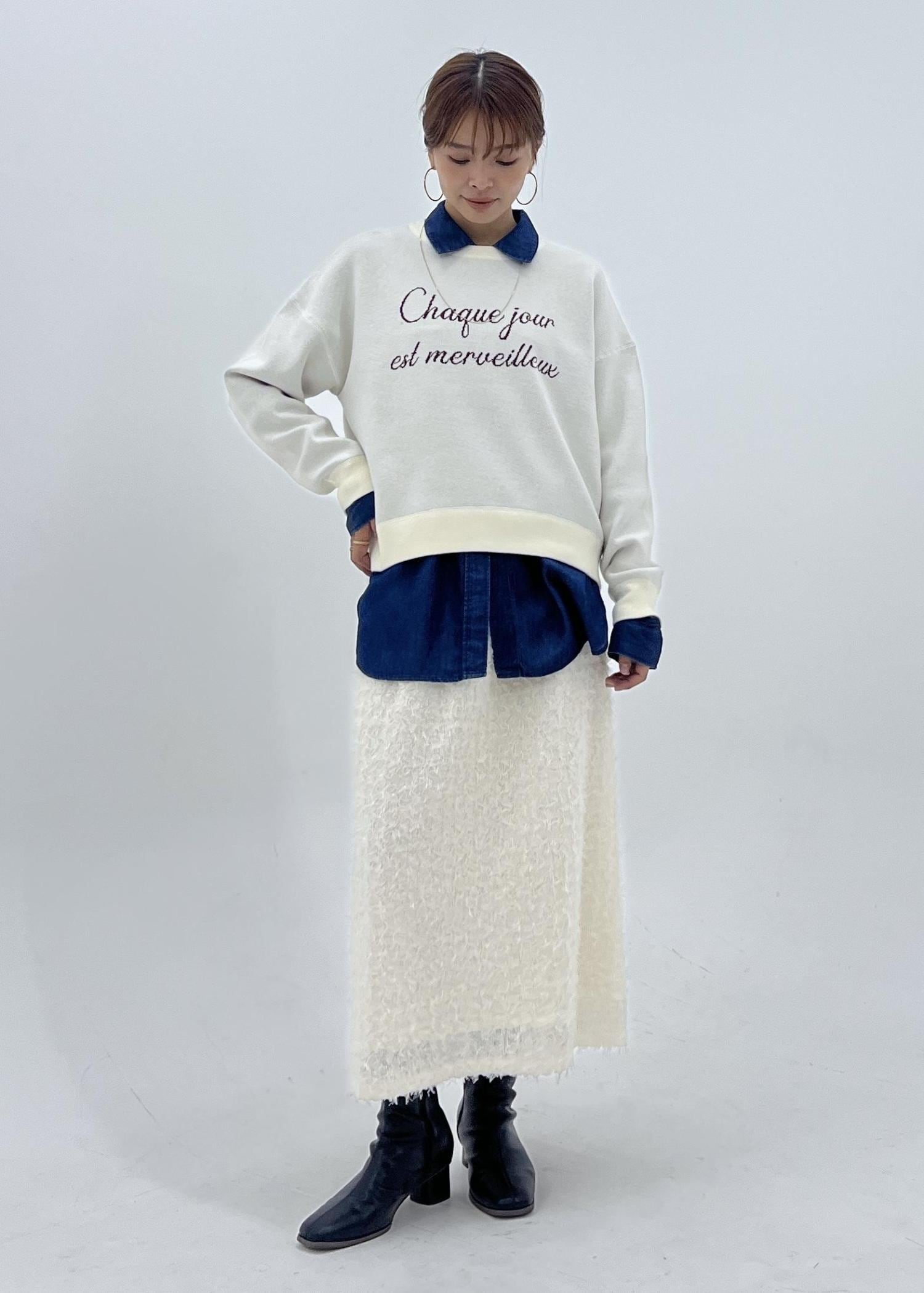 コートインはニット×デニムシャツのレイヤードスタイルにしました。