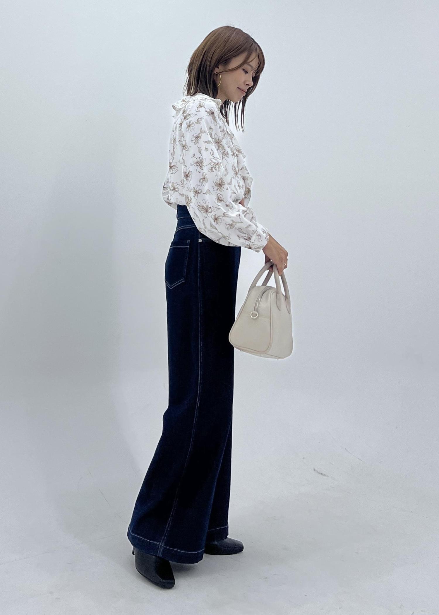 フリルデザインの花柄ブラウスは秋の大人カジュアルコーデにおすすめ。