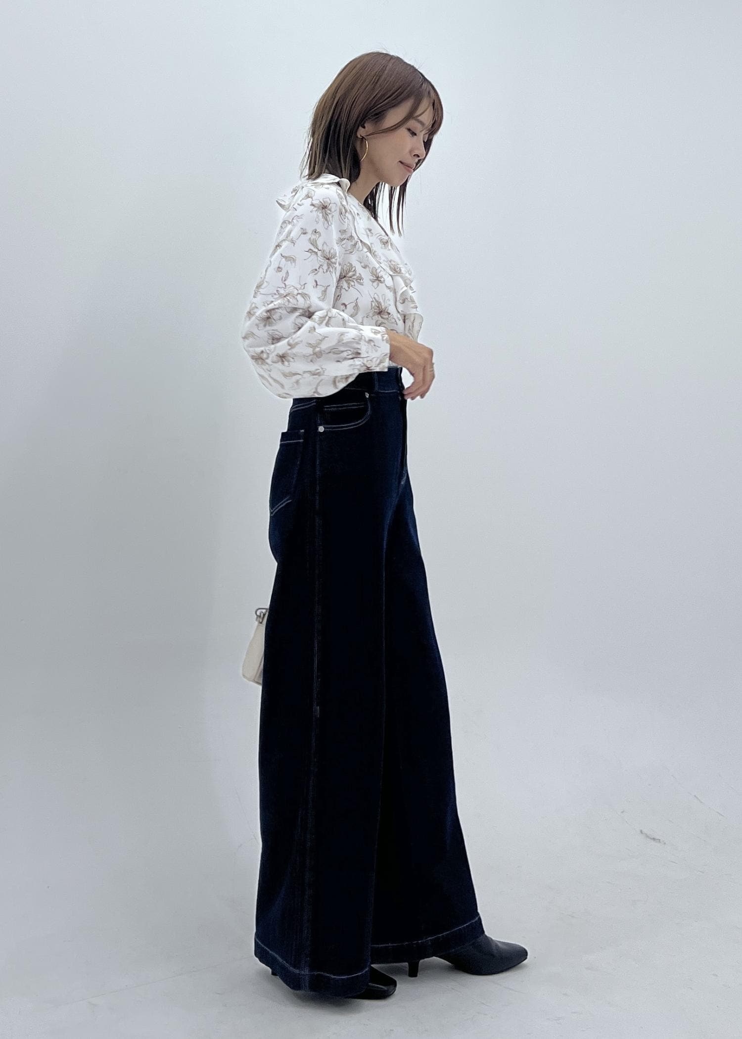 甘くなりすぎないようにハイウエストのデニムパンツを合わせて、秋のお出かけスタイルにしました。