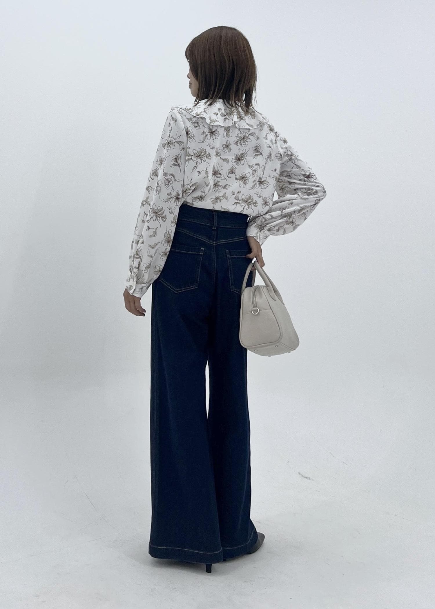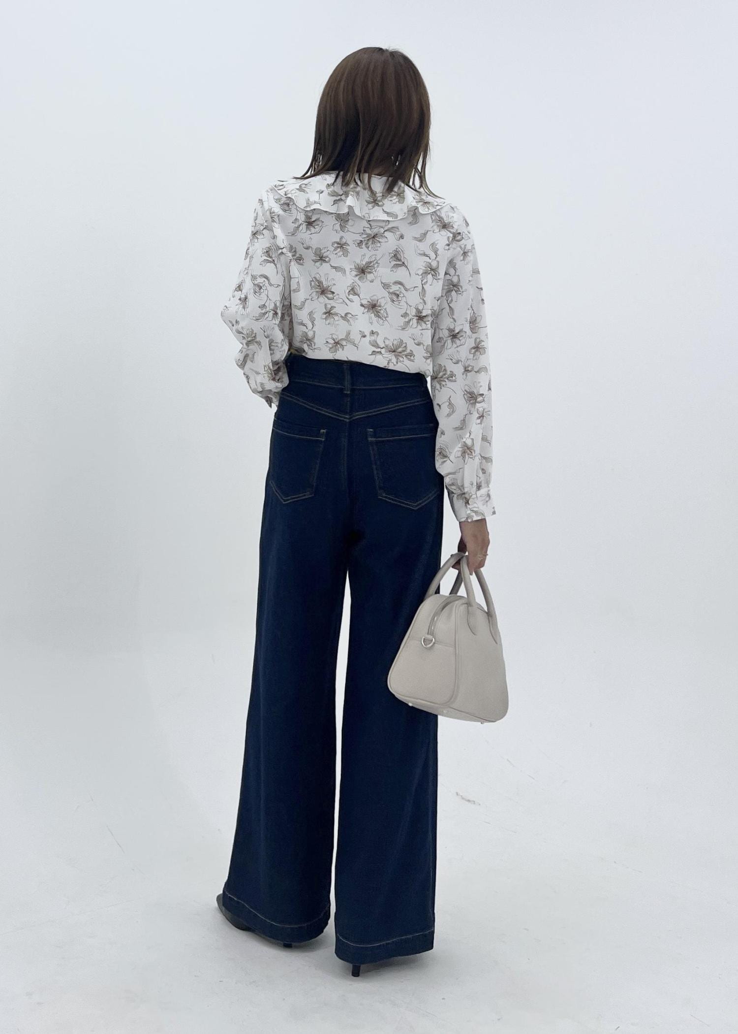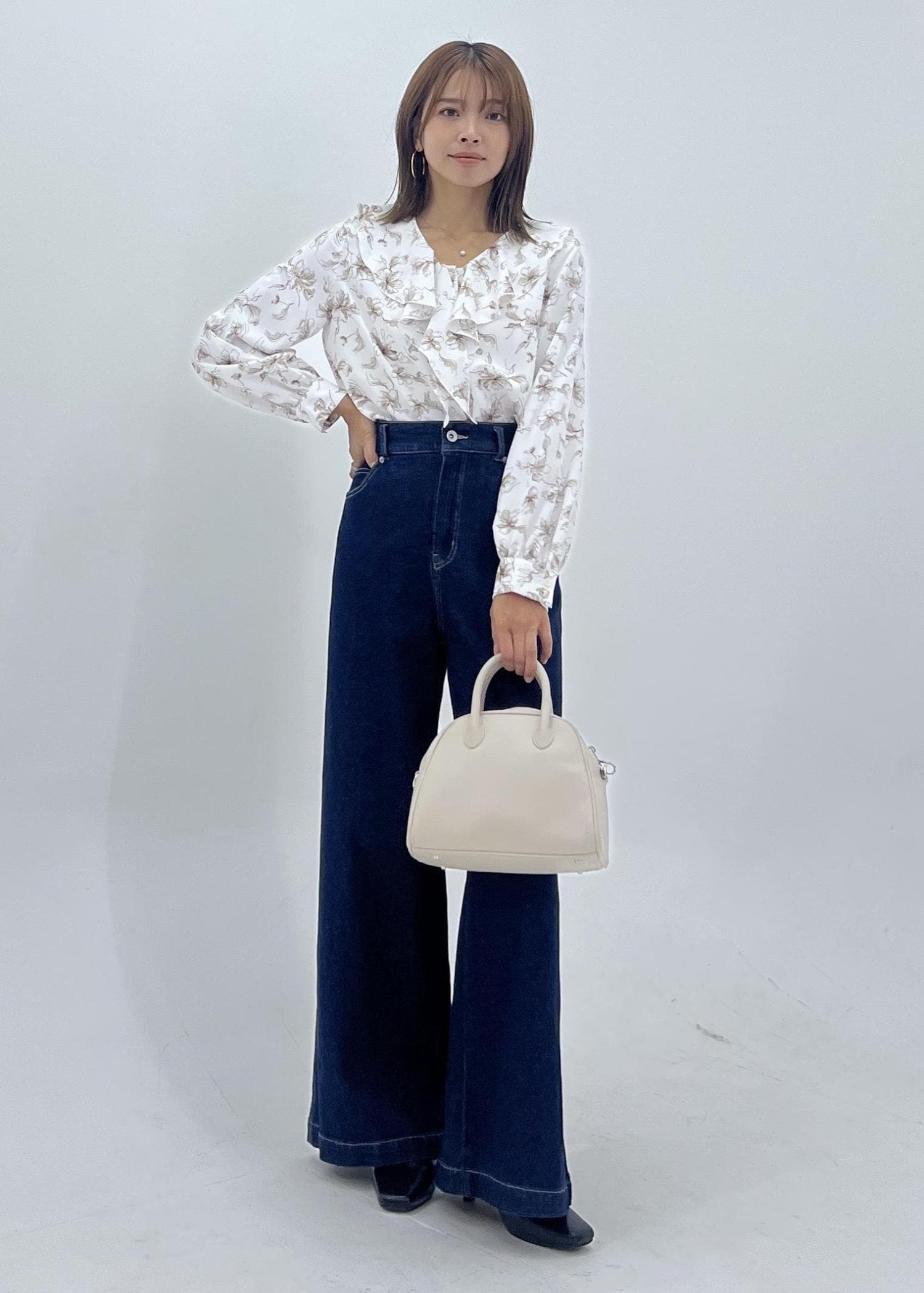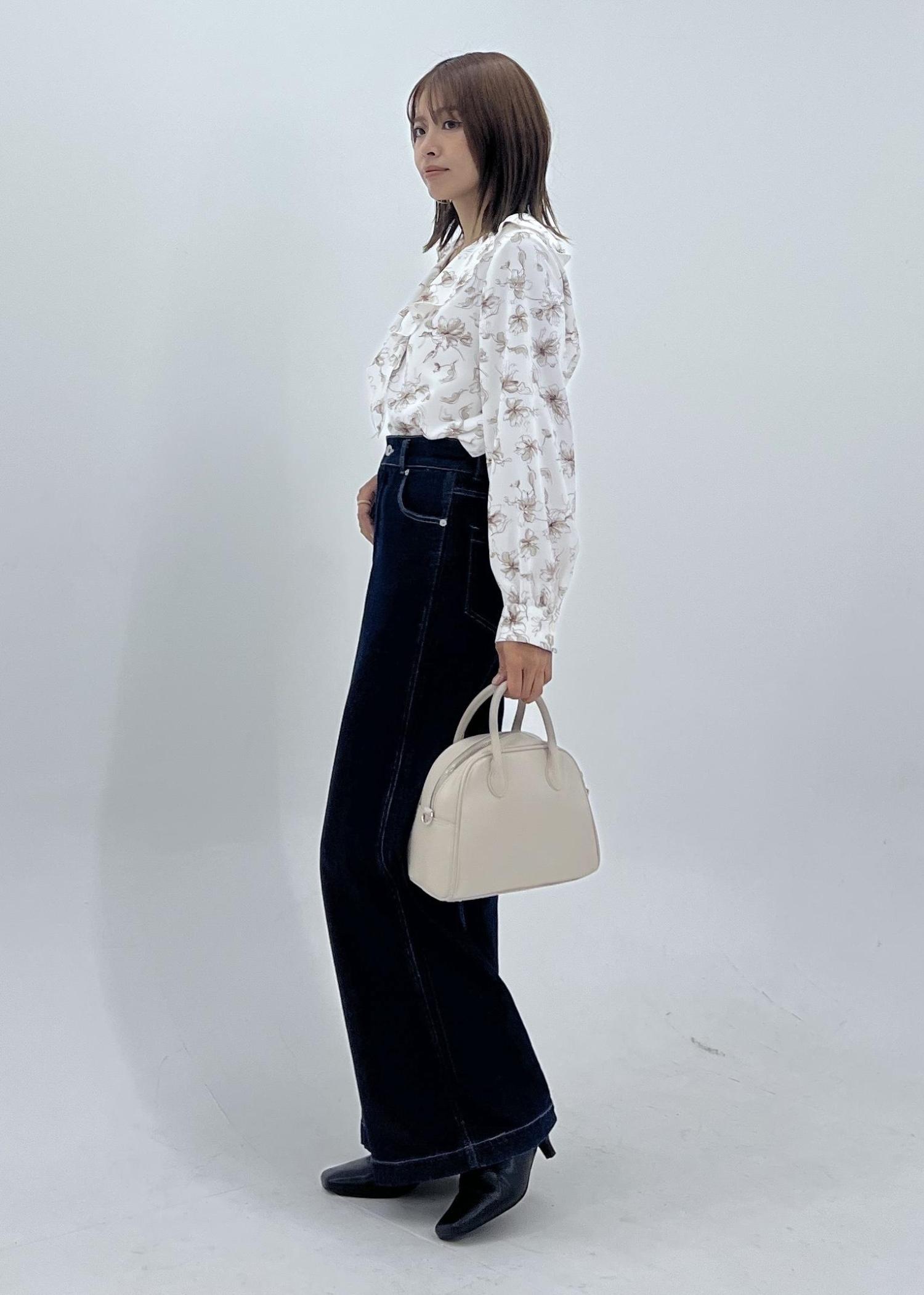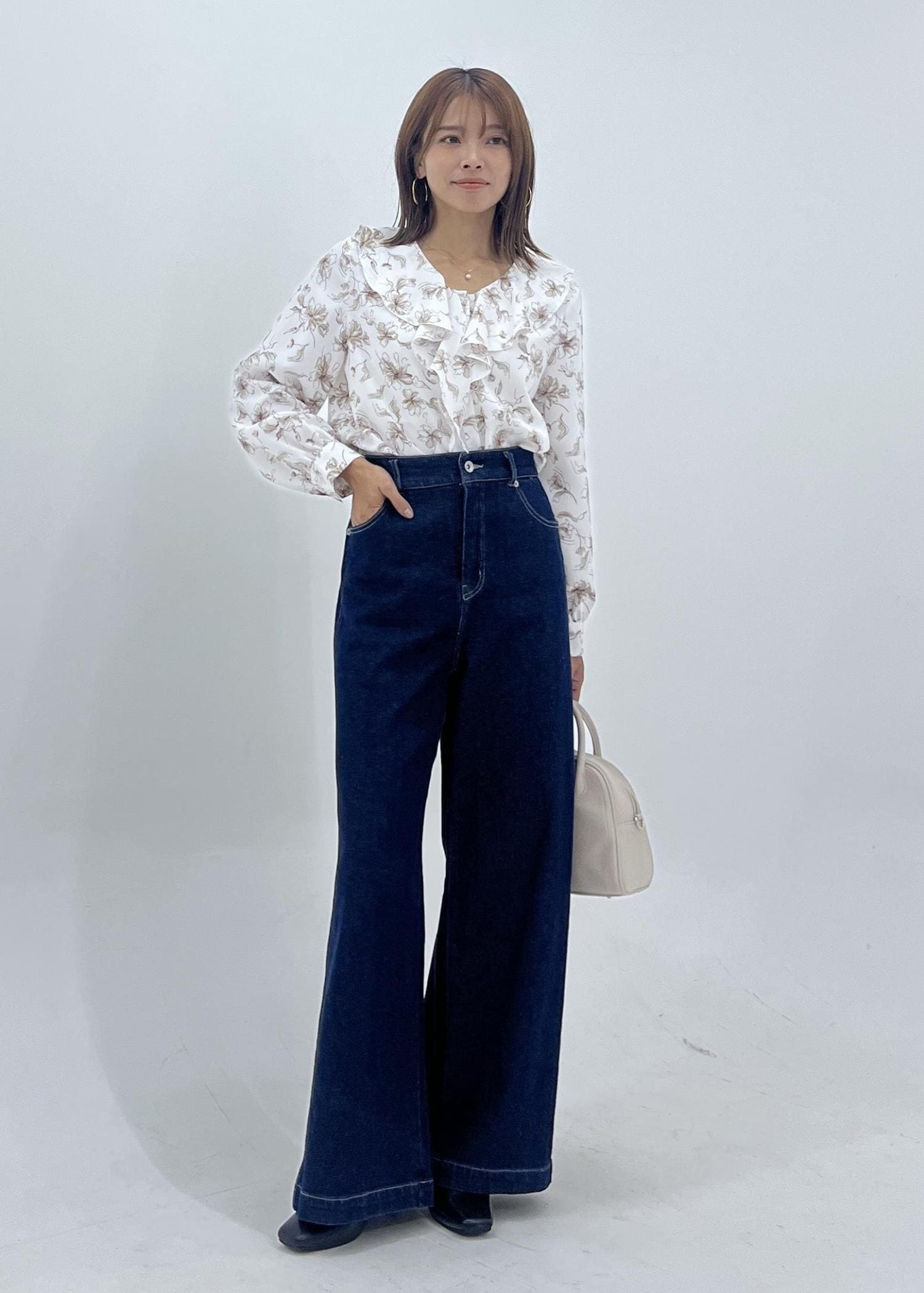花柄ブラウスのデニム秋コーデ