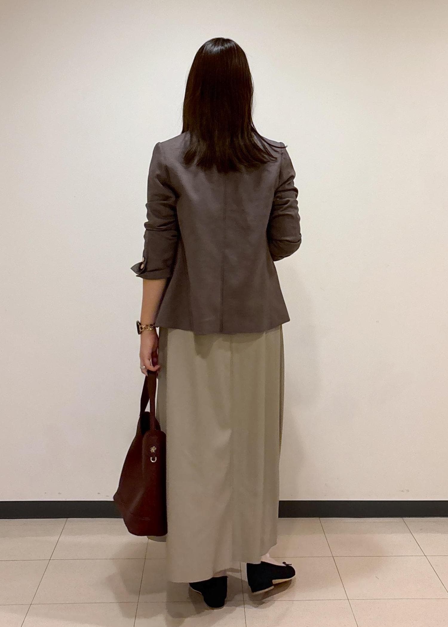 素材感の違うベージュ合わせで秋見えするコーデ。
