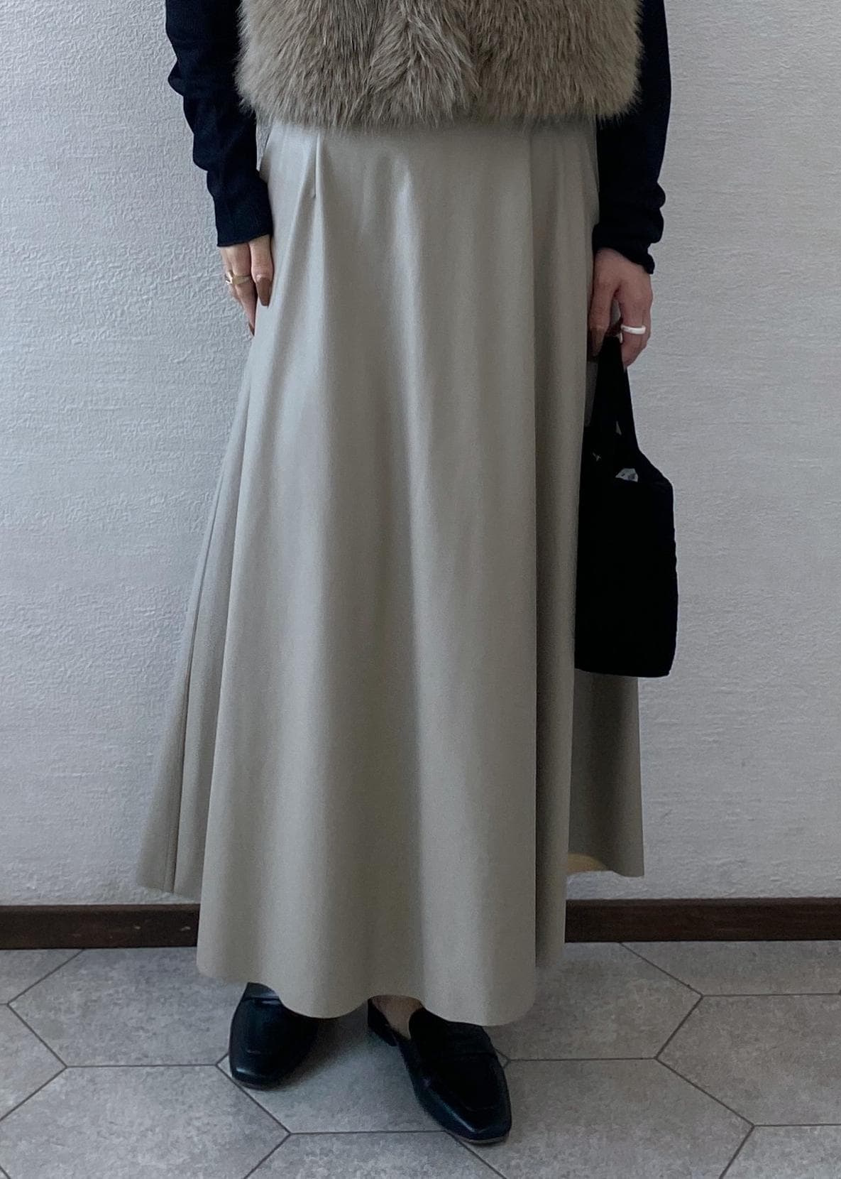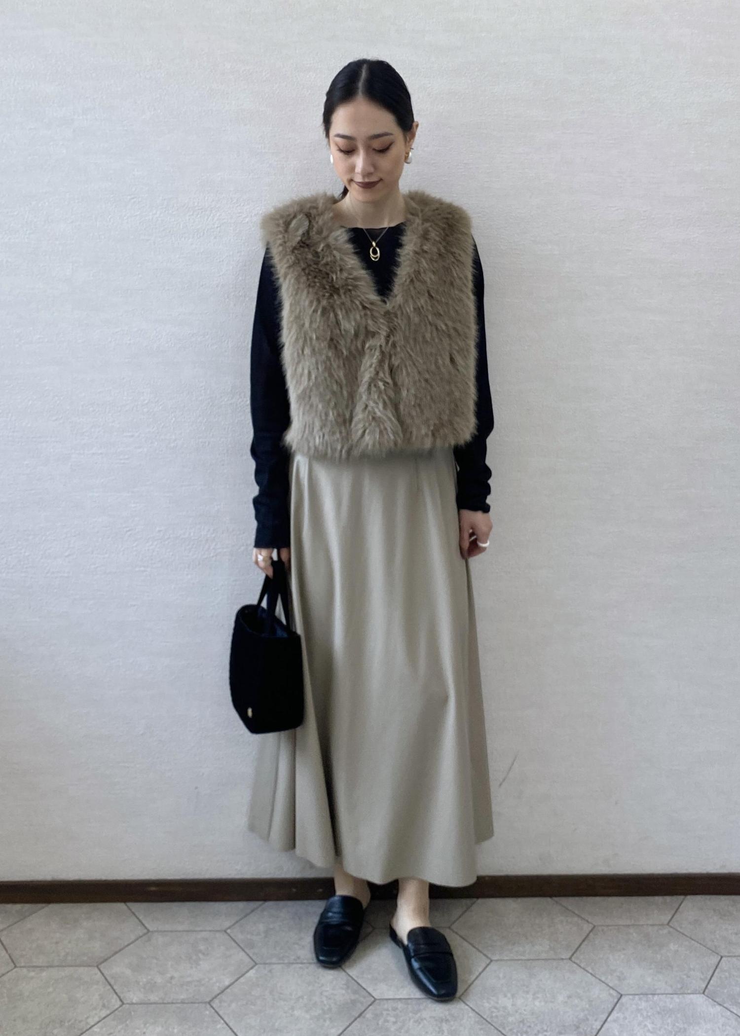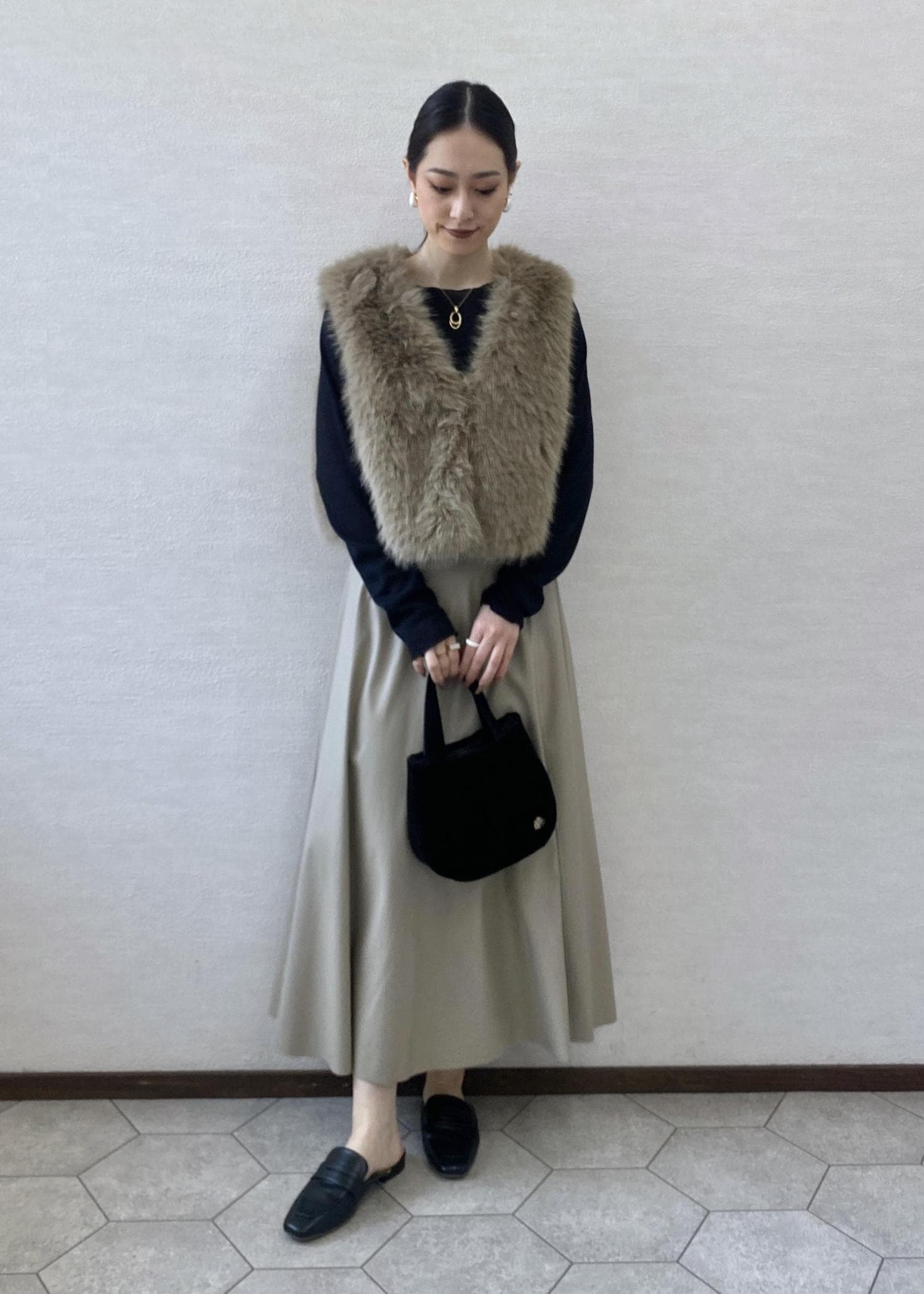 秋の始まりに取り入れたいファーベストとシンセティックレザーを用いたフレアスカートを合わせた秋のお出かけにぴったりなコーディネートです。
