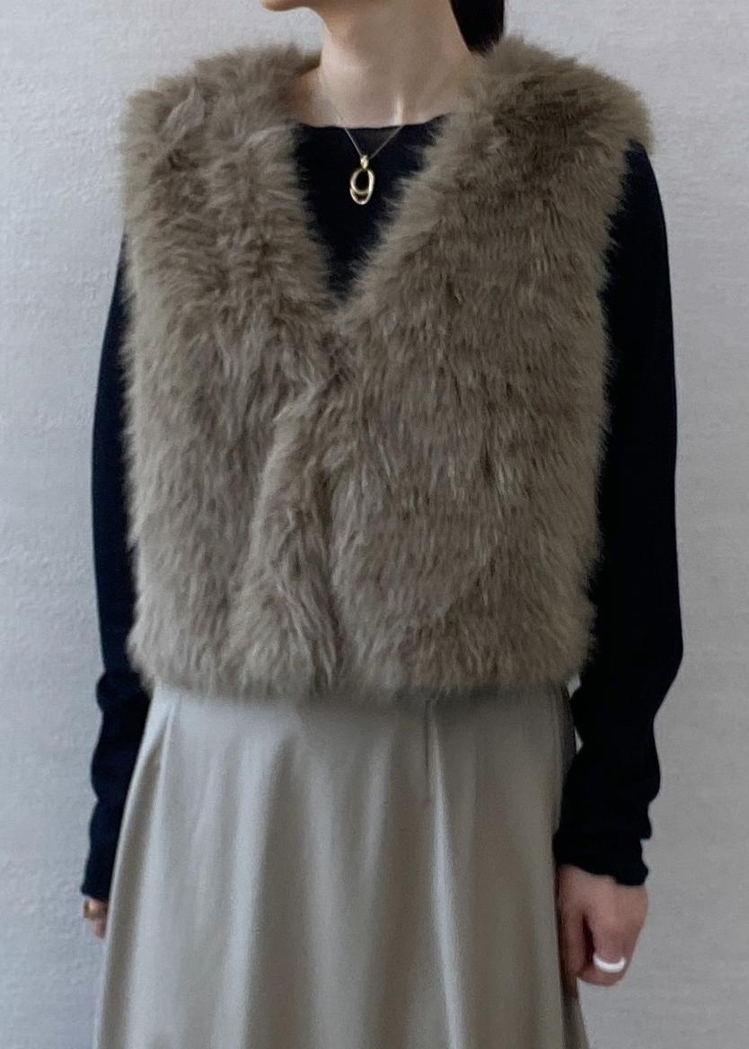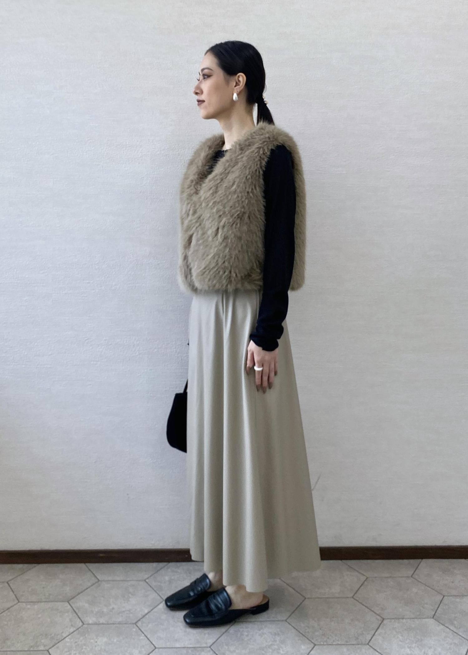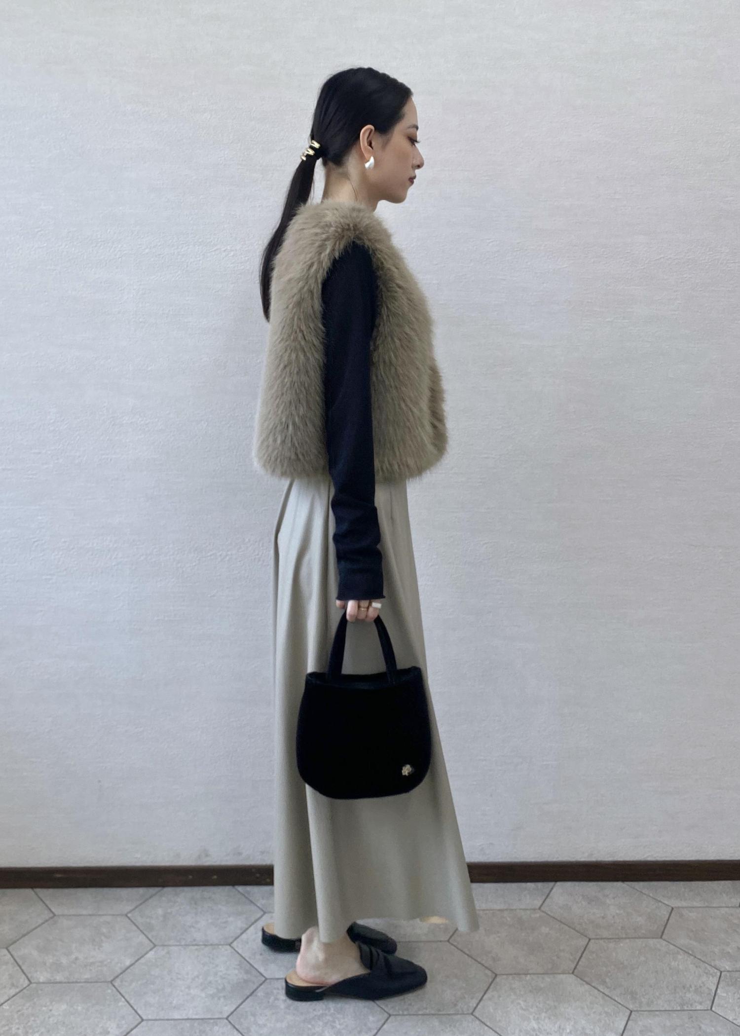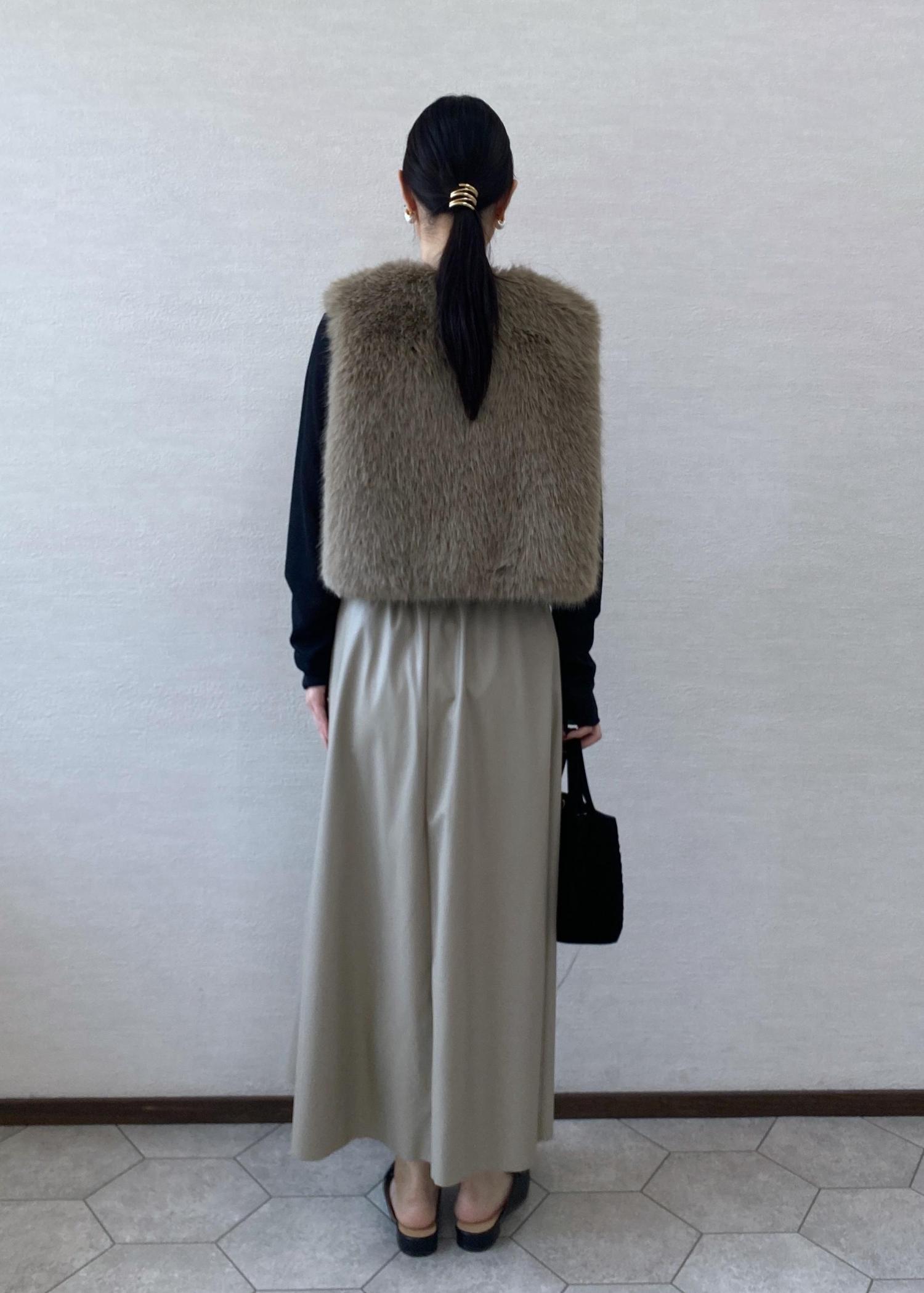 秋の始まりに取り入れたいファーベストとシンセティックレザーを用いたフレアスカートを合わせた秋のお出かけにぴったりなコーディネートです。