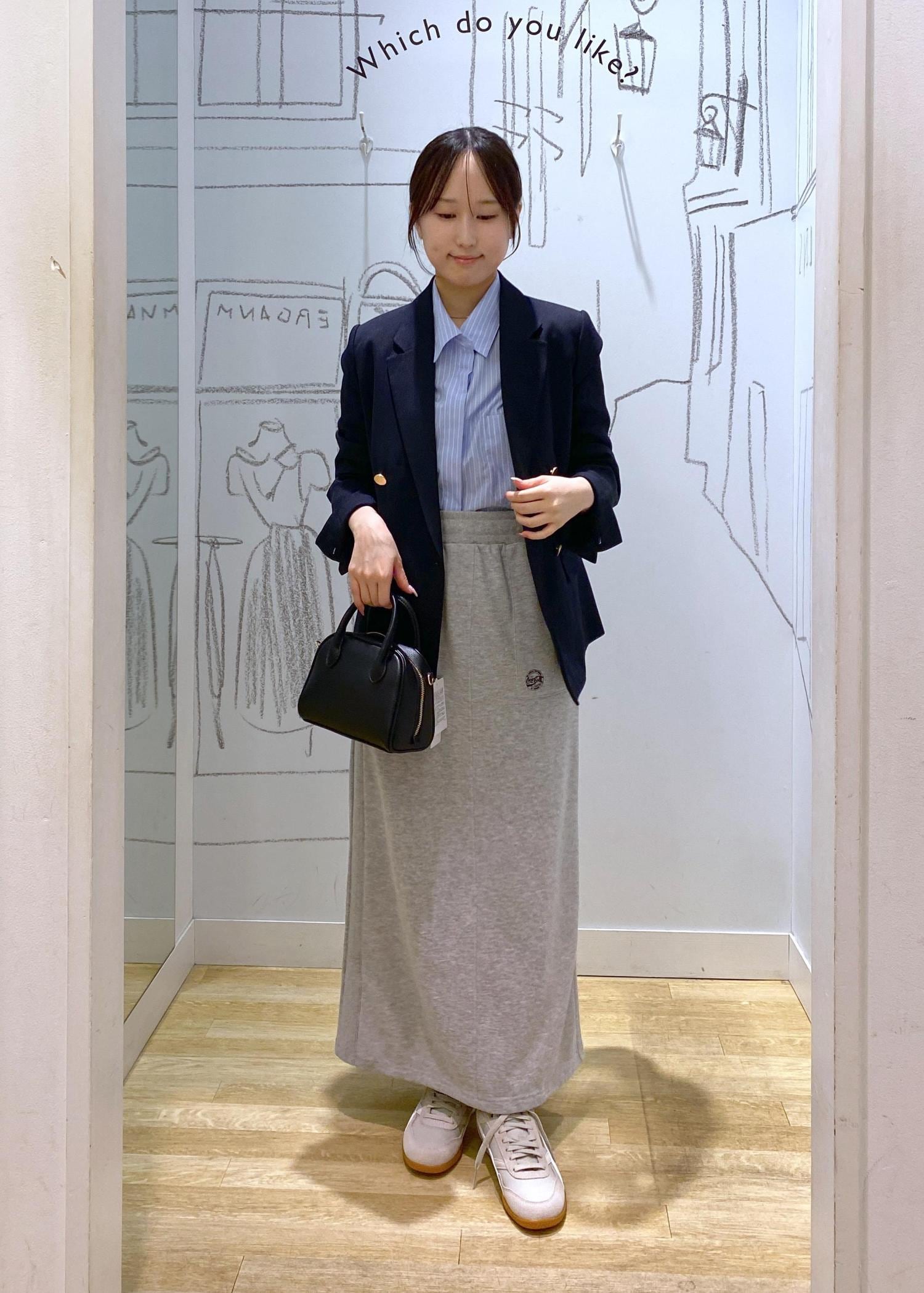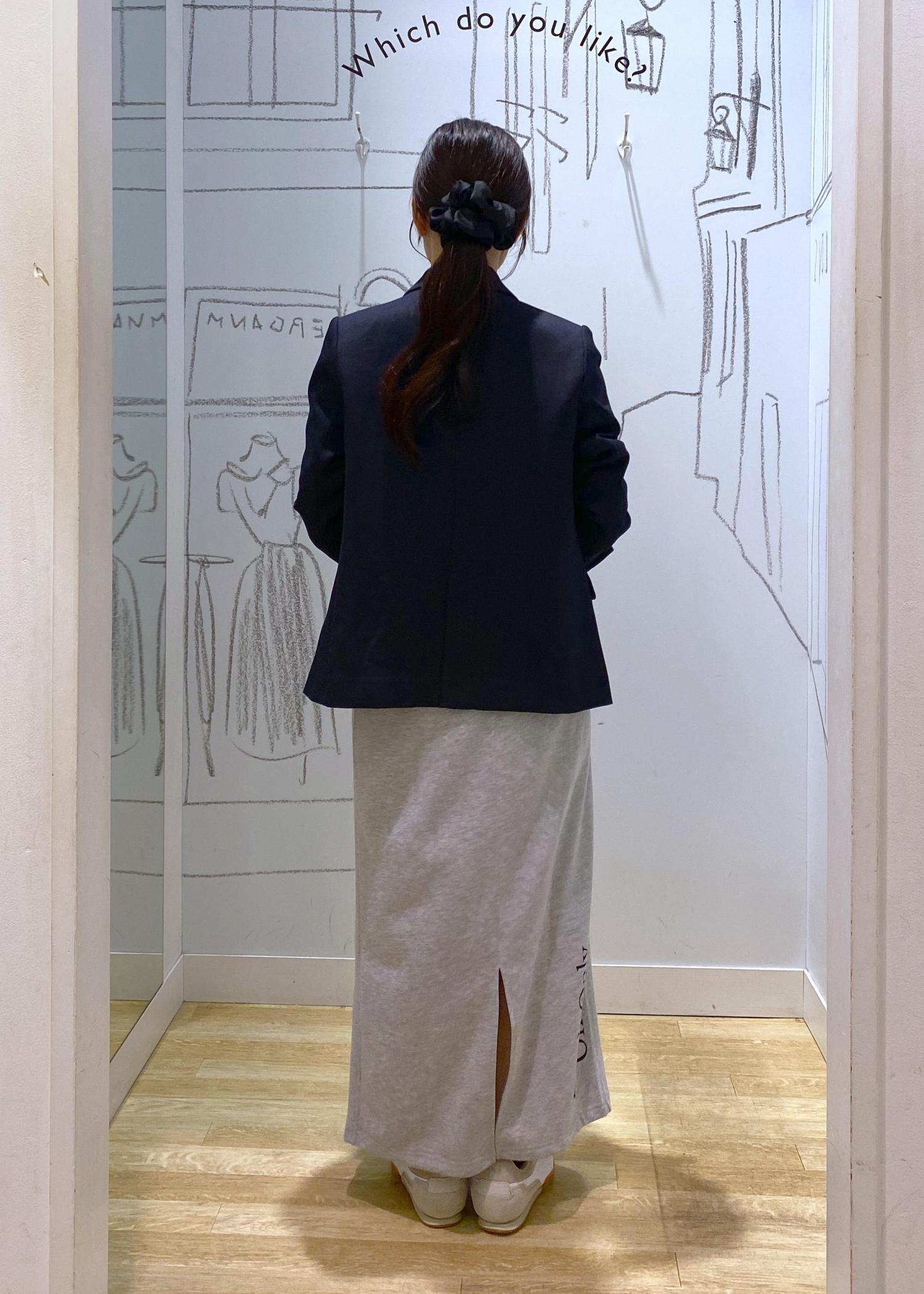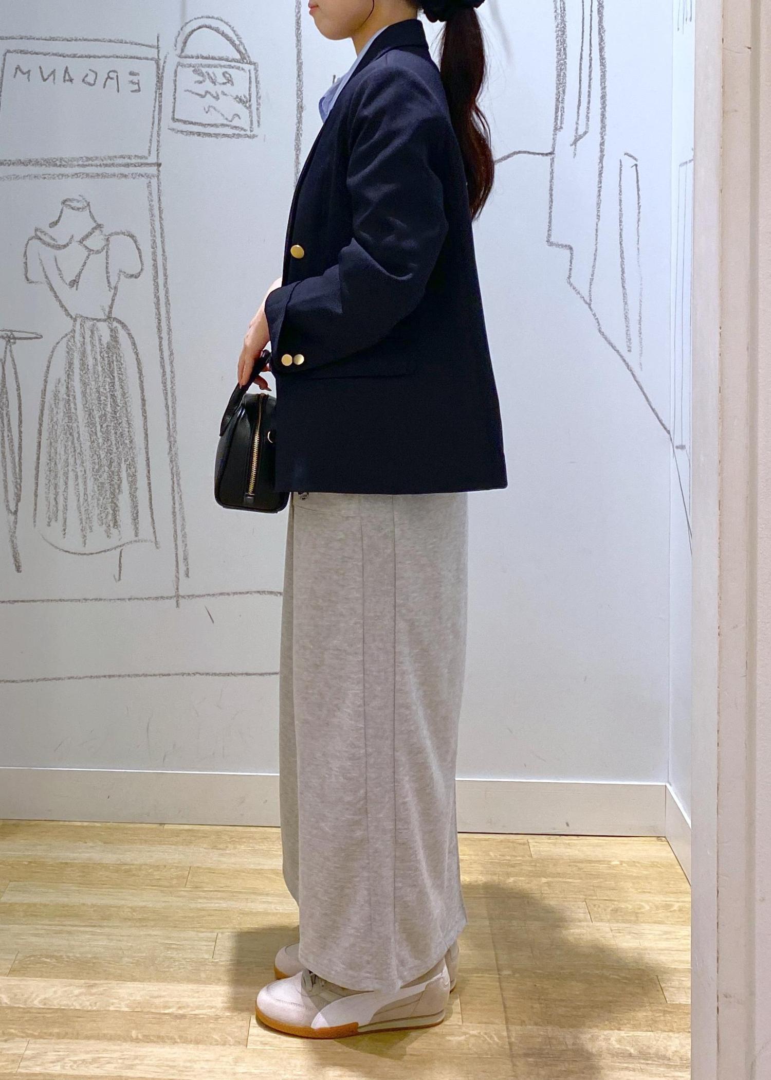 カチッと感が出やすいネイビージャケットにあえてスウェットスカートと合わせることでほどよい抜け感が出せます◎