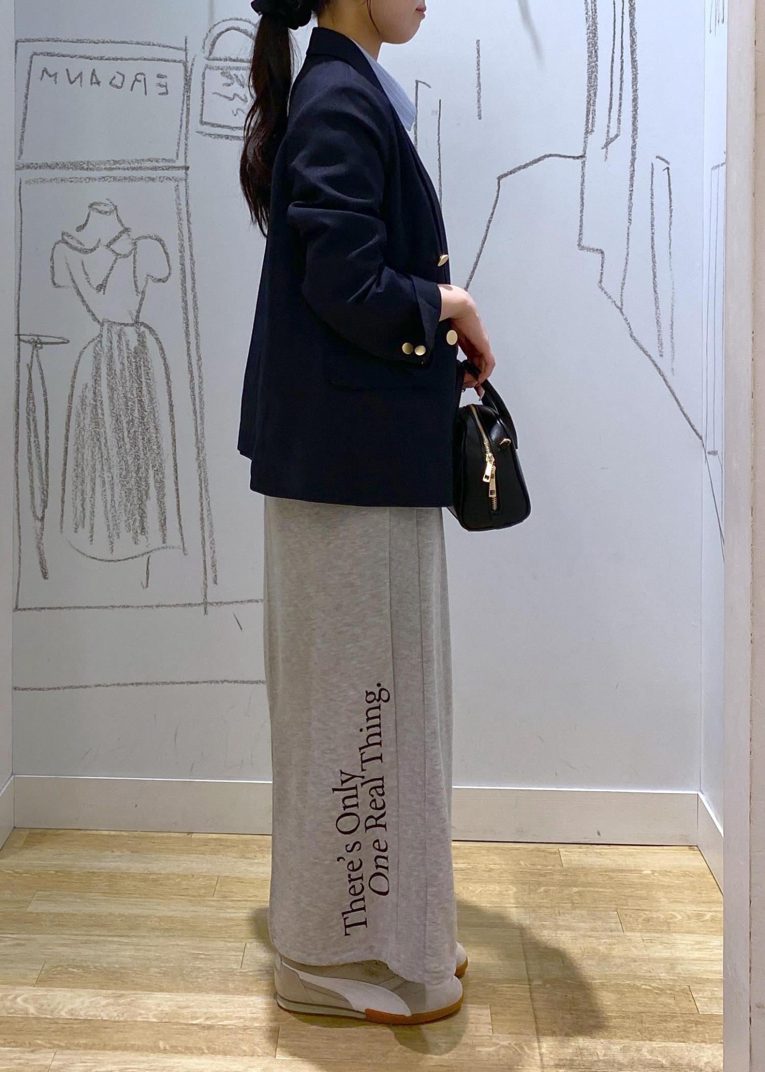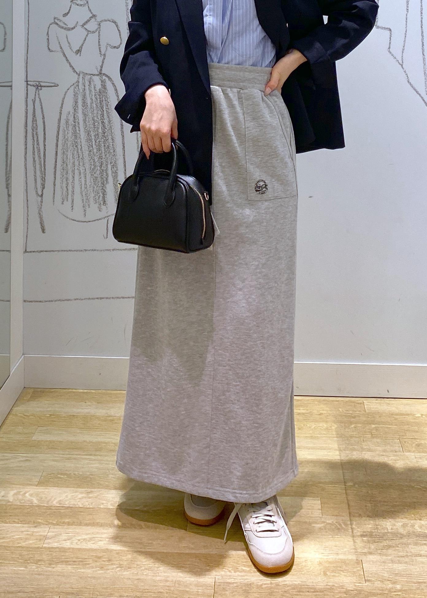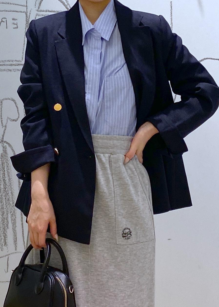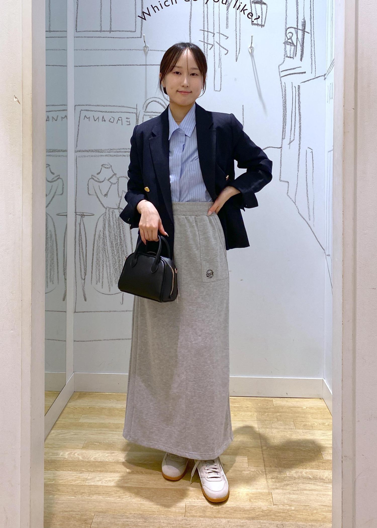 カチッと感が出やすいネイビージャケットにあえてスウェットスカートと合わせることでほどよい抜け感が出せます◎