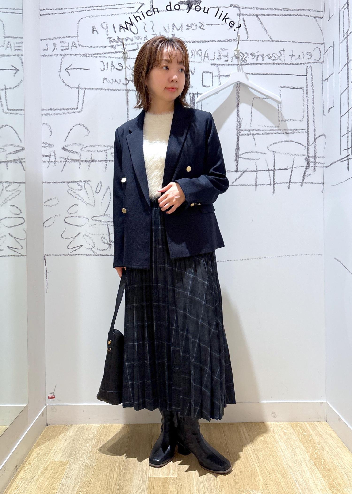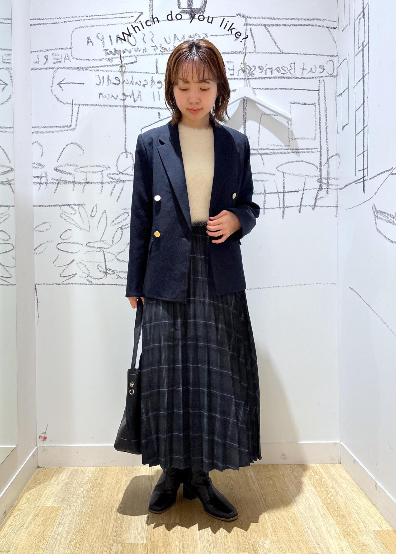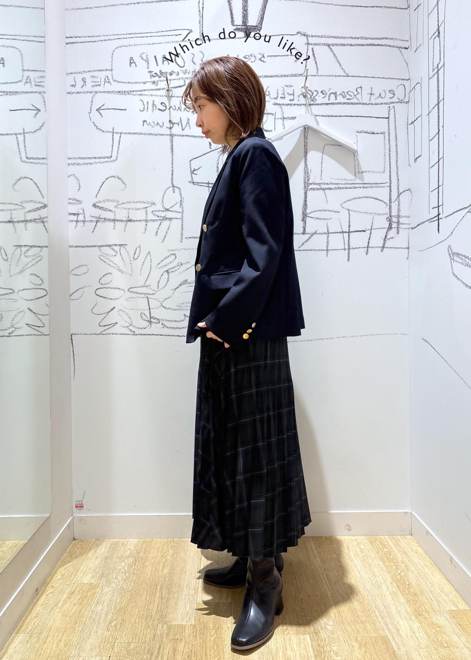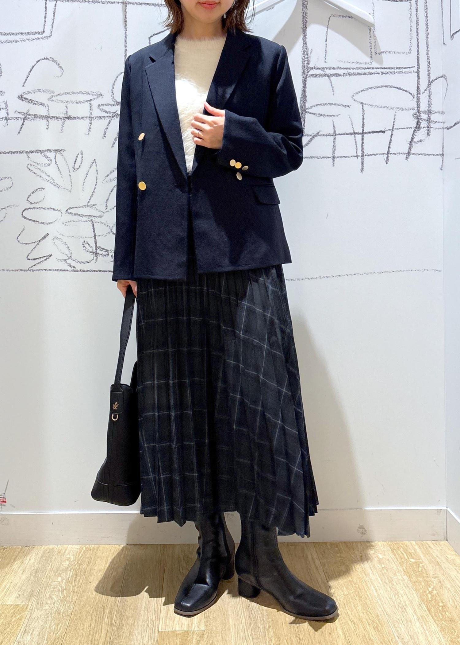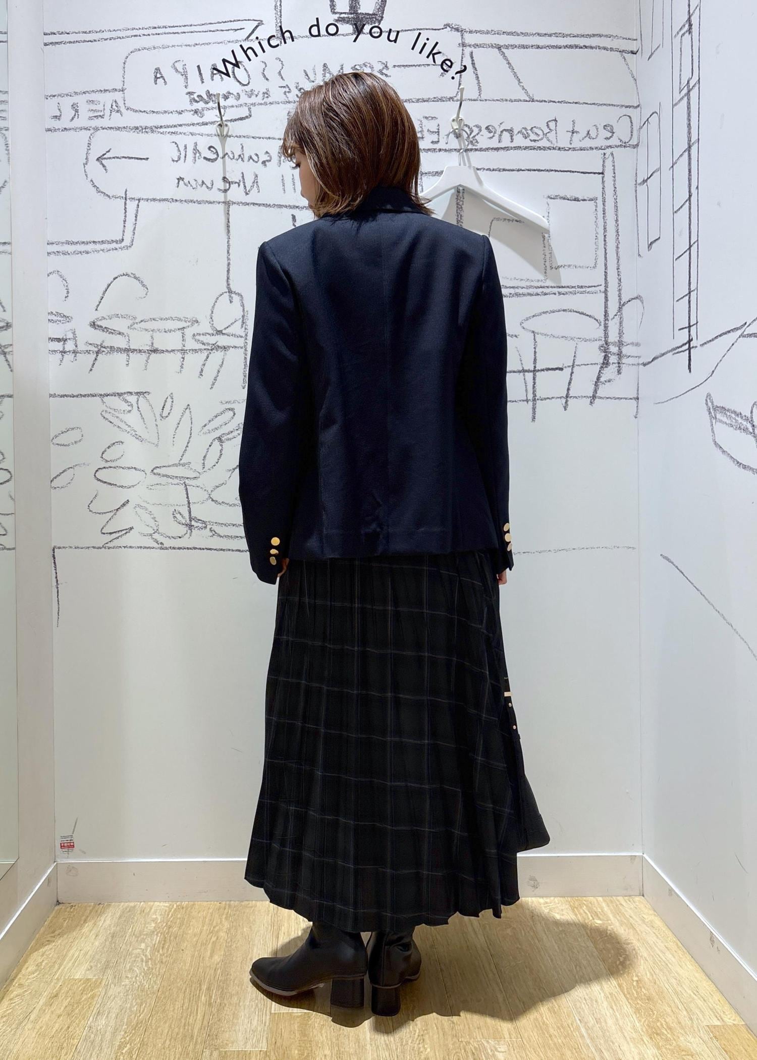ジャケットにチェックスカートを合わせ秋らしいコーディネートに仕上げました。