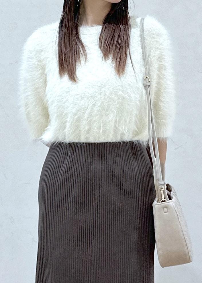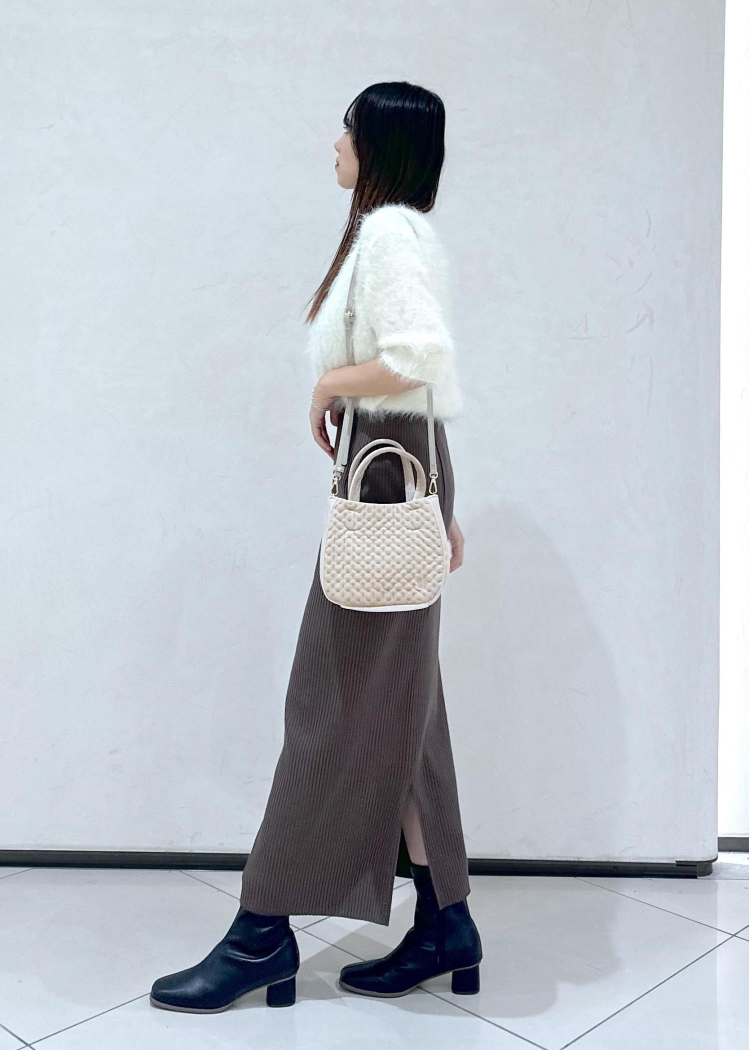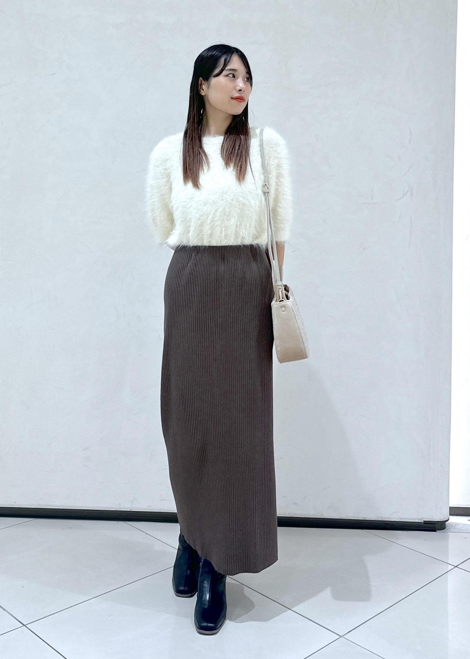 ふわふわのニット素材×ブラウンスカートで秋を意識しつつショートブーツで冬の始まりも意識させる、先取りスタイリングです♪