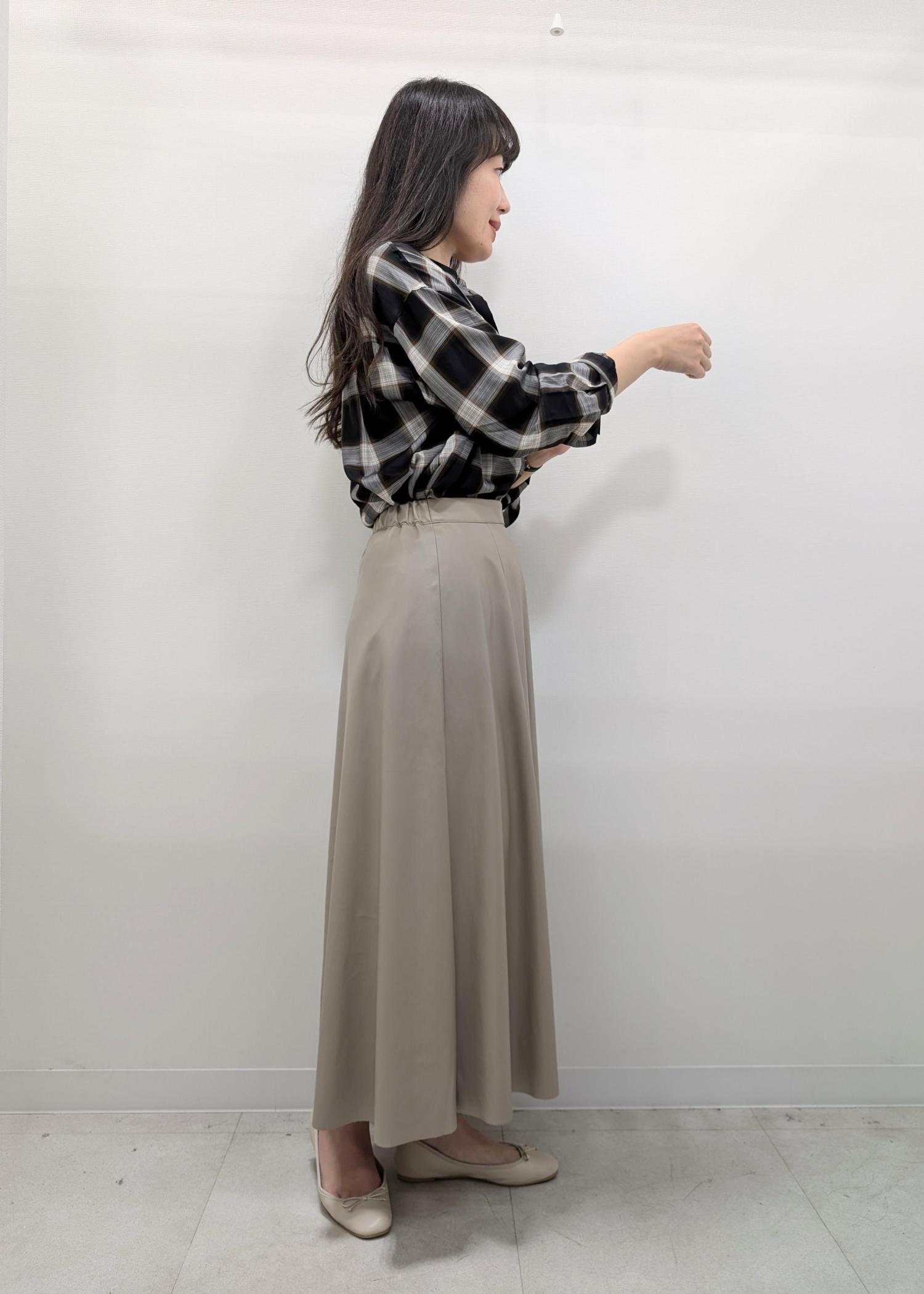 ウエストは後ろゴムなので見た目よりも履きやすいです。フレアスカートなので、ヒップから太ももにかけてのシルエットも出ない点も◎ -