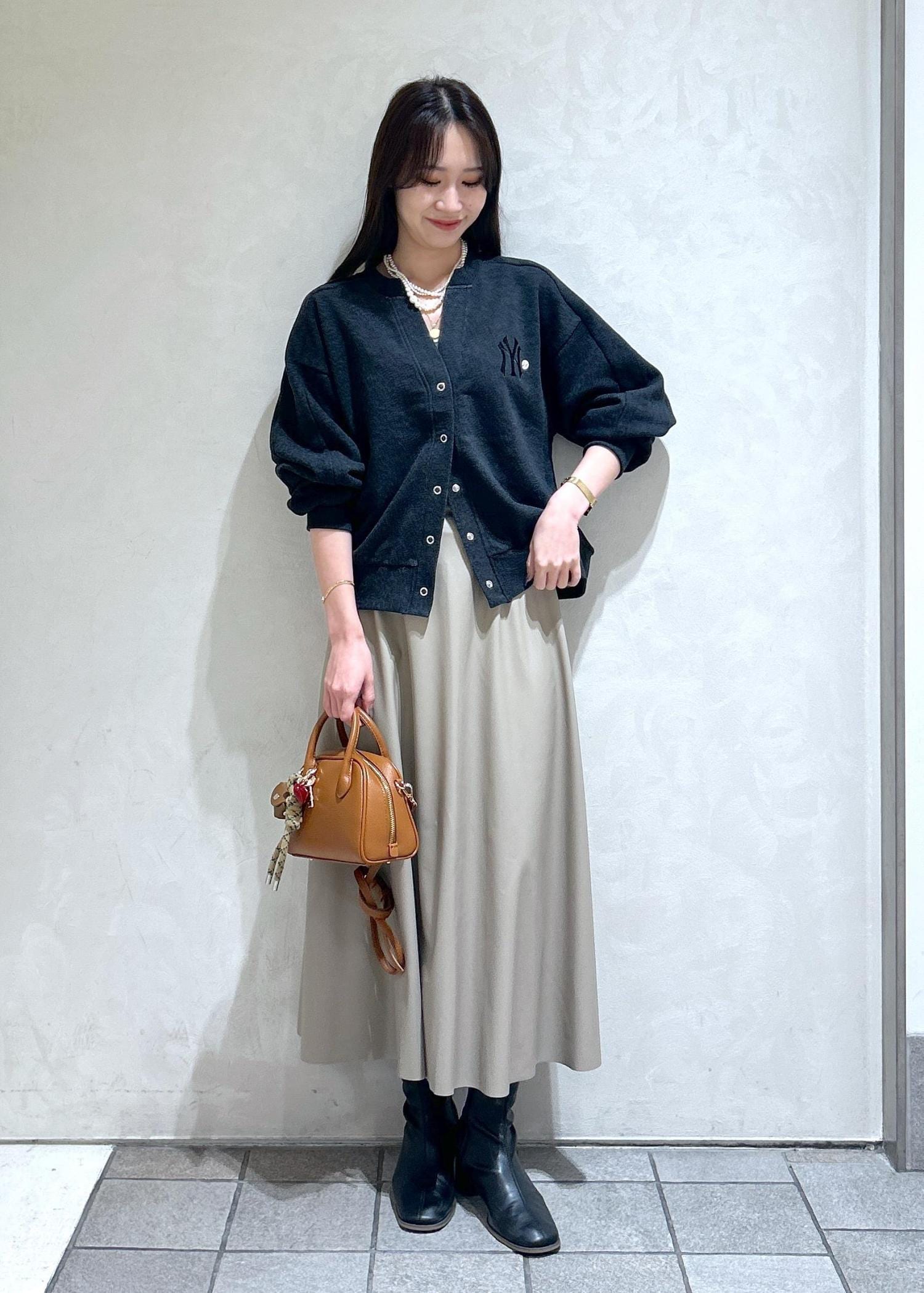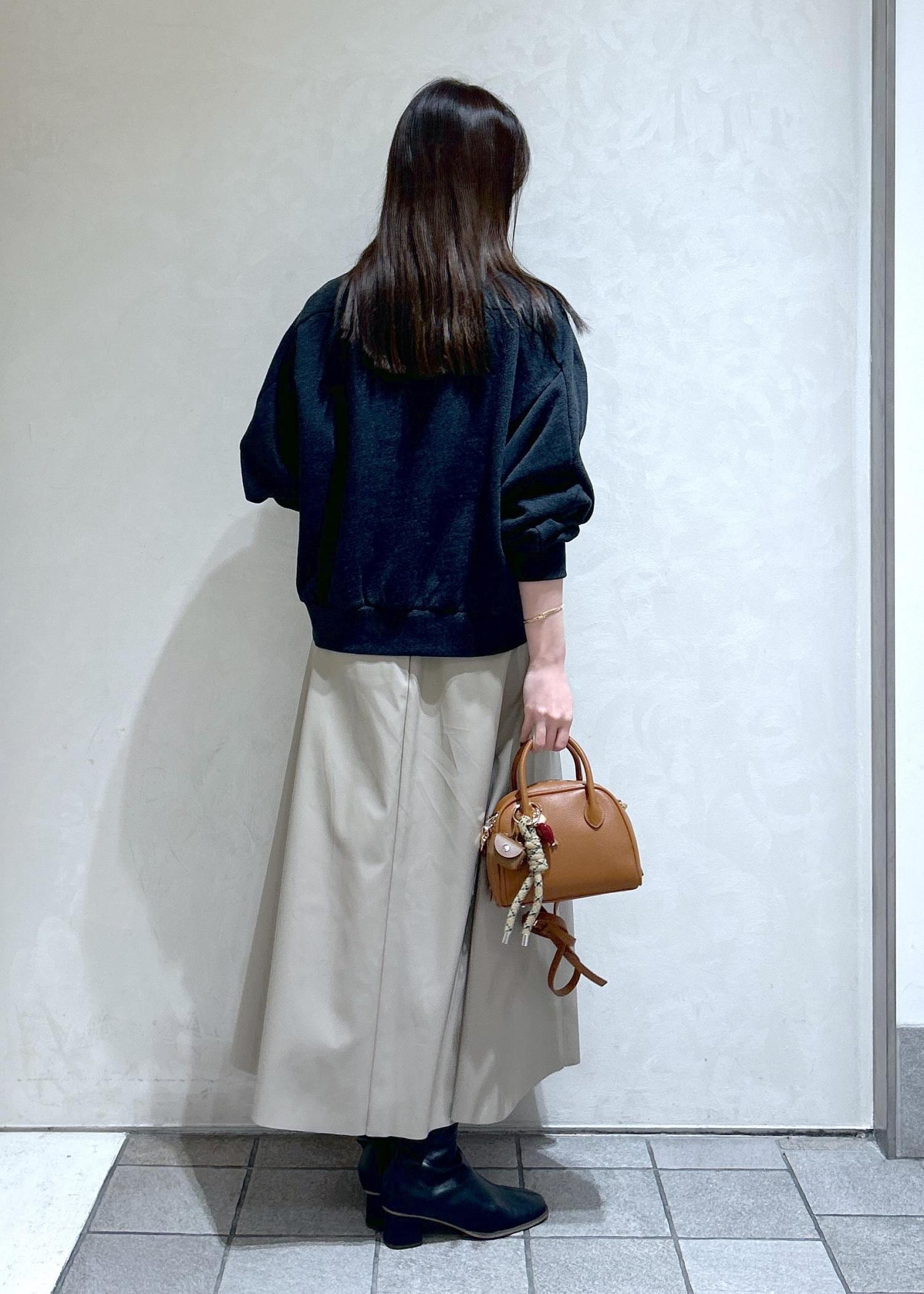 スウェットカーディガンに、レザースカートでキレイめカジュアルな秋タイリングにしました。