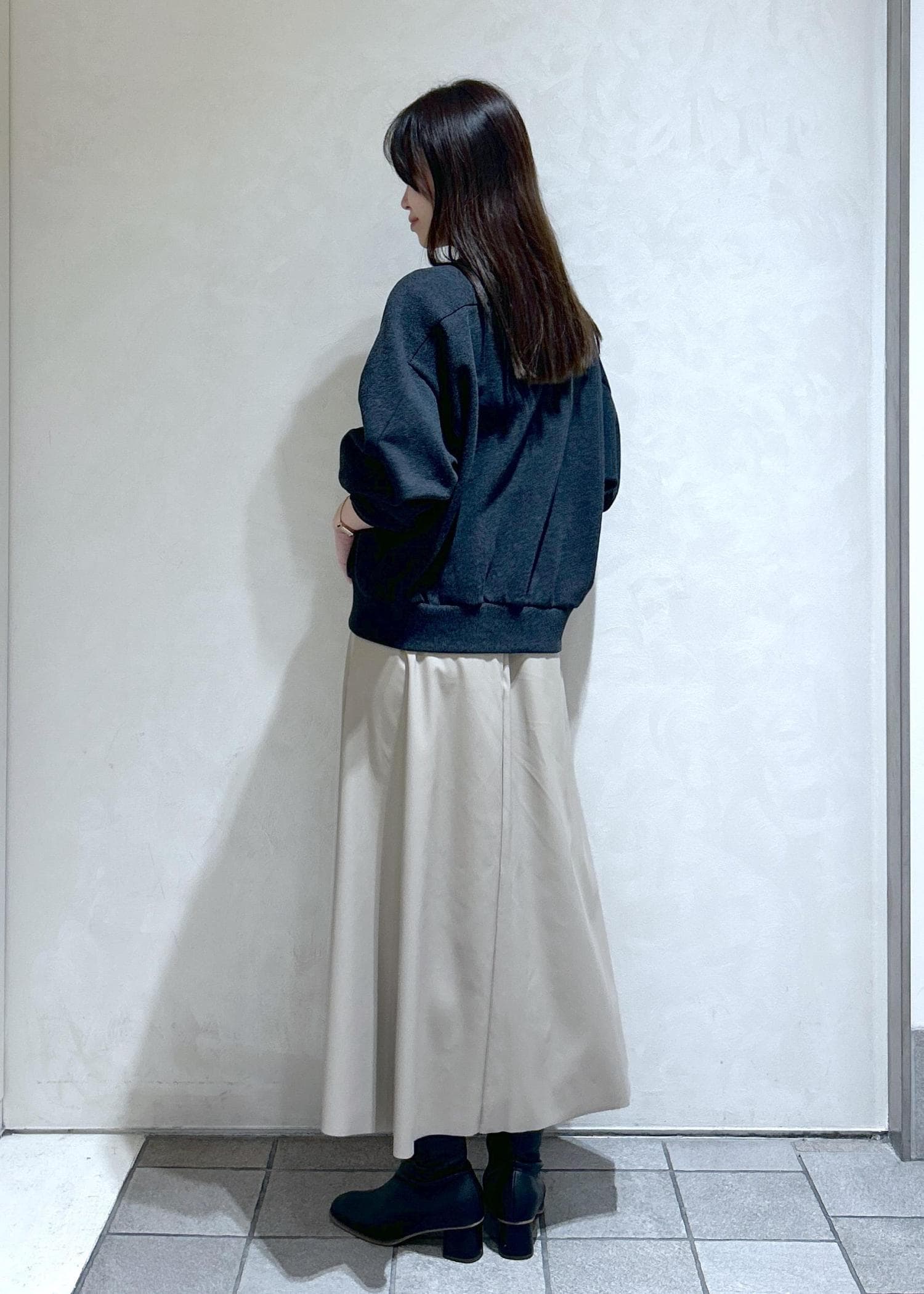 お尻に少しかかるくらいの丈感になりますので、パンツでも少しボリュームあるスカートでもどちらでも合わせやすいです。 -