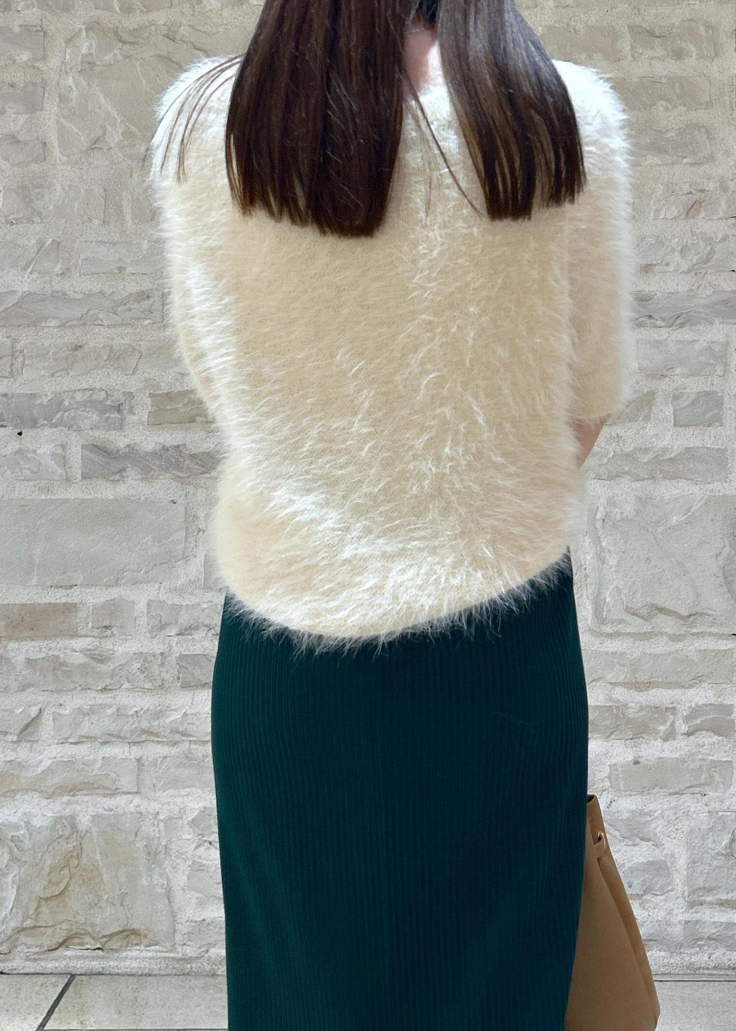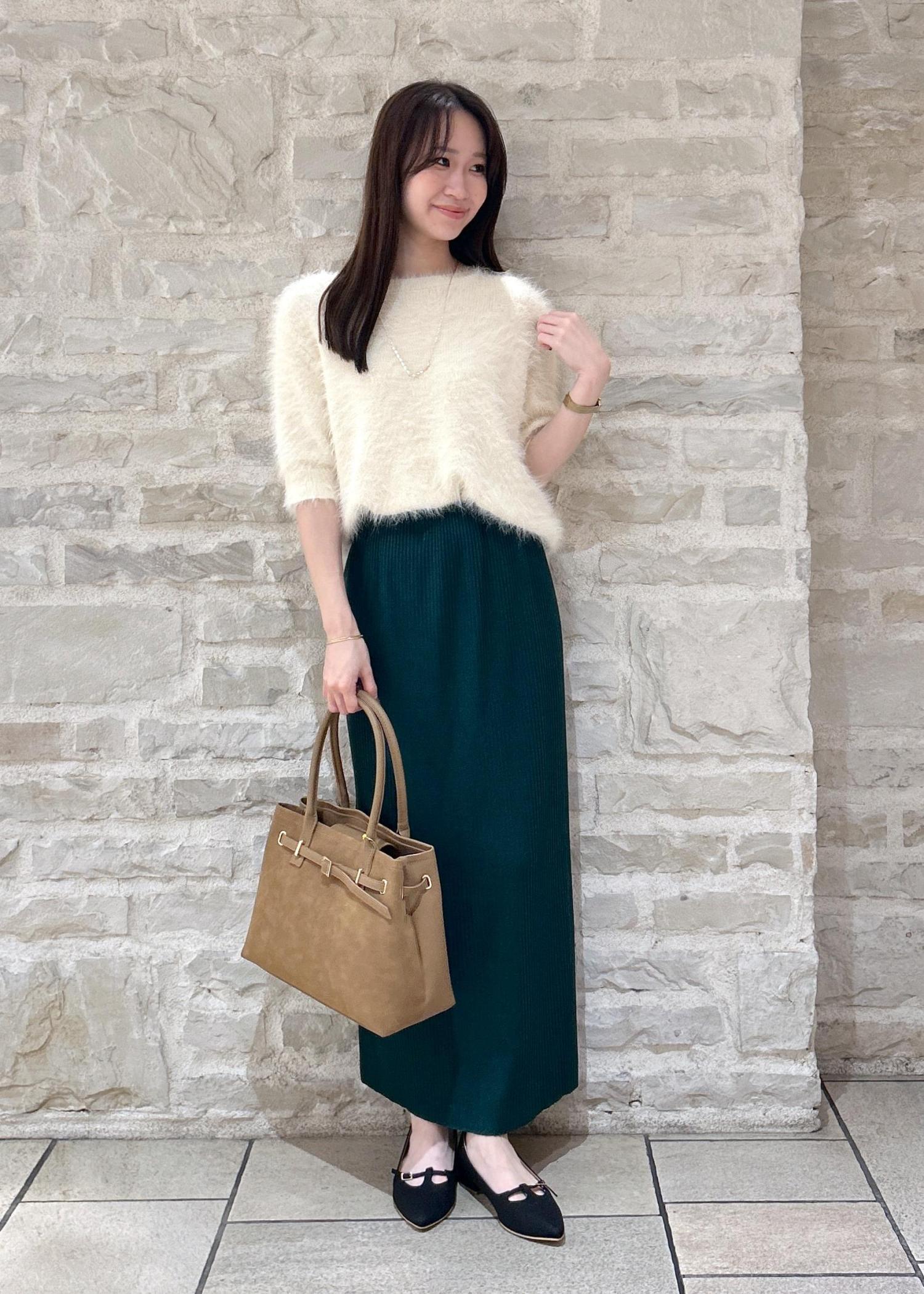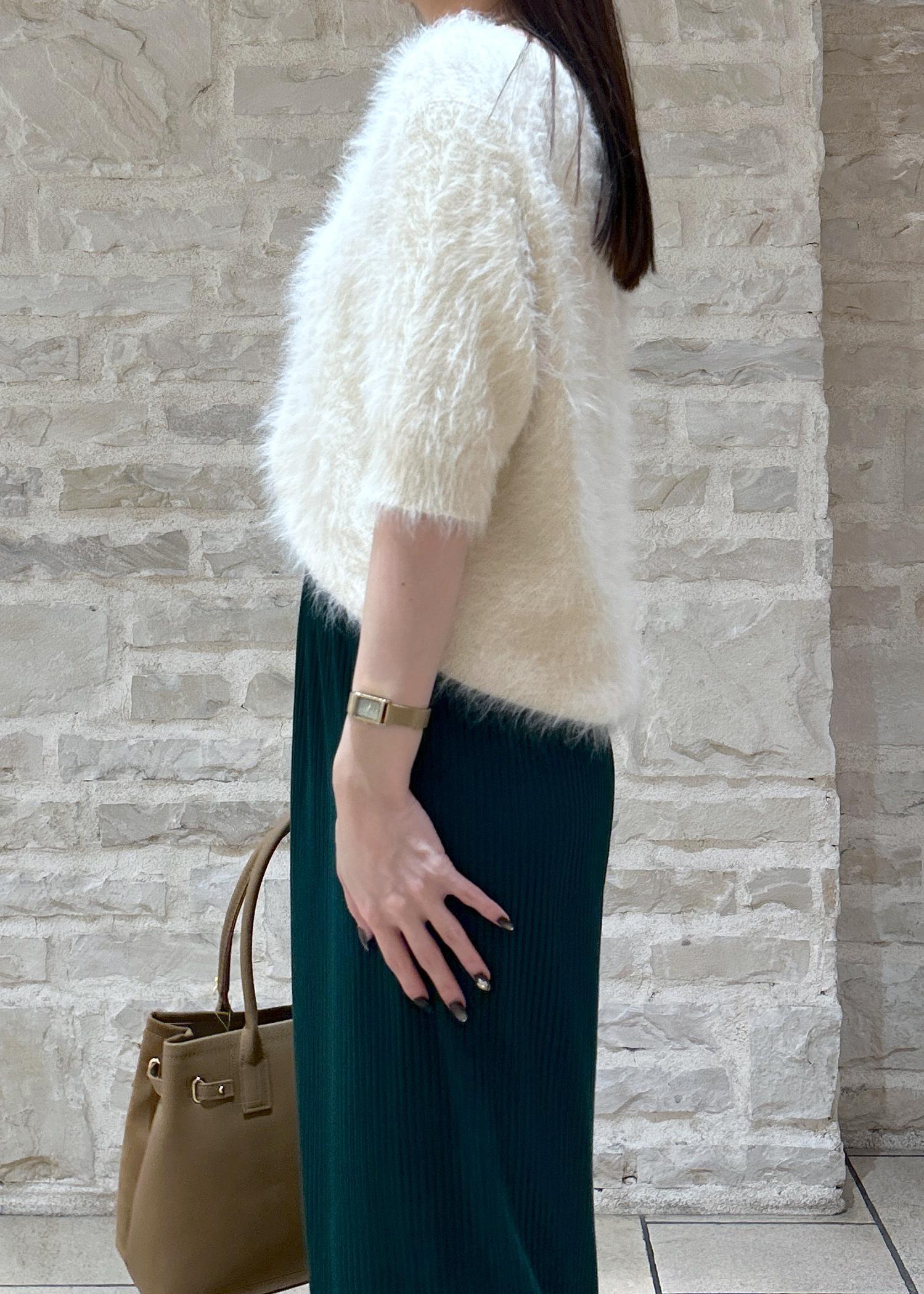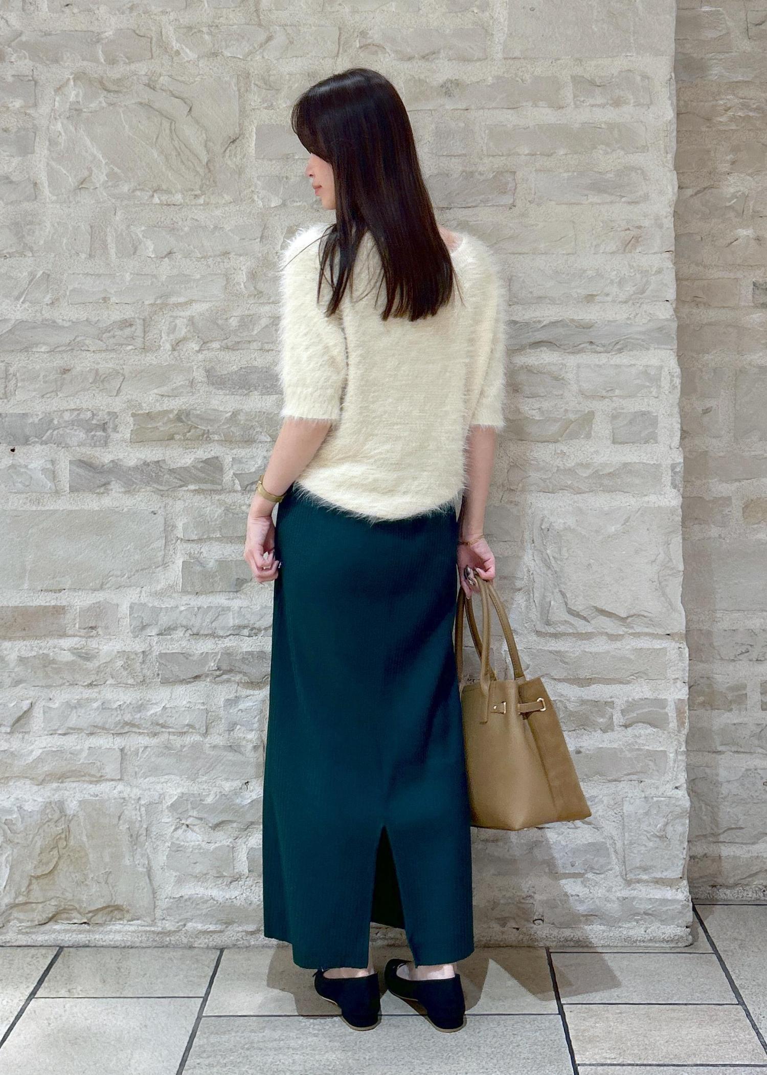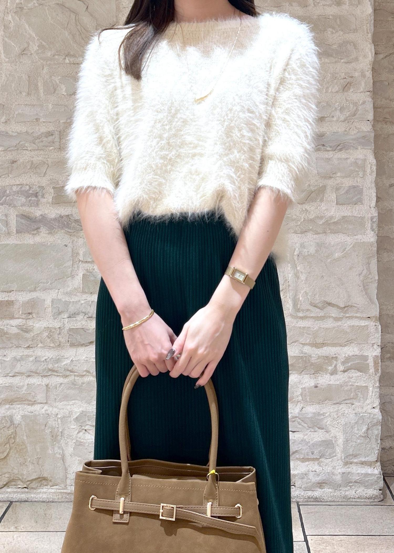 白のシャギーニットにグリーンのスカートで秋のお出かけスタイルにしました。