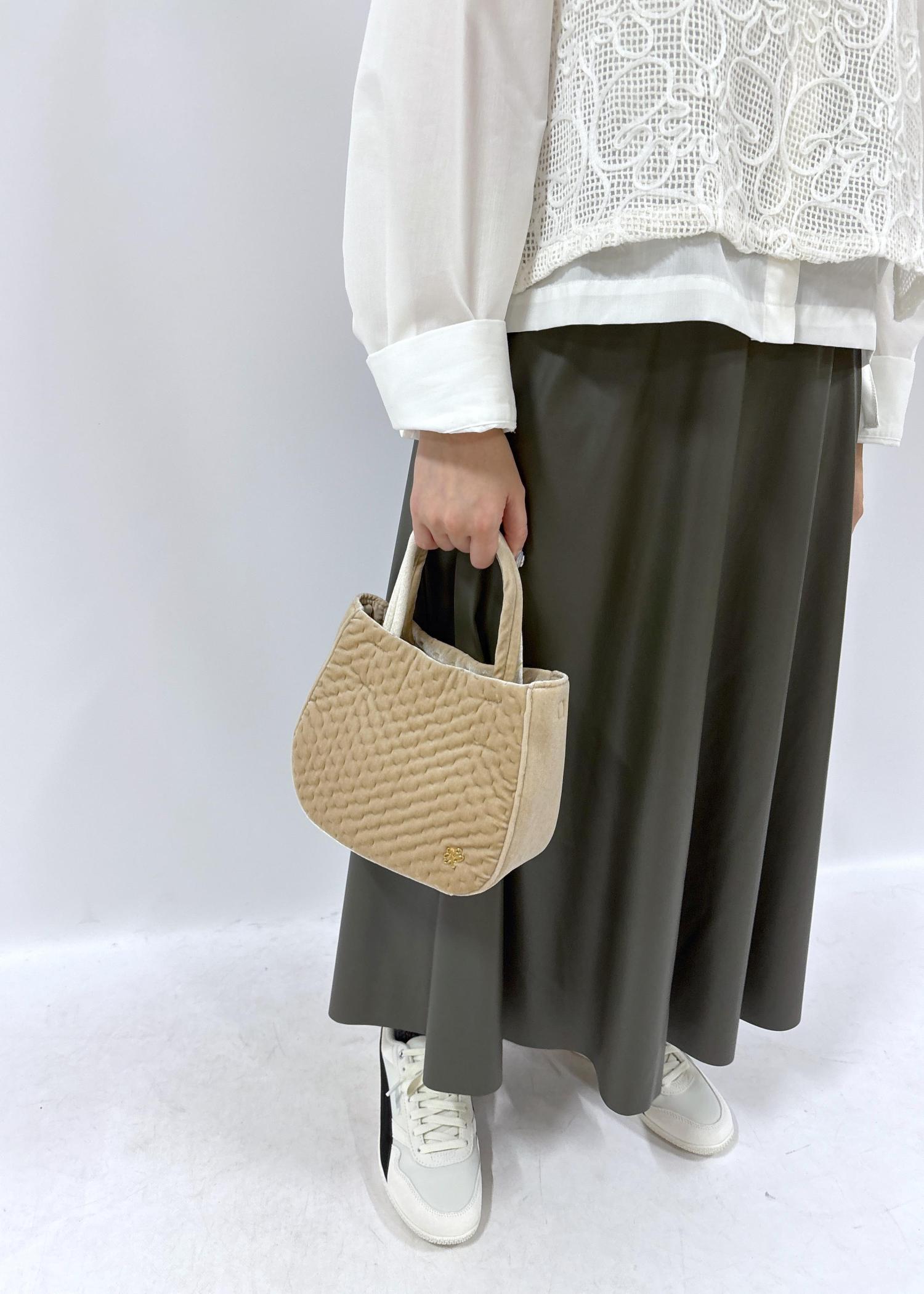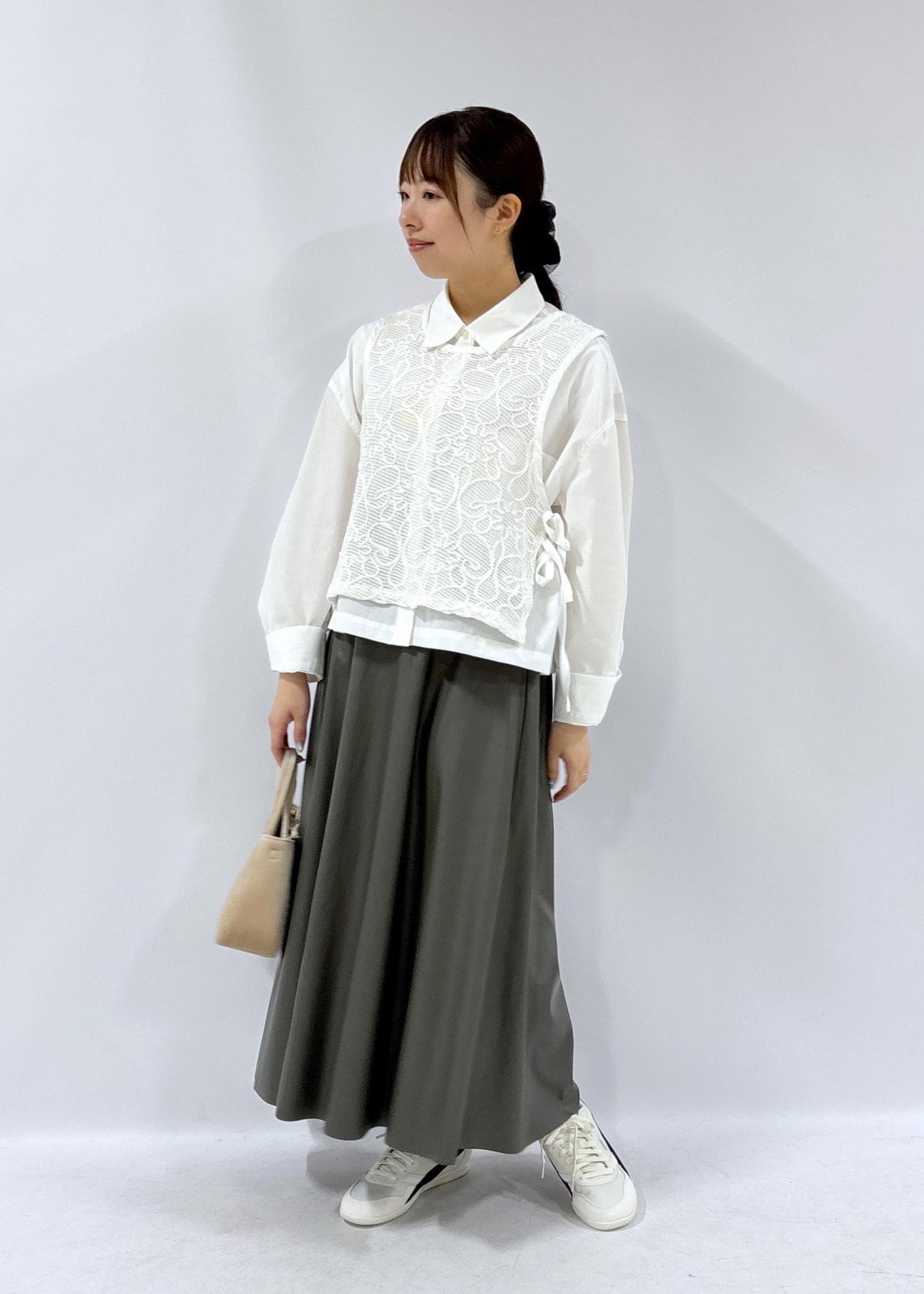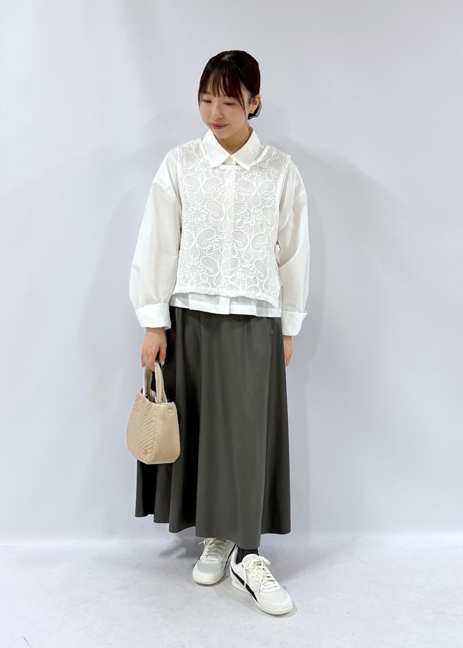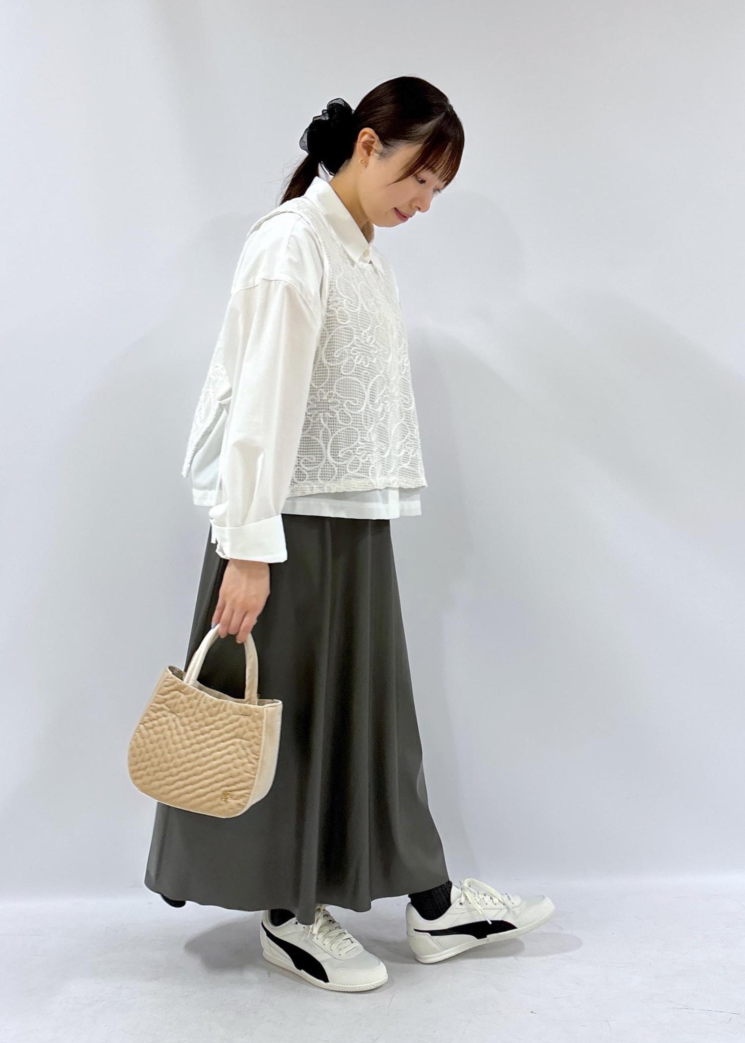 普段のアイテムに取り入れるだけで、雰囲気を変える事ができるレースベストに、秋らしいレザースカートを合わせて見ました。カジュアルにしつつ、上品さも残るで友達とのランチや遠出にもオススメ◎