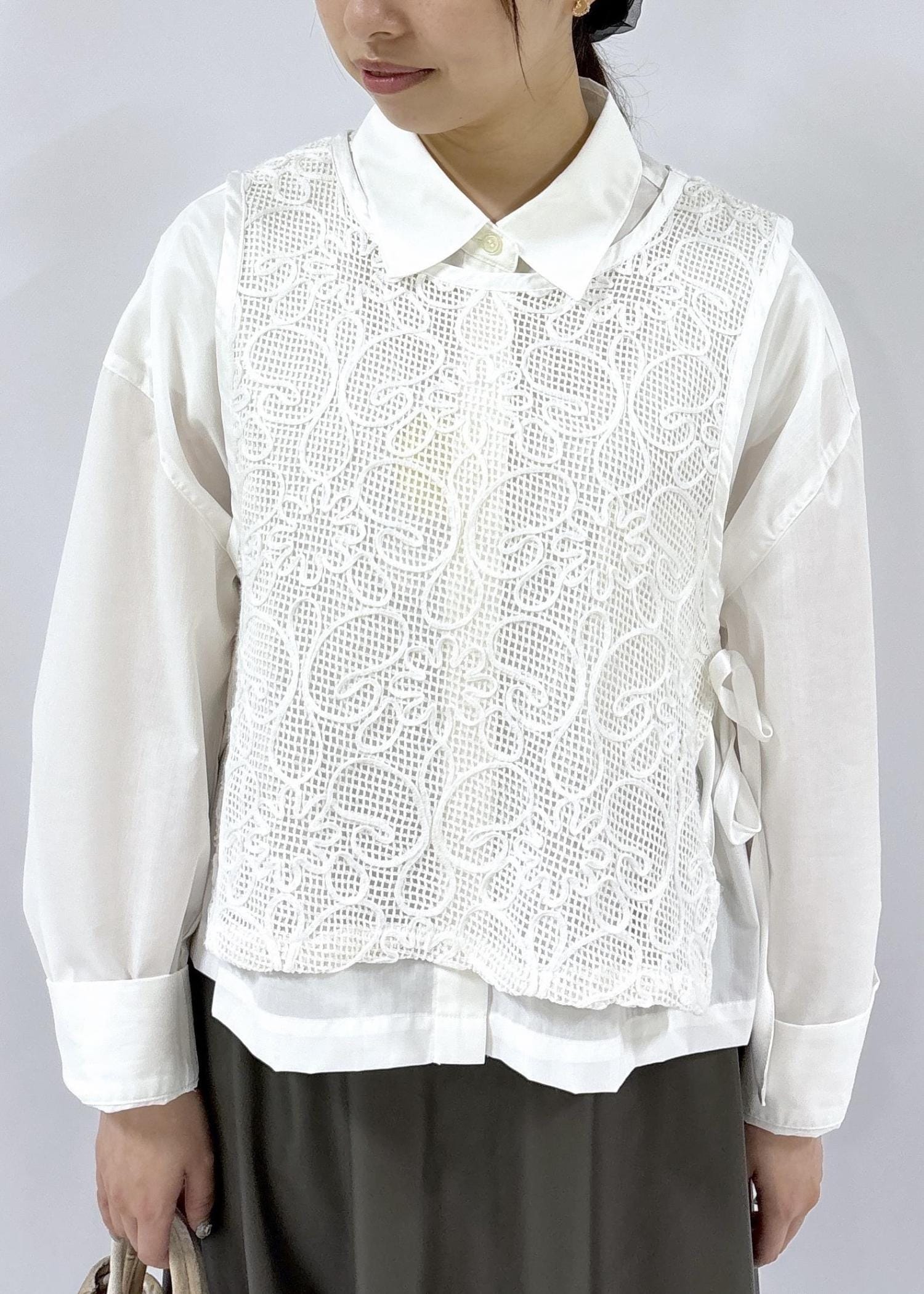レースデザインが上品で、主張が強過ぎないので普段ベストなど着慣れない方でも挑戦しやすいアイテムです。丈感スッキリめで、小柄さんにもオススメ