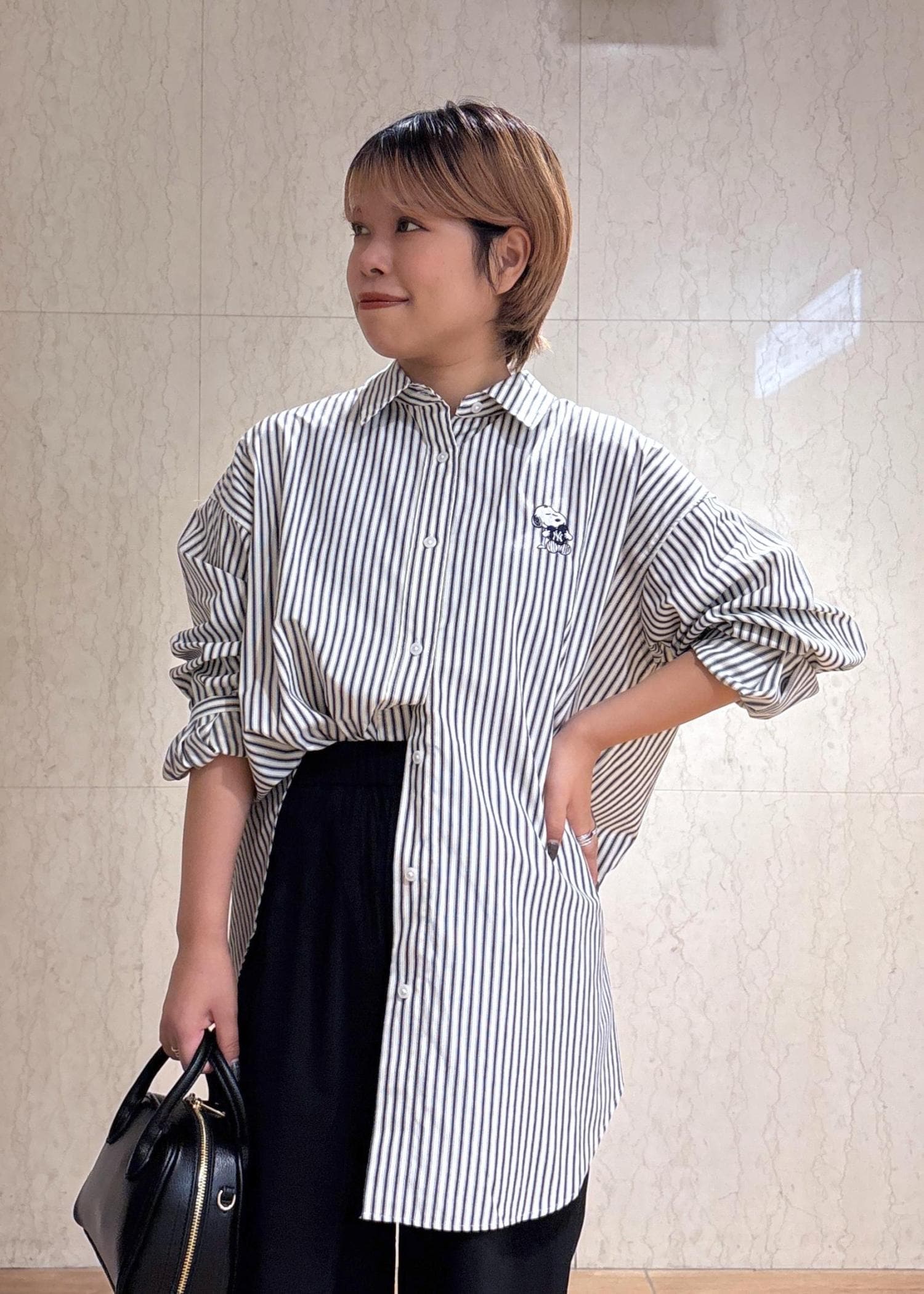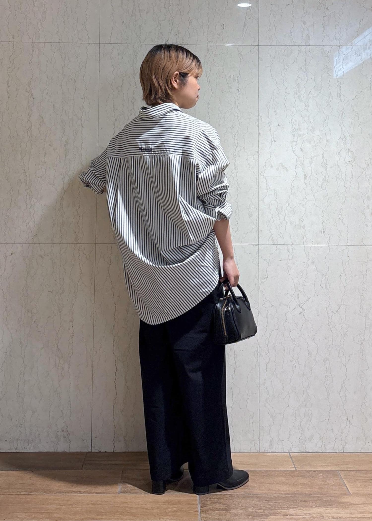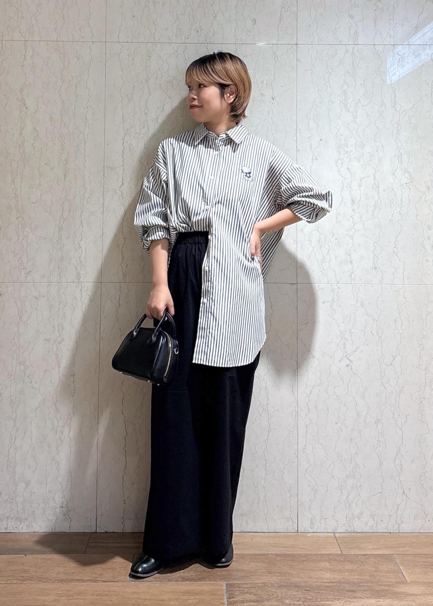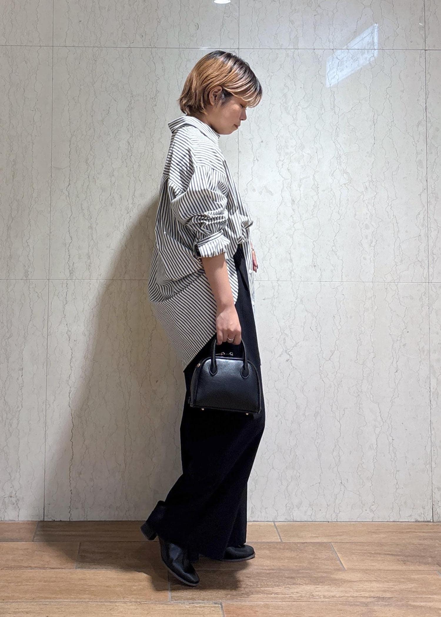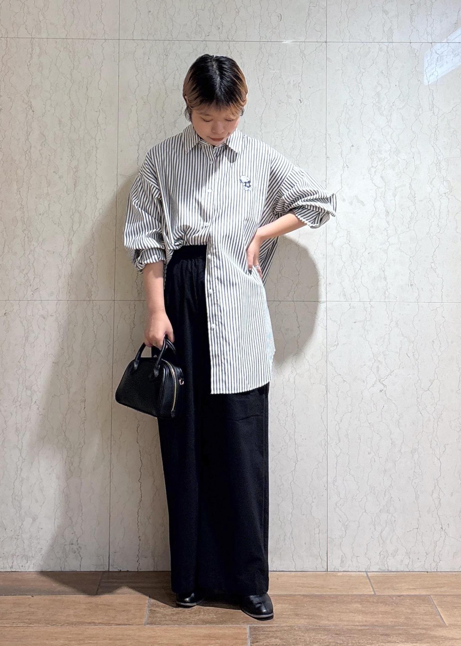 シャツが映えるように、ボトムや小物は黒で統一したことがポイントです。