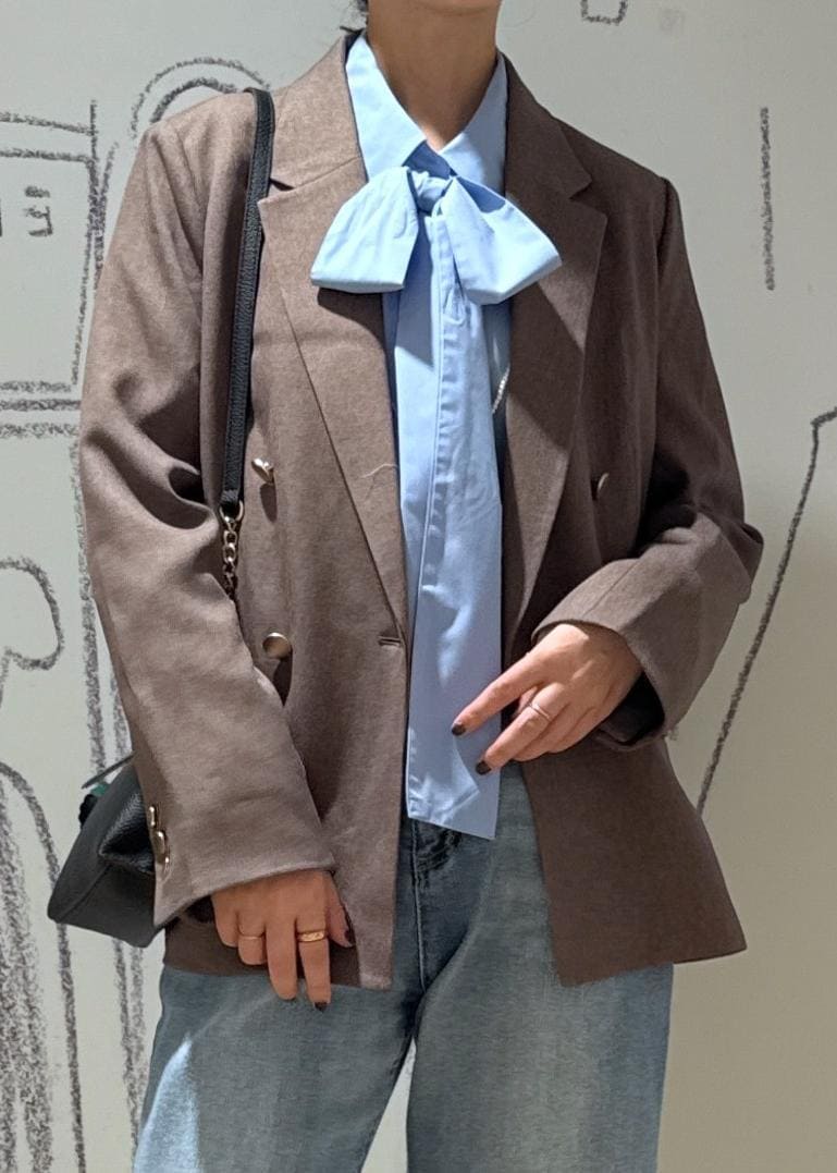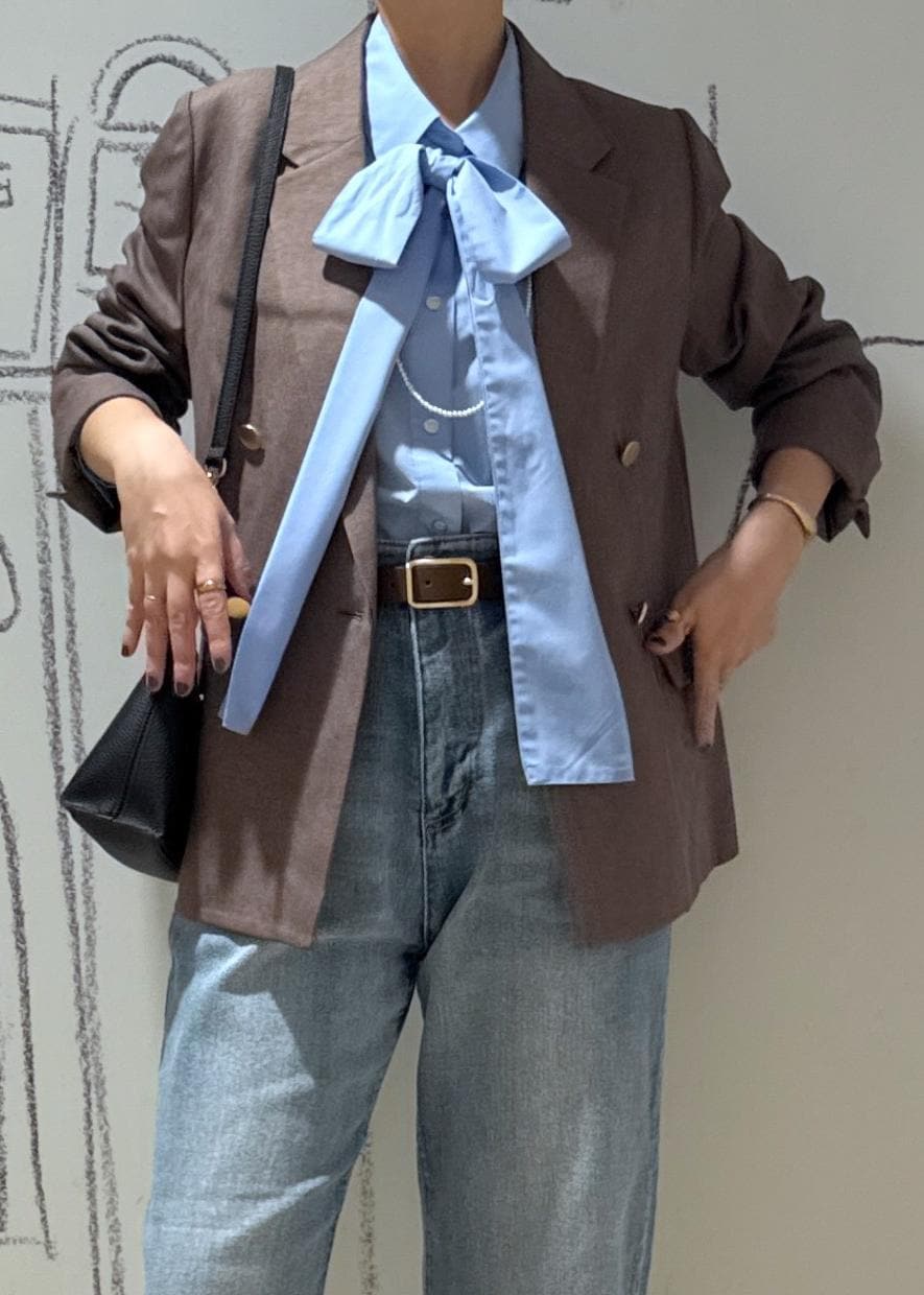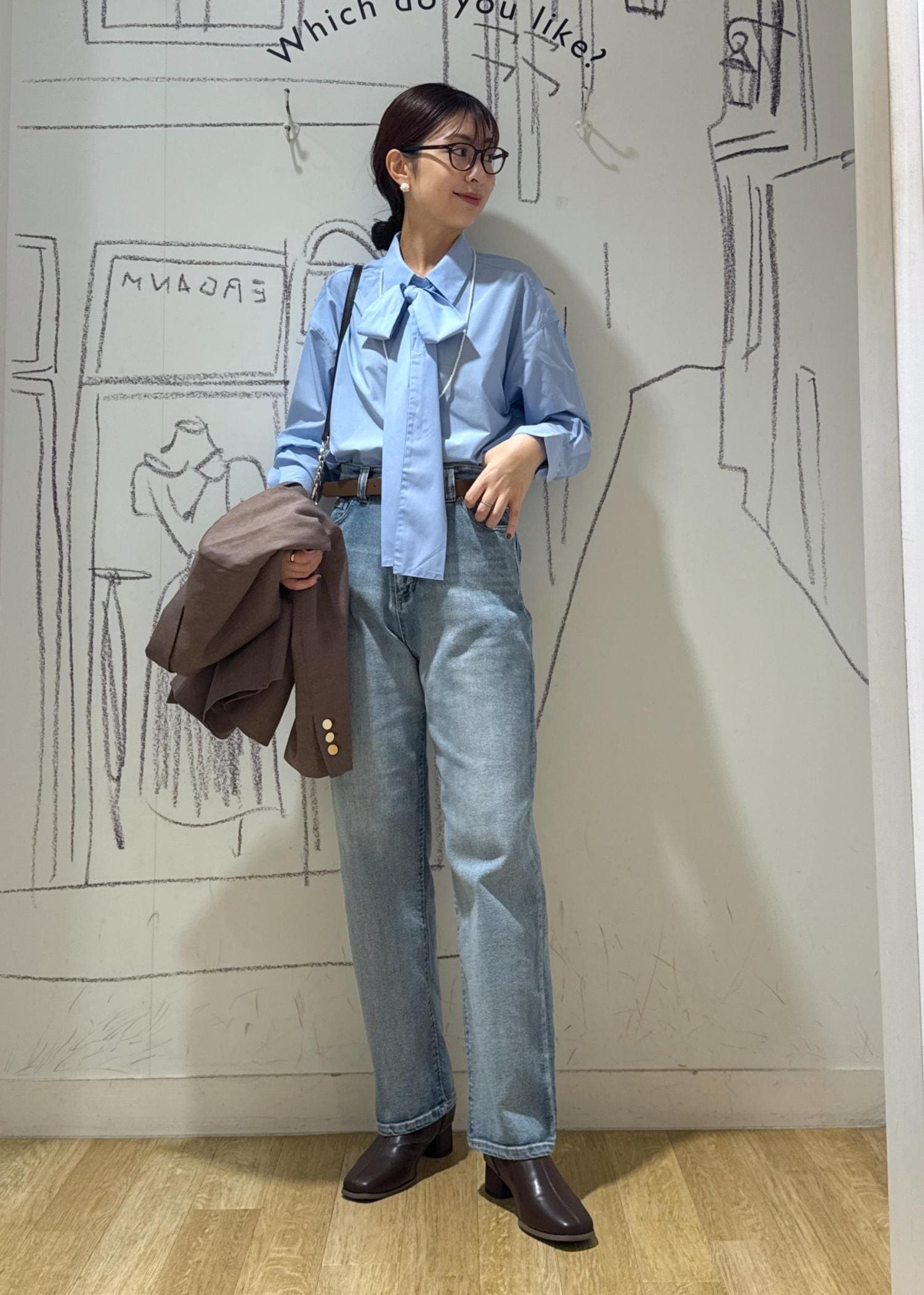 柔らかく軽い生地です。ボウタイは長めなのでリボン結びした時のボリューム感が可愛い♪取り外し出来るのでシンプルに着たい時にもお勧めの1枚。着丈はお尻半分隠れる長さです。