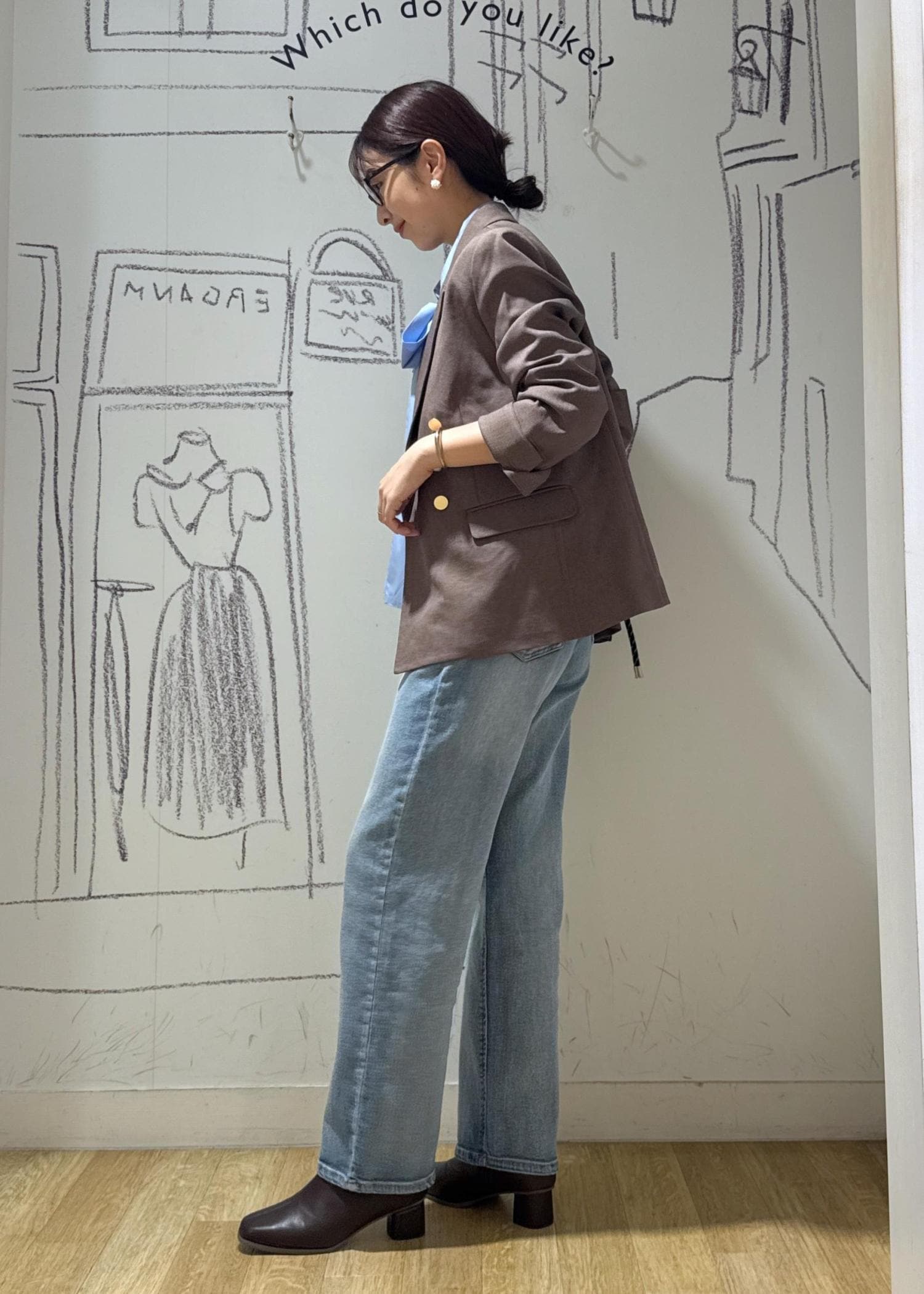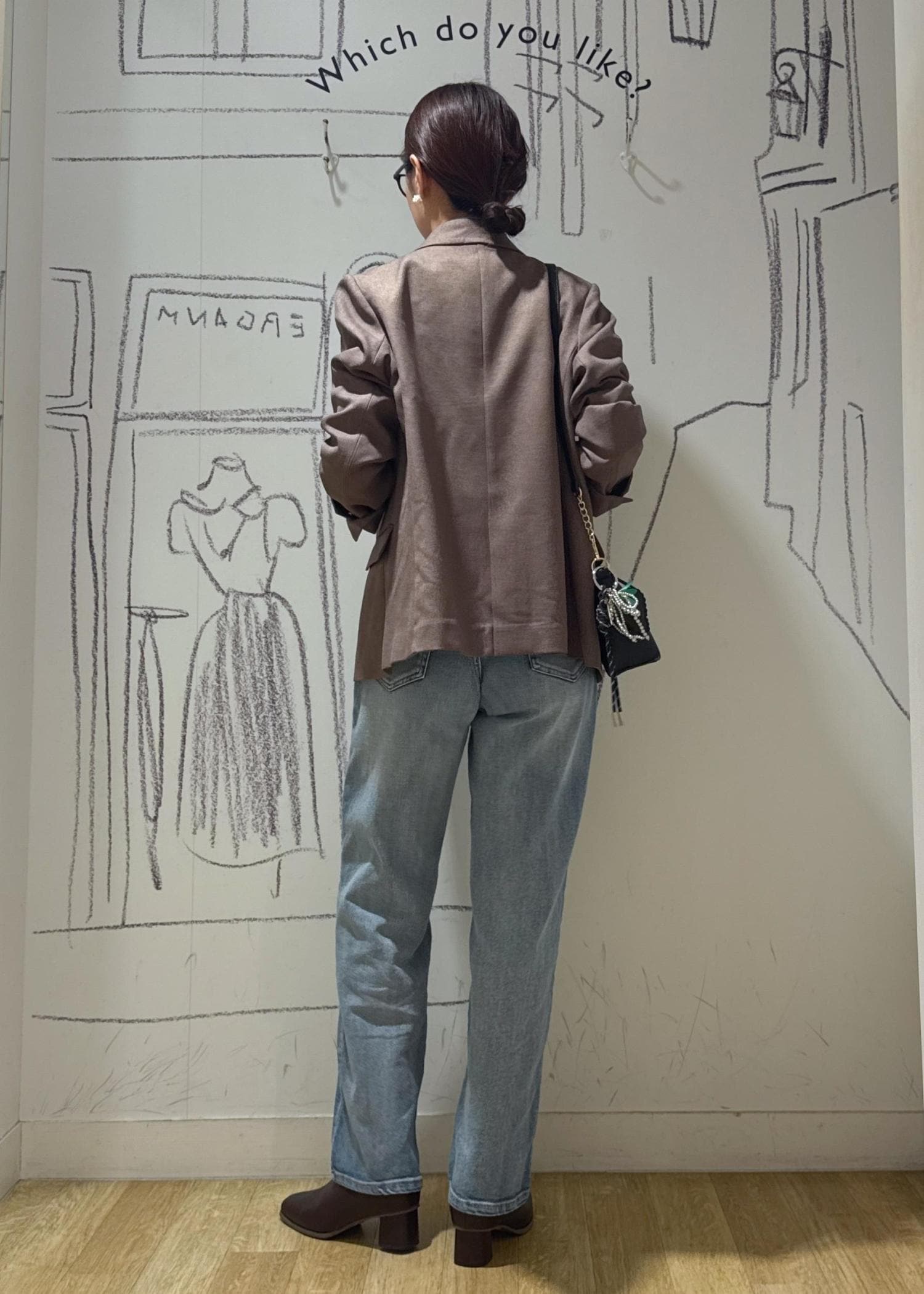 ある程度ゆとりのあるシャツなども難なくスルッと袖通しし易いサイズ感です。重みもそこまでなく肩肘張らずに着られる優しい着心地も人気のひとつ。こちらの着丈は腰がしっかり隠れる長さでバランスが取りやすくボトムスを選ばない丈感になります。