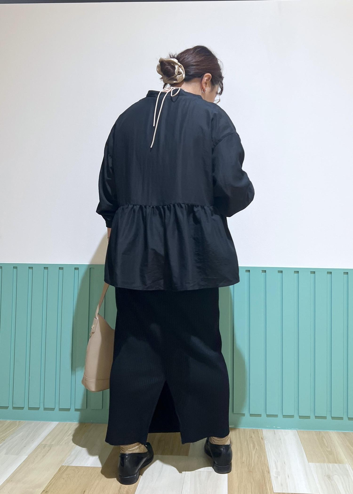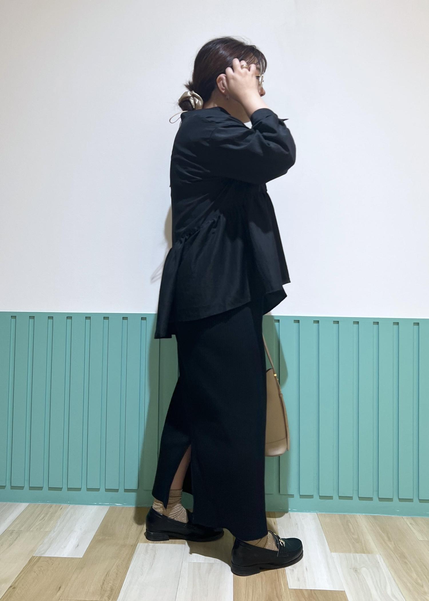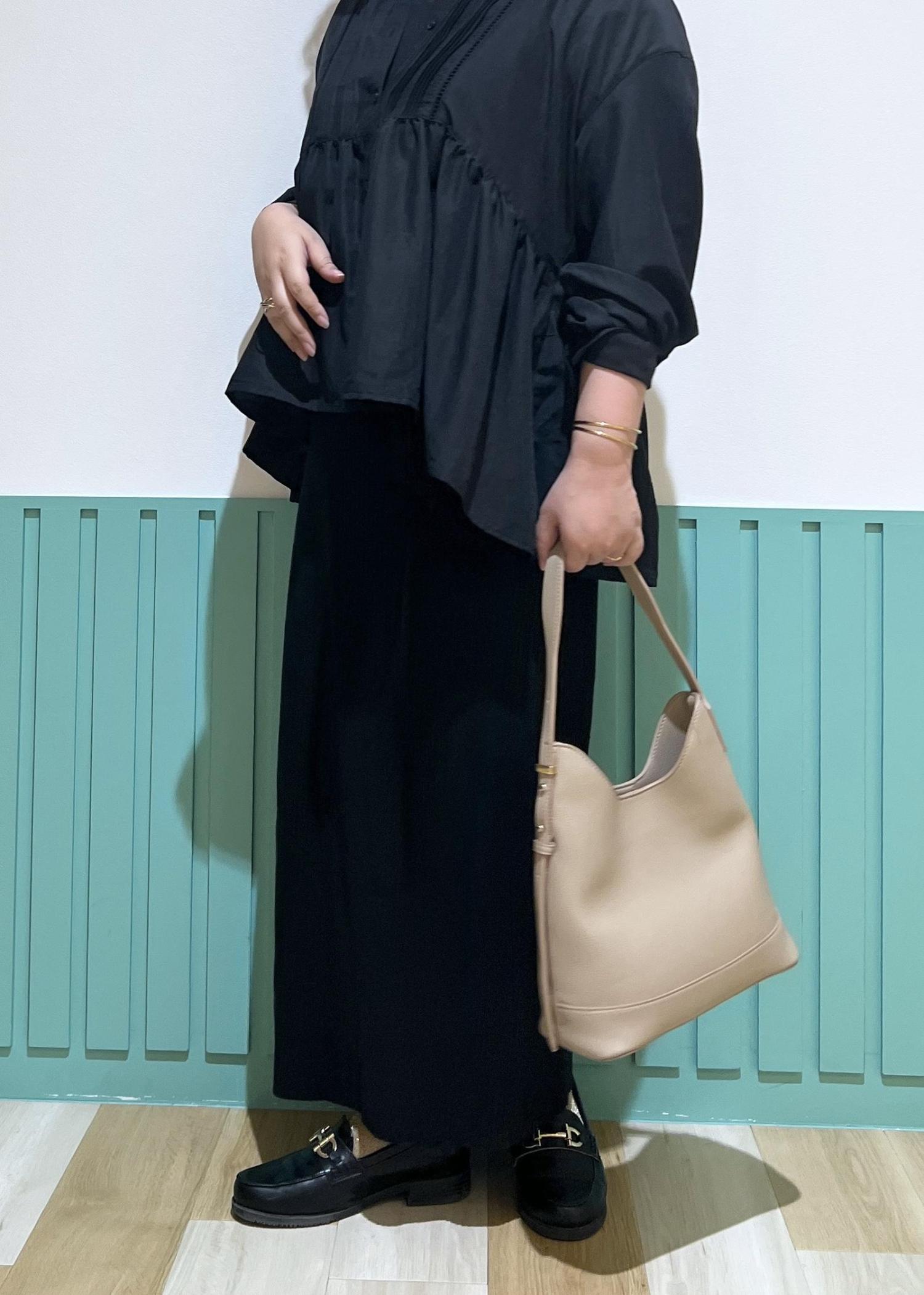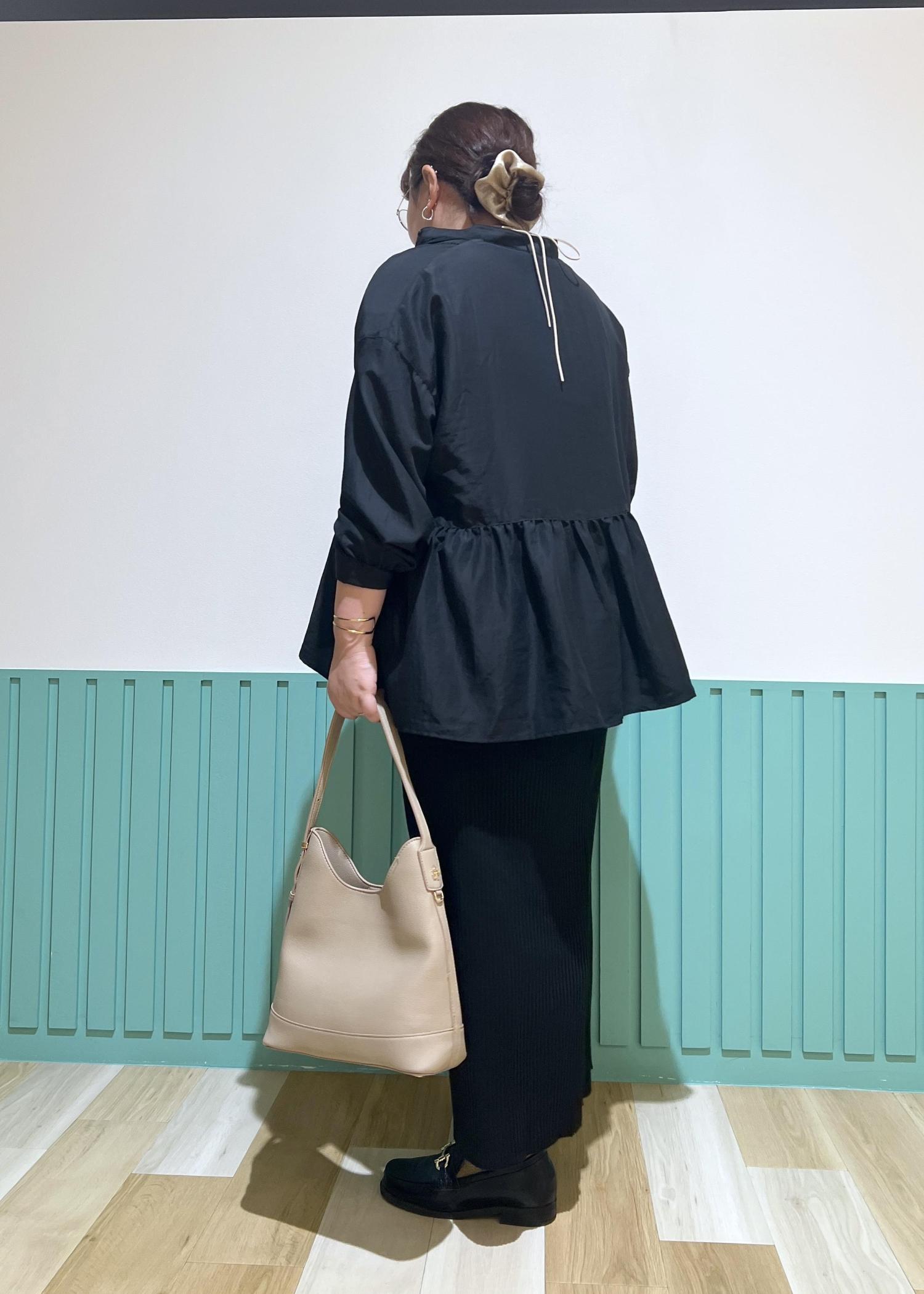 インナーまでブラックで、徹底的にブラックで合わせたのがポイント。バッグはベージュにして軽さをプラス。