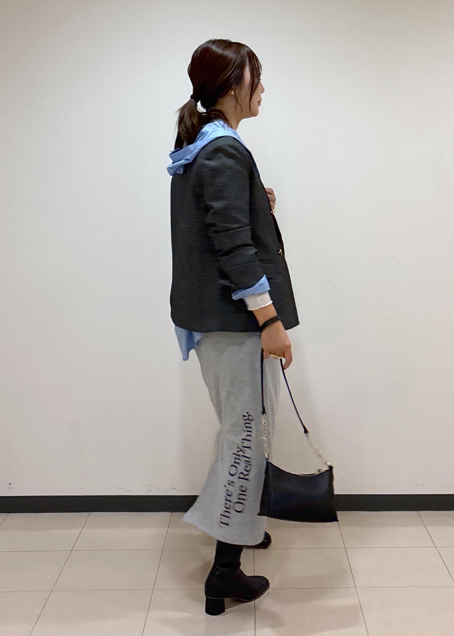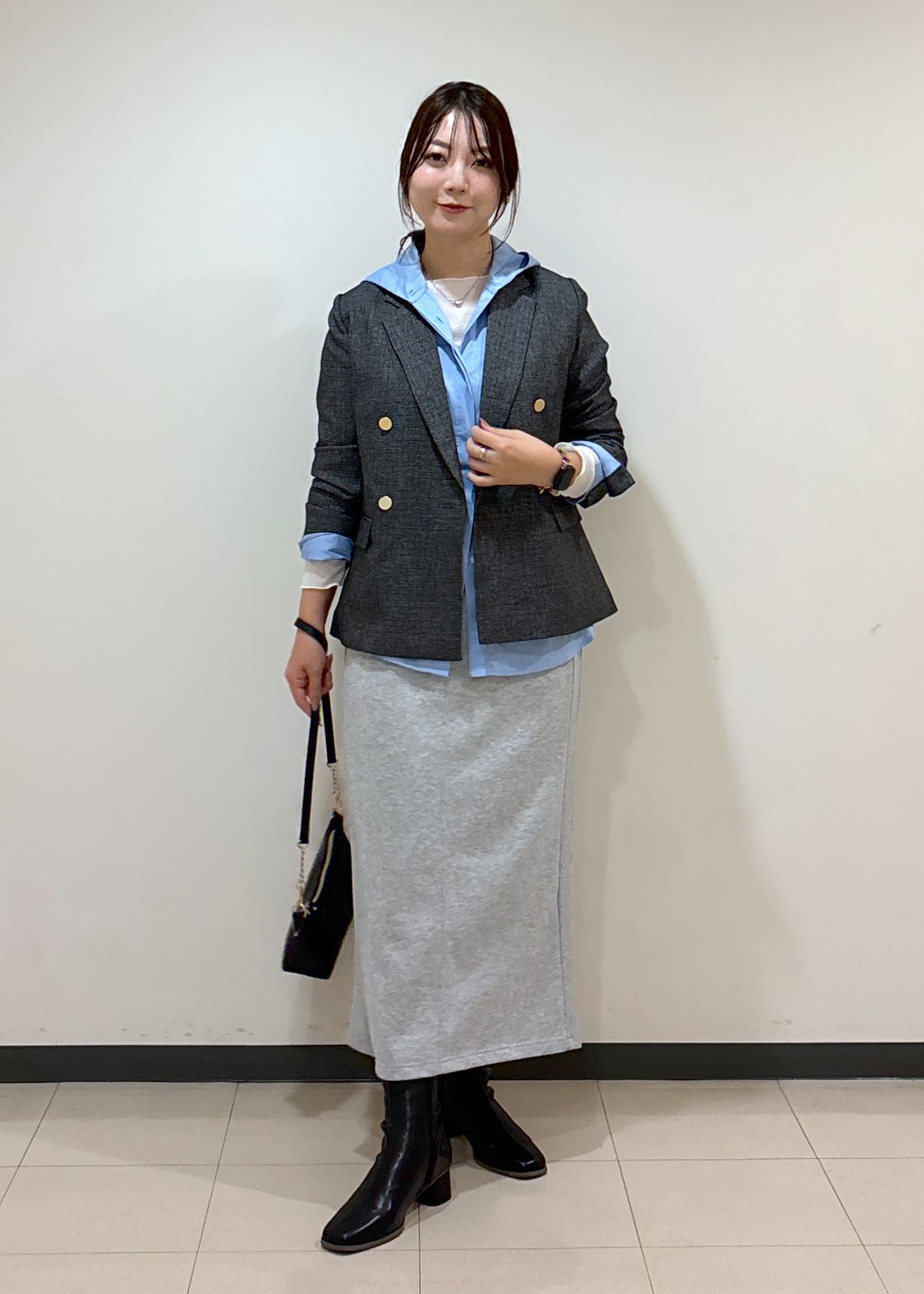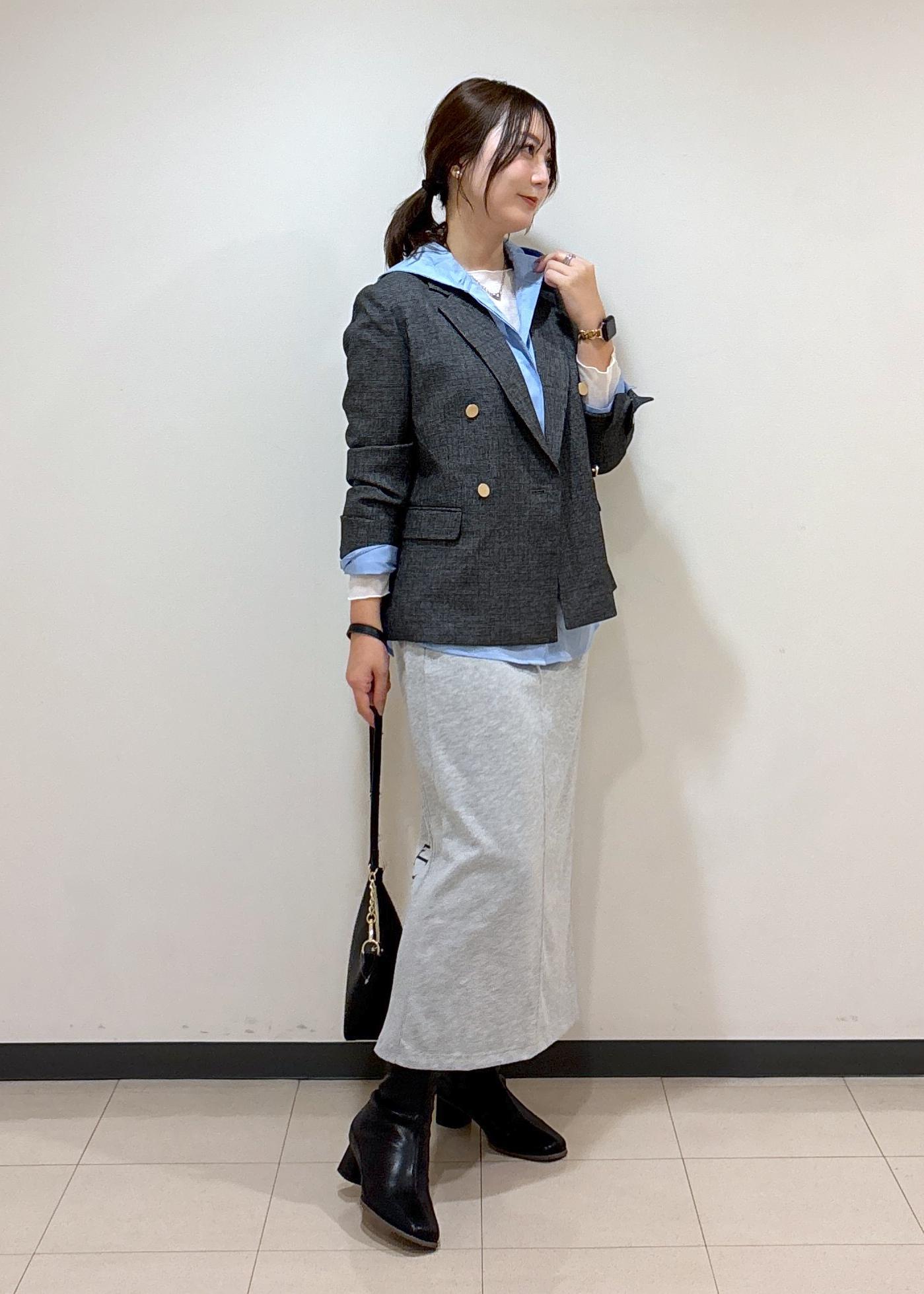 グレーでまとめつつ、ブルーシャツで差し色を。