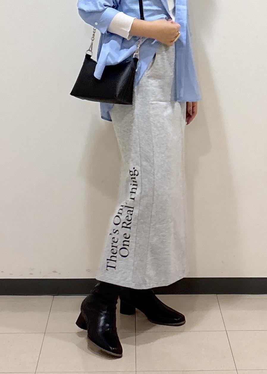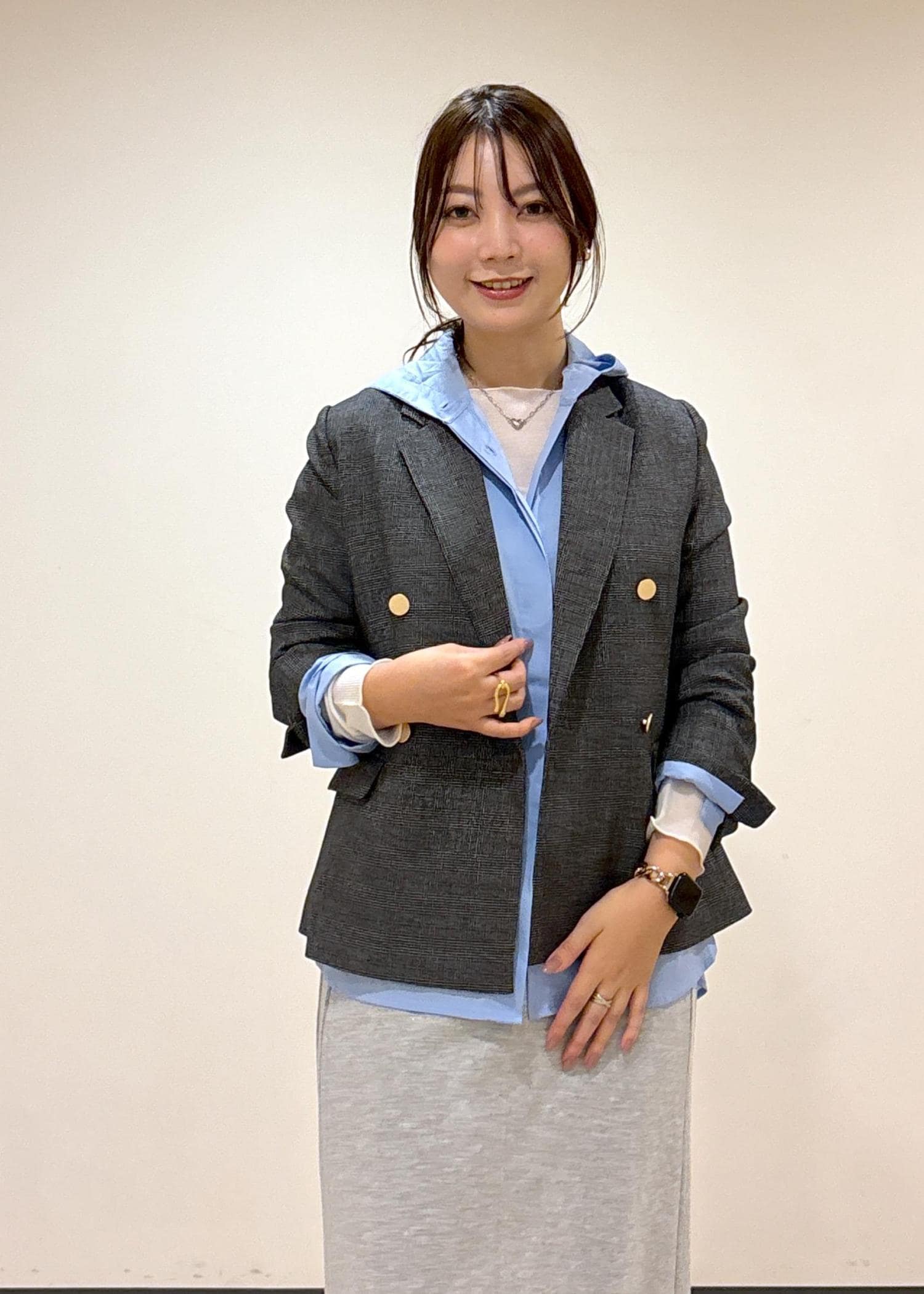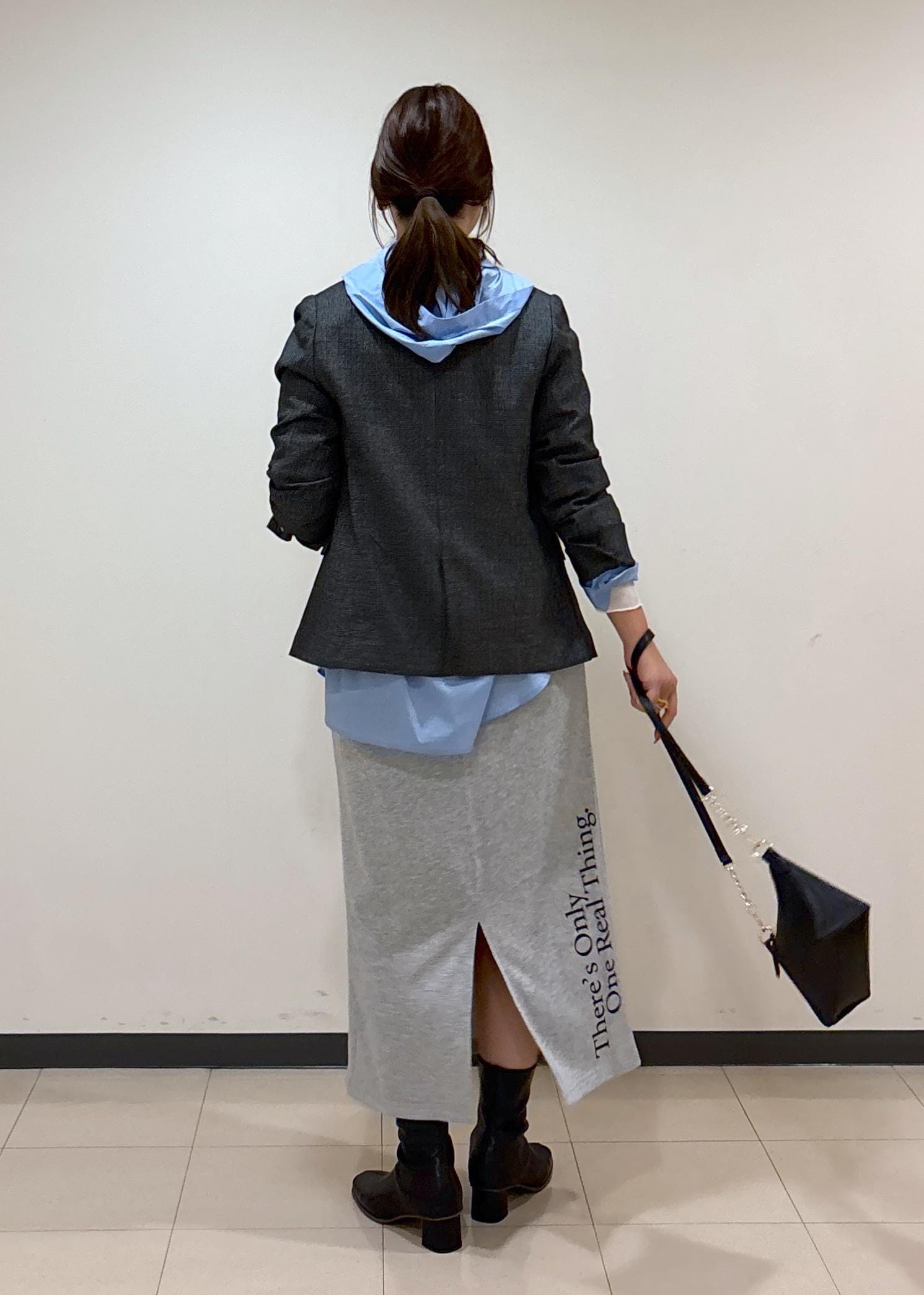 グレーでまとめつつ、ブルーシャツで差し色を。