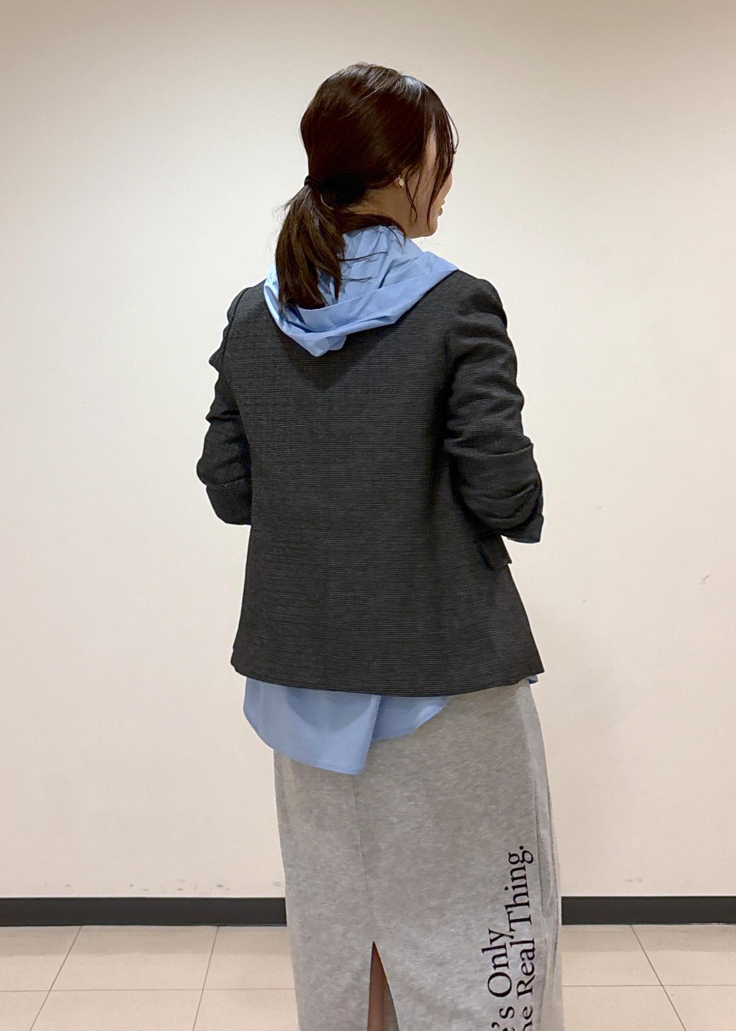 柔らかな肌あたりのシャツ。フードがついていて後ろ姿も抜け感が出ます。