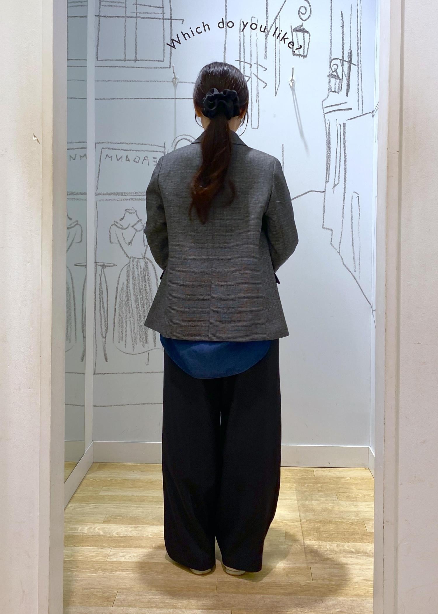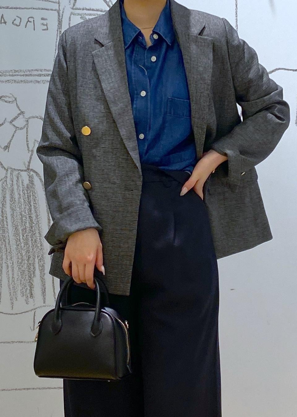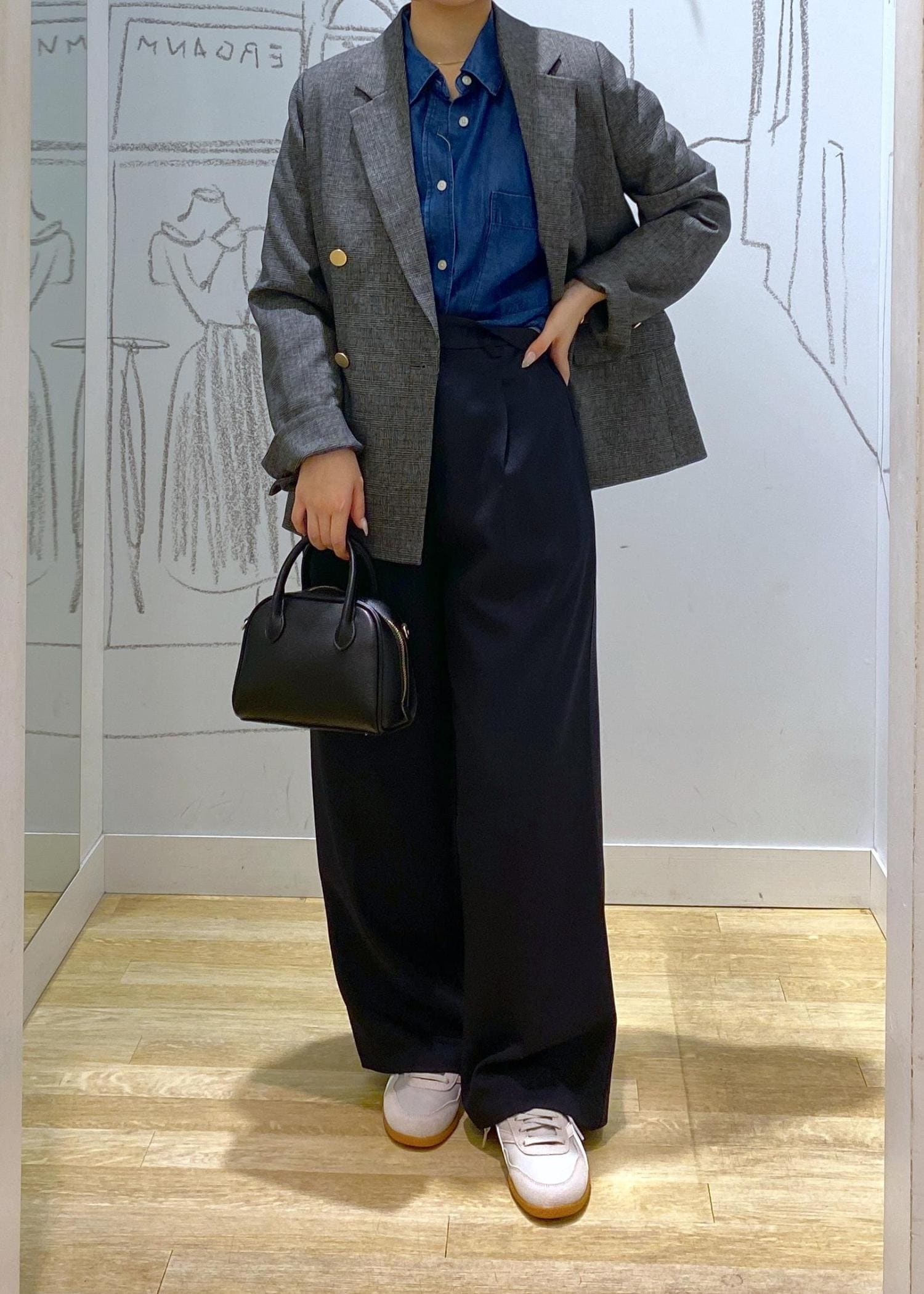 ジャケットのインナーにデニム調のシャツを合わせることでメンズライクなコーデにしました。