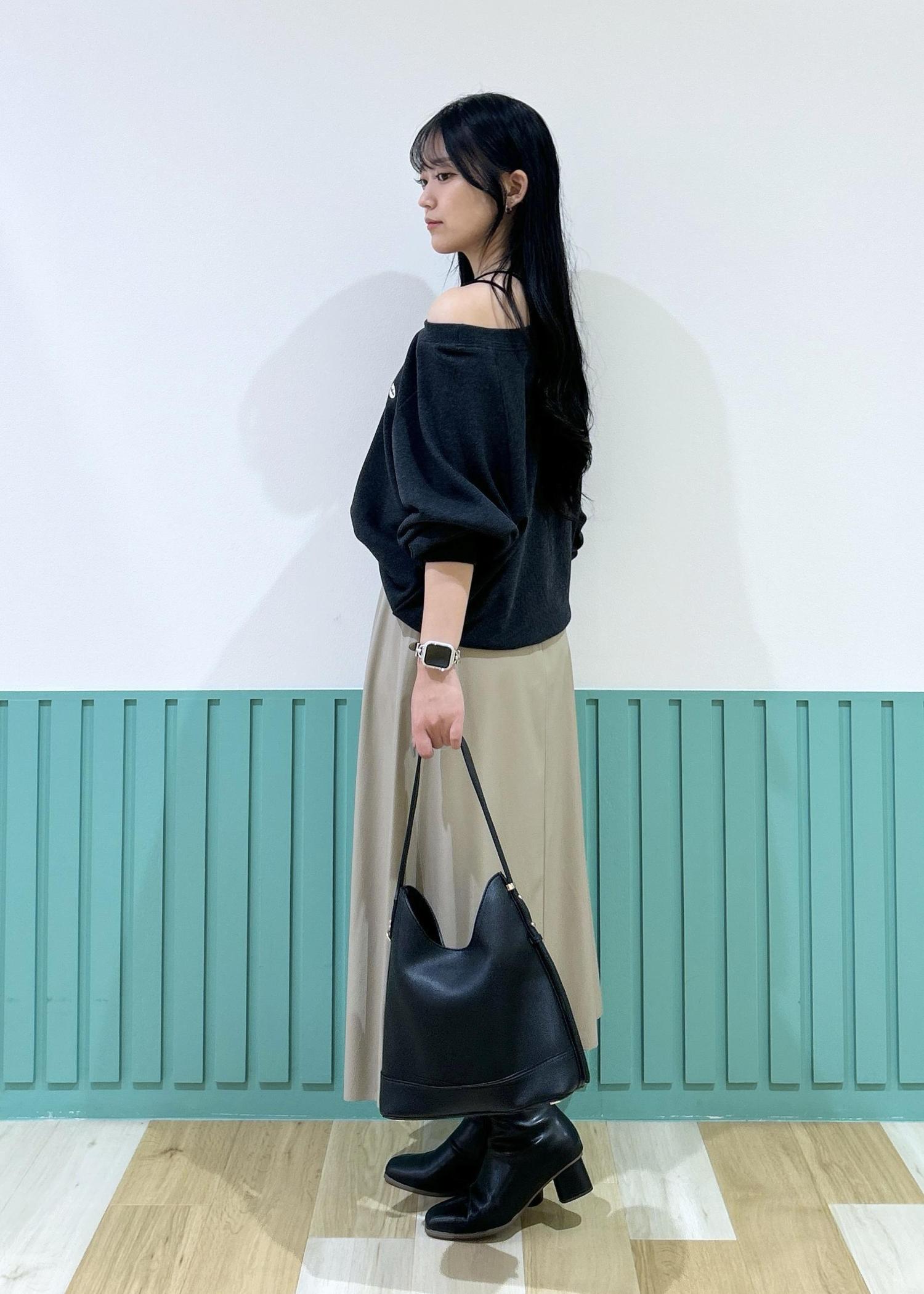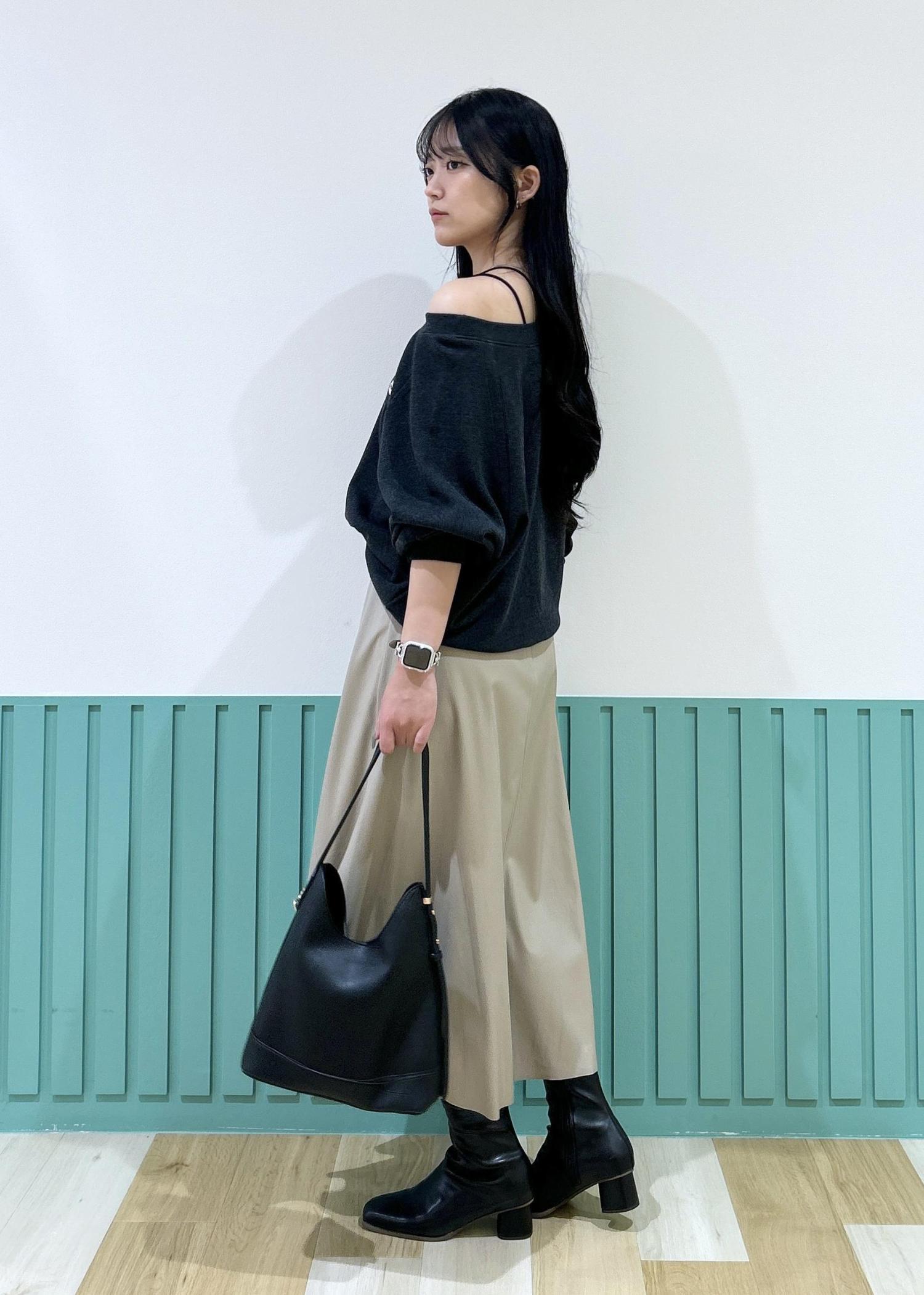 スカートの丈が長めなので、黒のショートブーツを合わせて足元に重心を置き、バランス良く仕上げています。