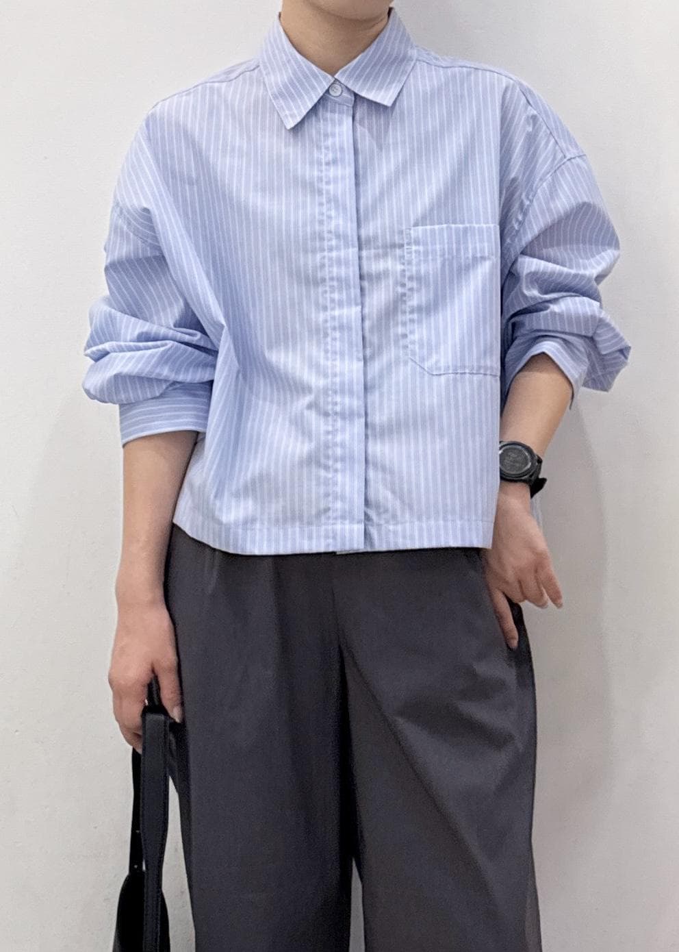 ROPÉ PICNICベーシッククロップドシャツ/イージーケアサックス / F¥4,940レビューゆとりのあるサイズ感ですが、ショート丈ですっきりと着られるシンプルなシャツ。