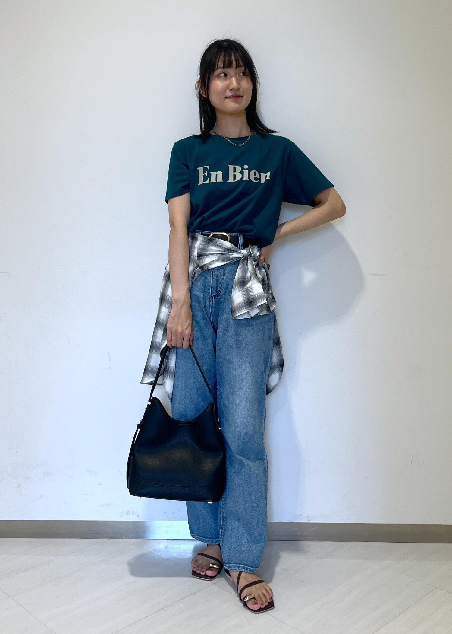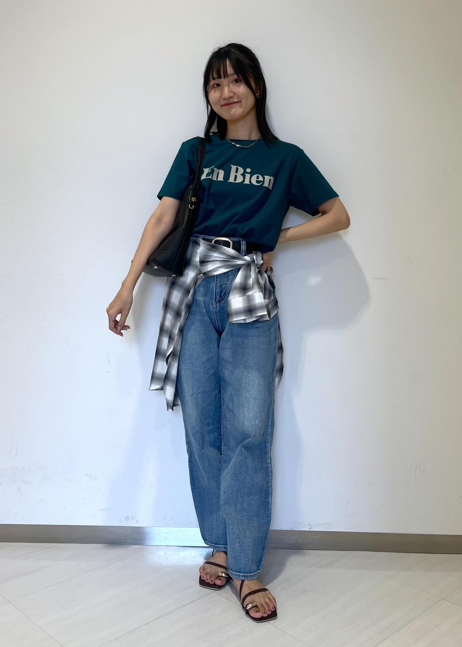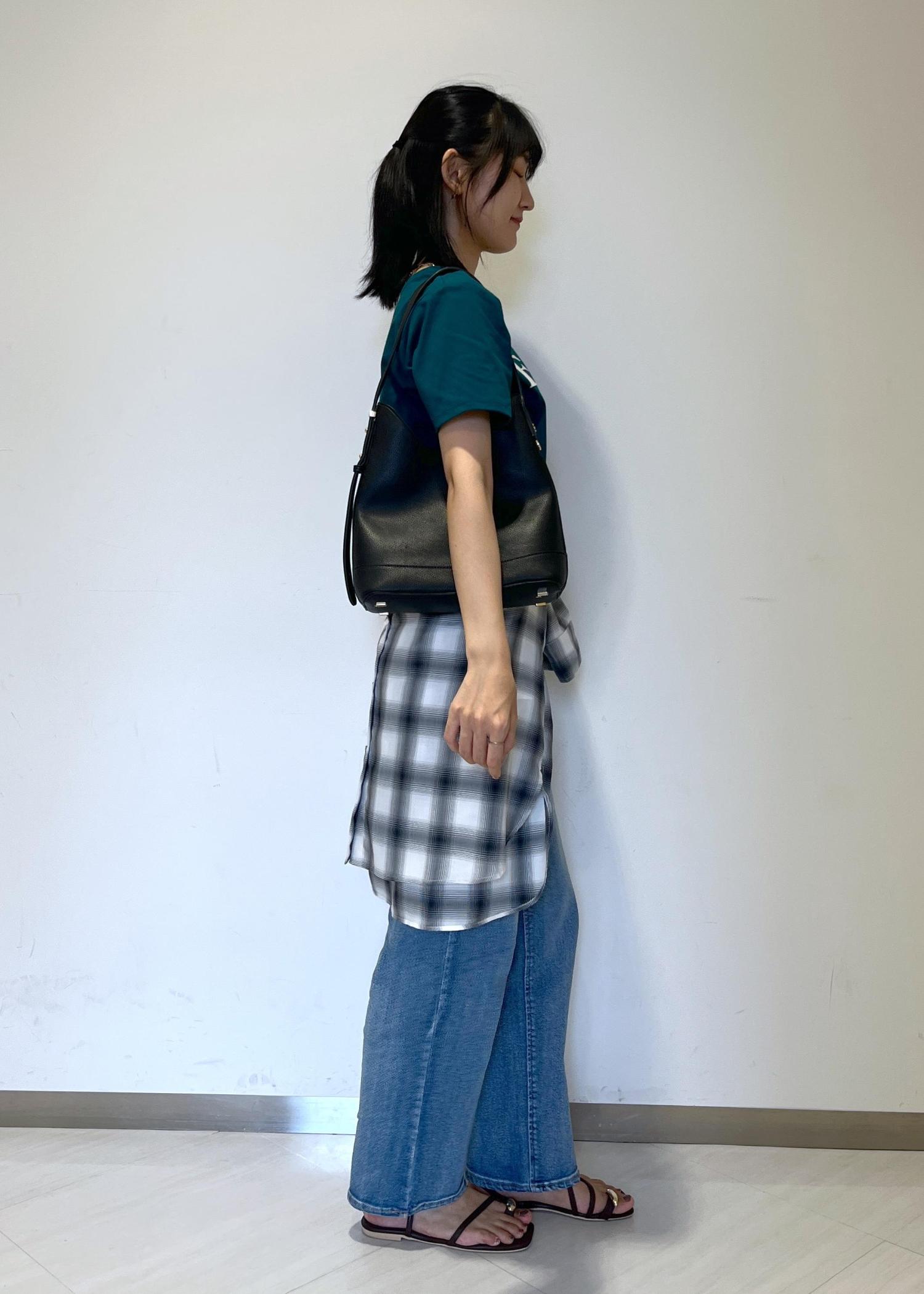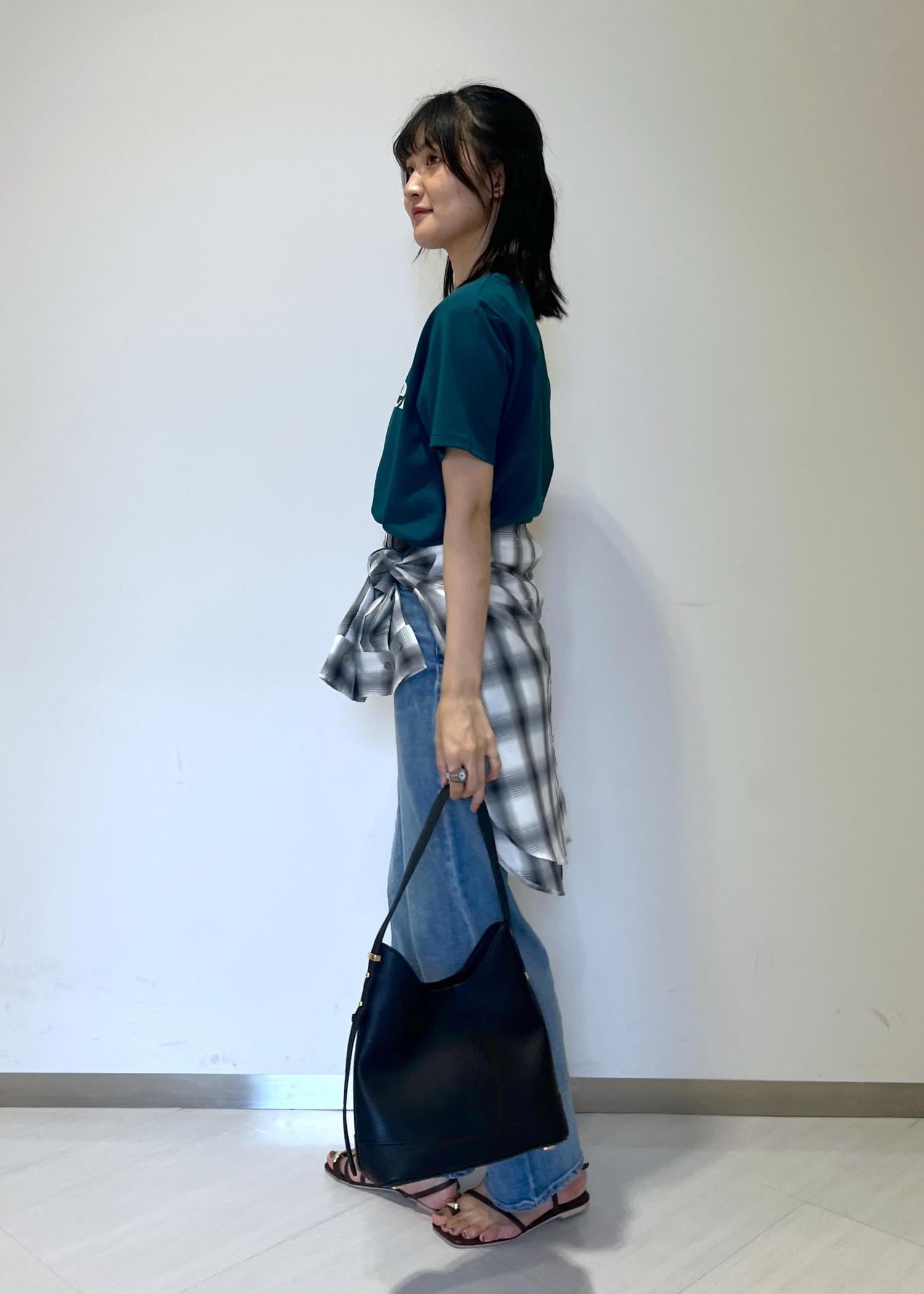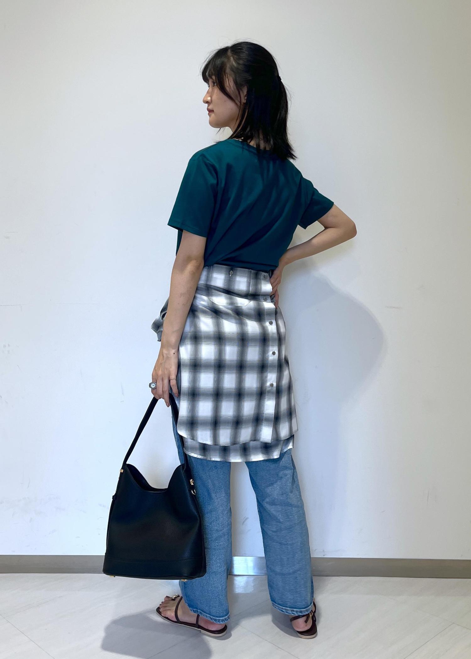 夏のコーデにチェックシャツを腰巻きするだけで簡単にトレンド感のある秋コーデになります。