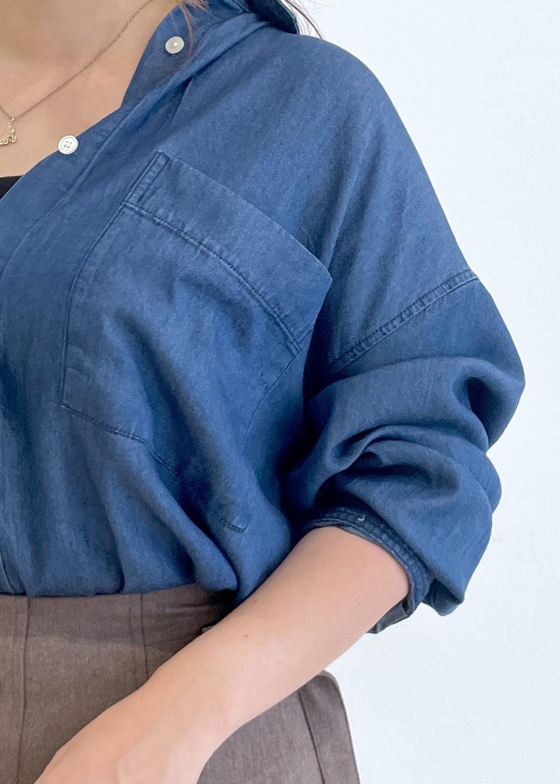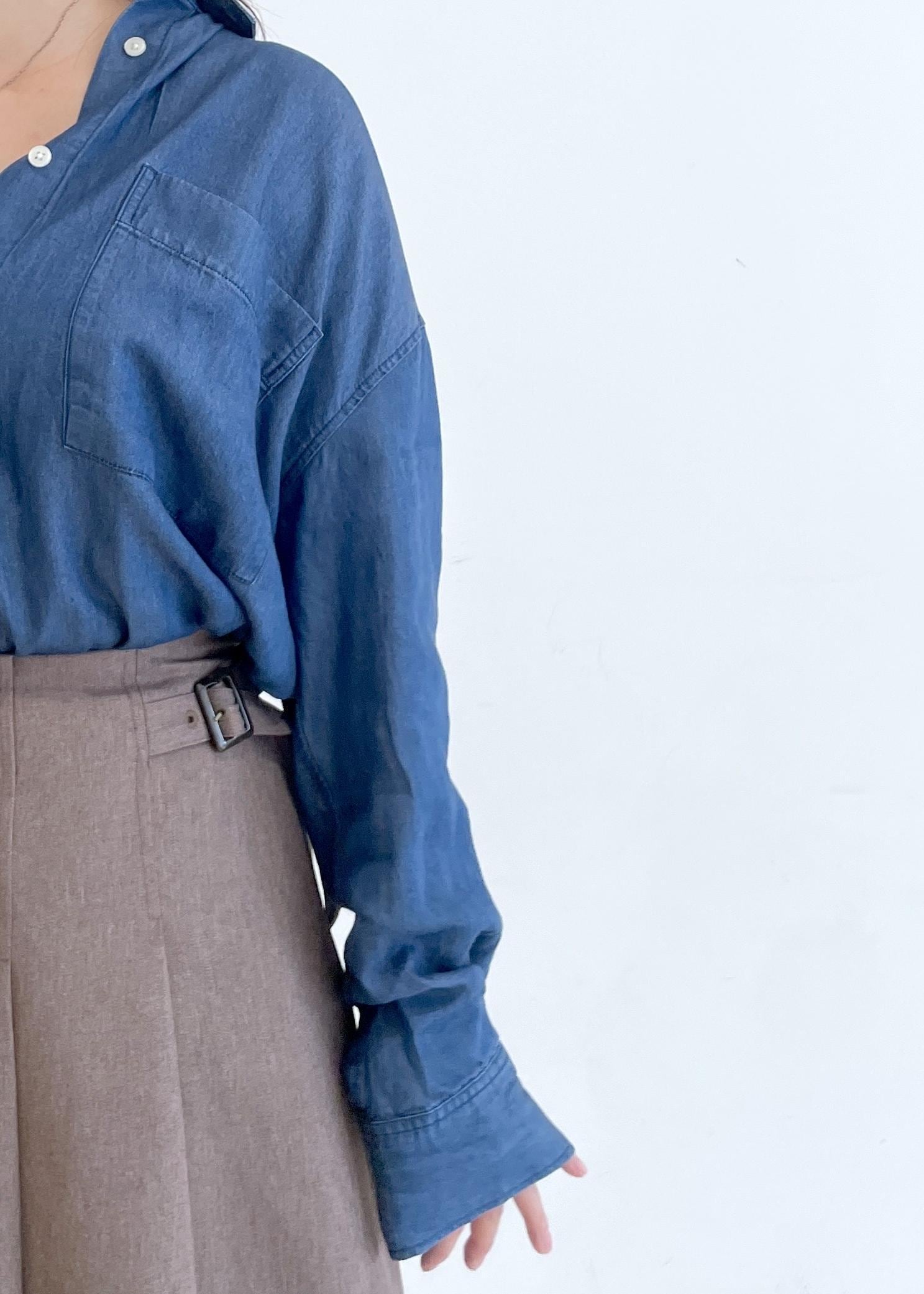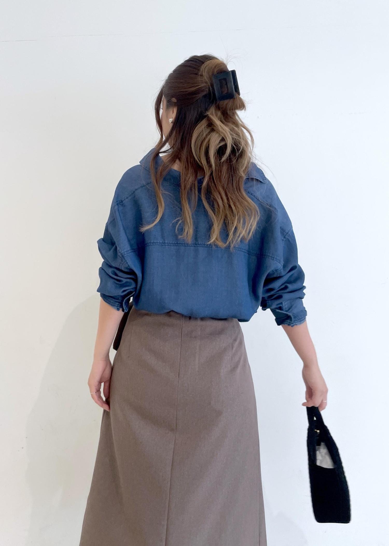 カジュアルなデニムシャツをきれいめで合わせるのが大人ポイントです◎