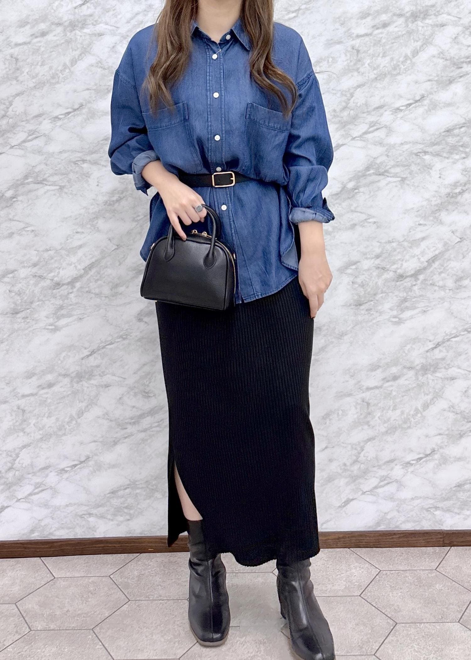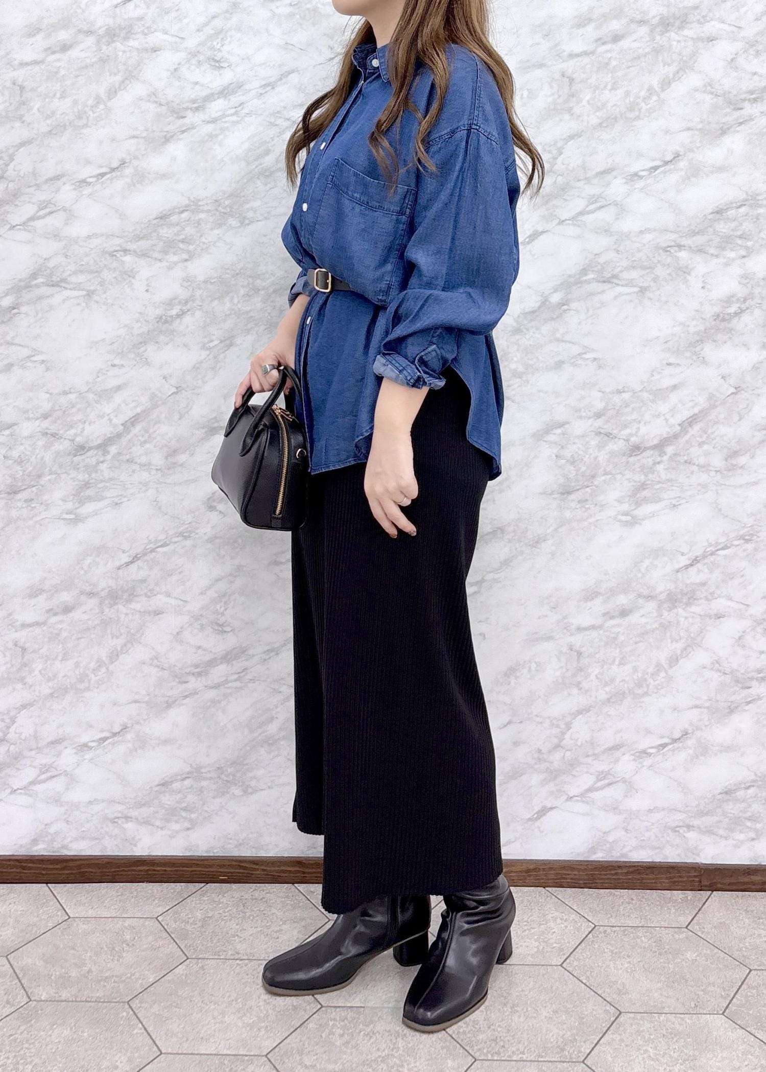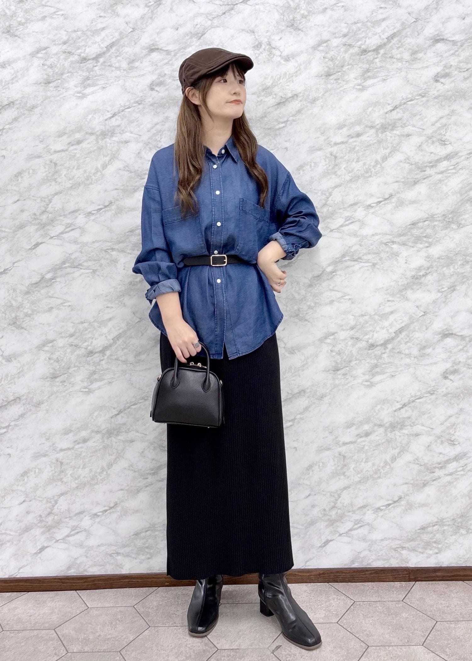 ゆったりめのシャツをベルトでウエストマークし細見えが叶うスタイルです。