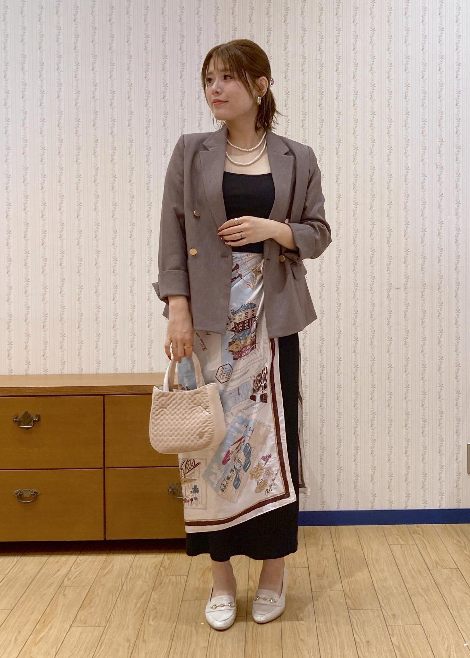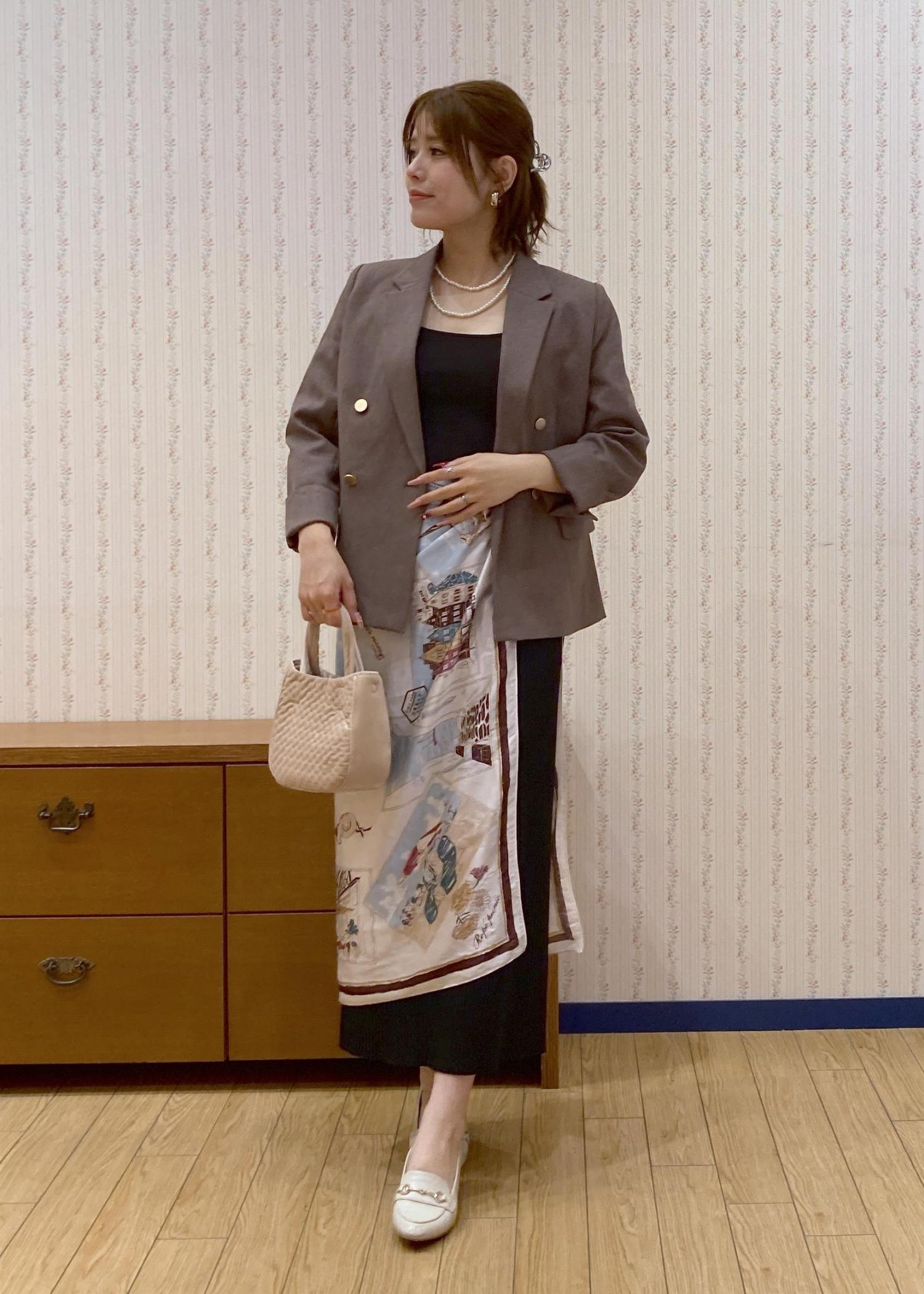 全体をモノトーンでまとめて、スカーフの柄が映えるようにコーディネートしたのがポイントです!