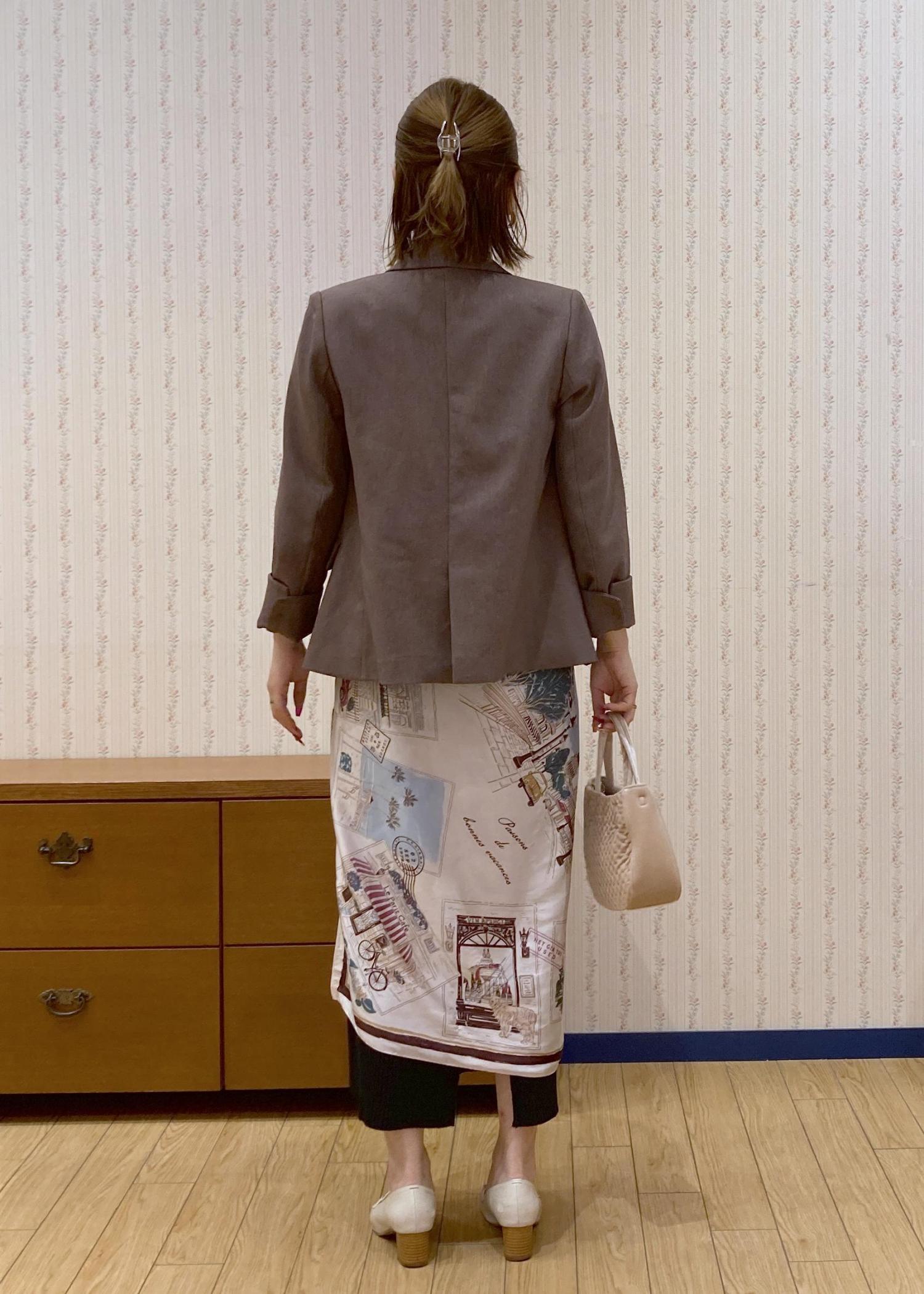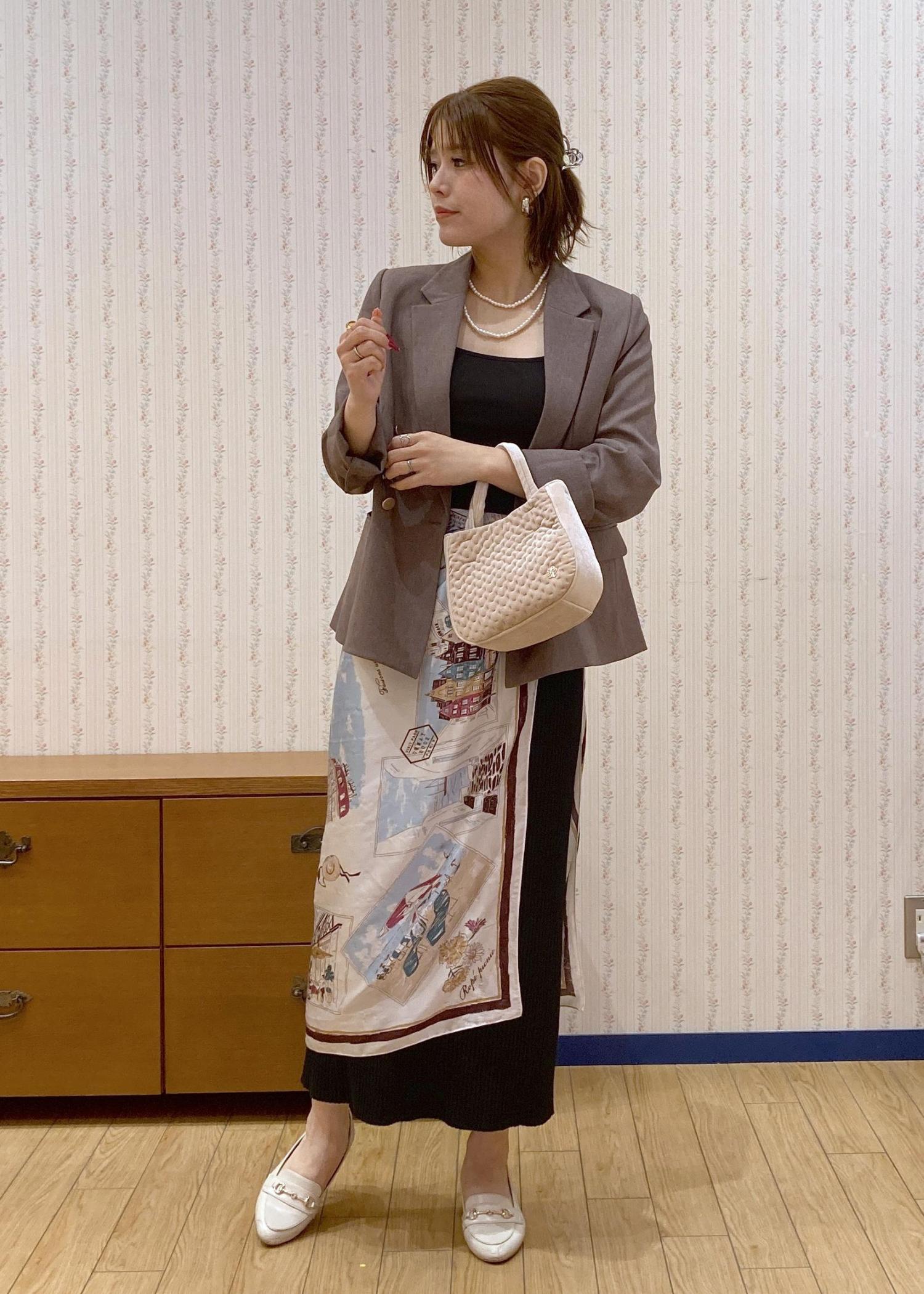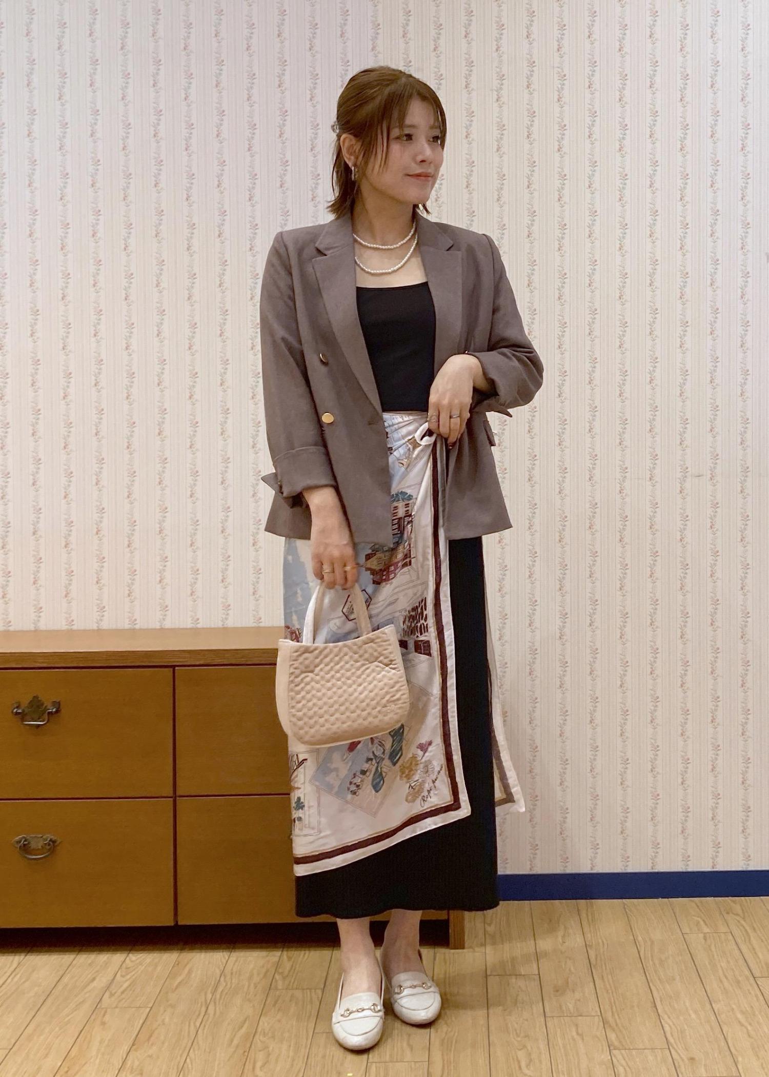 大判のスカーフを巻きスカート風にアレンジした綺麗めコーディネートです。