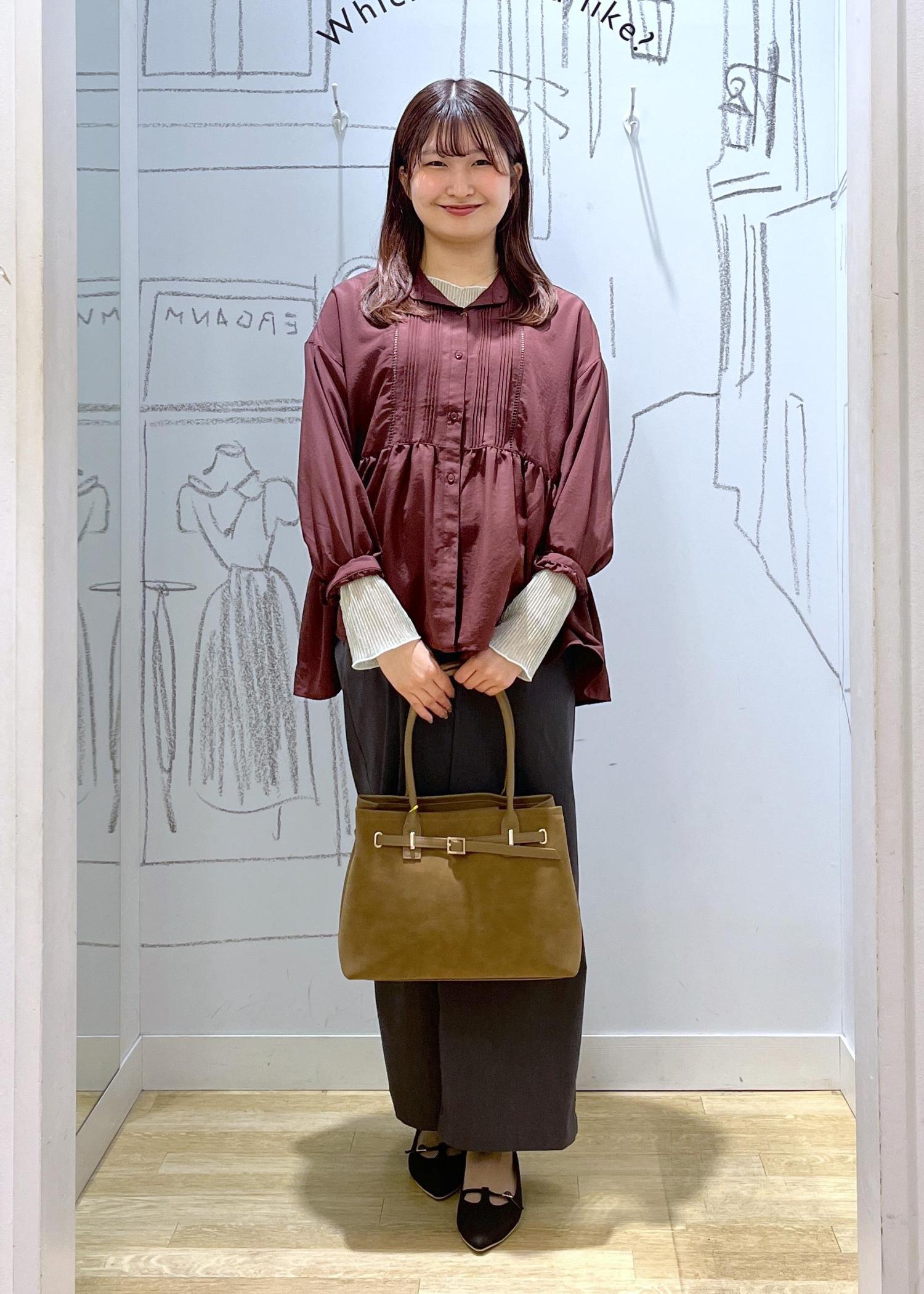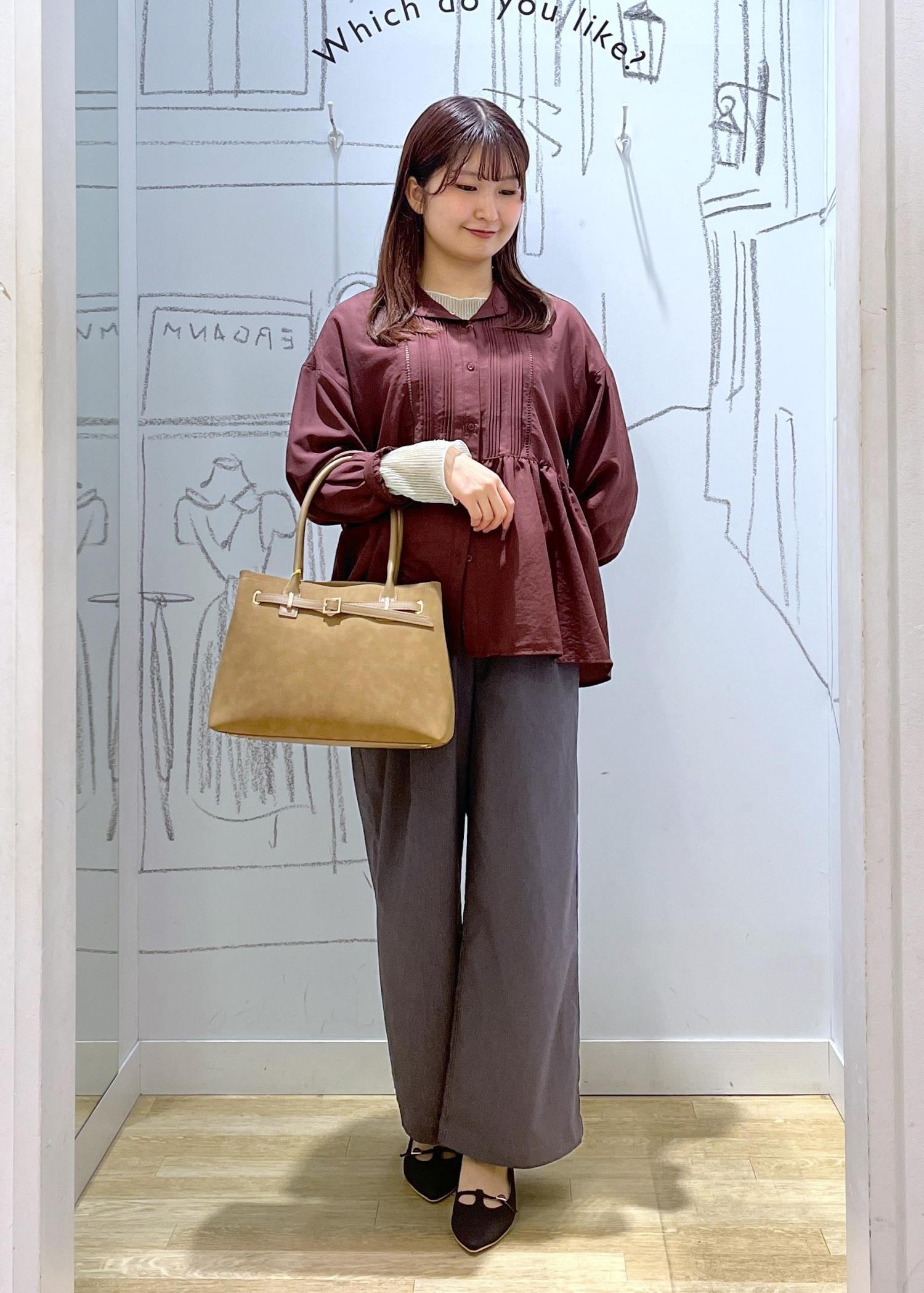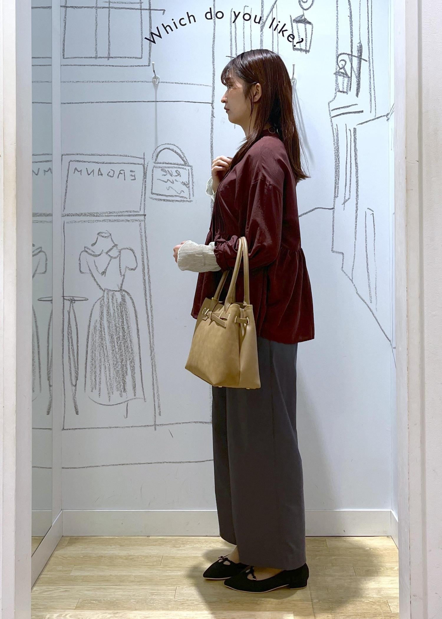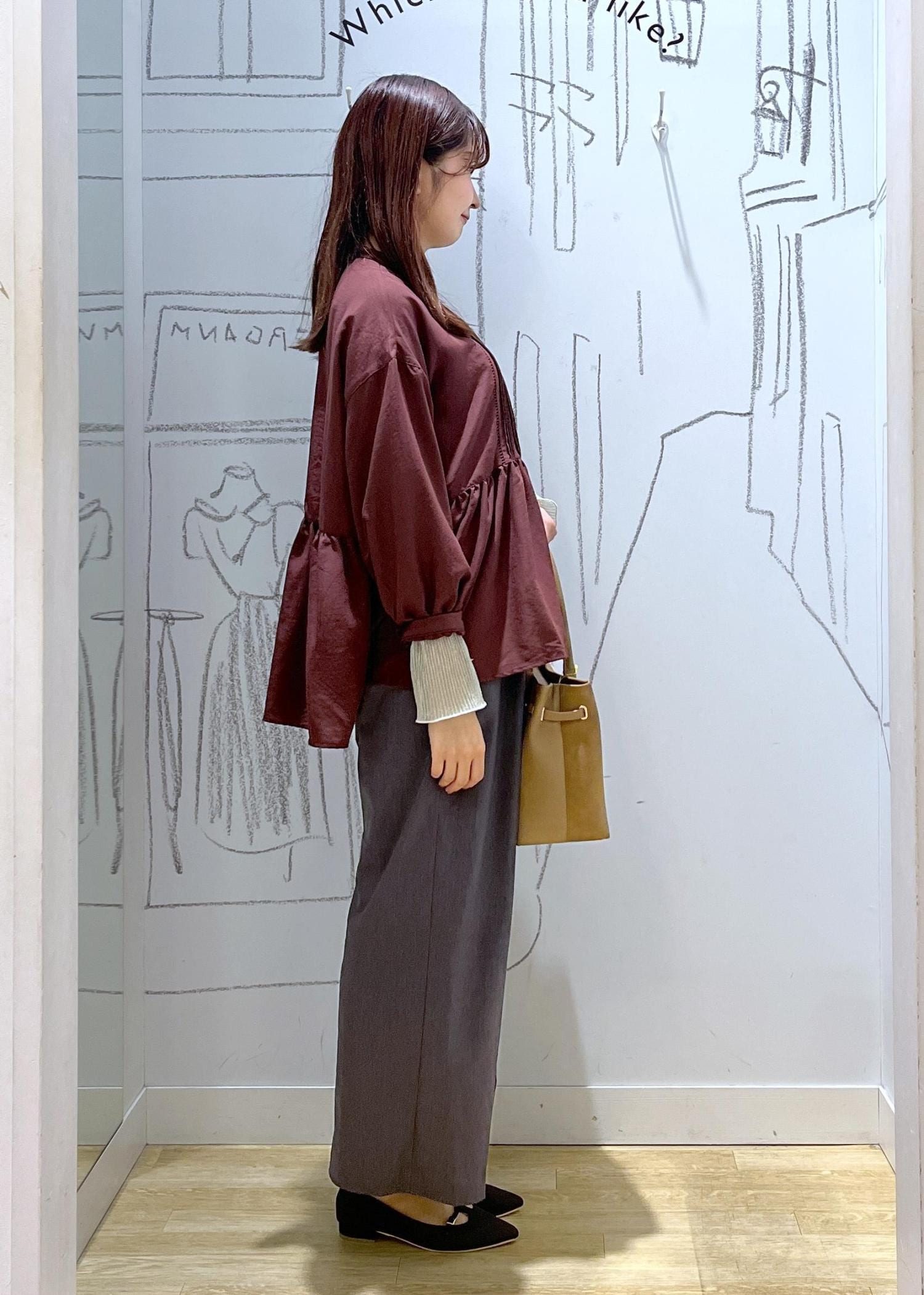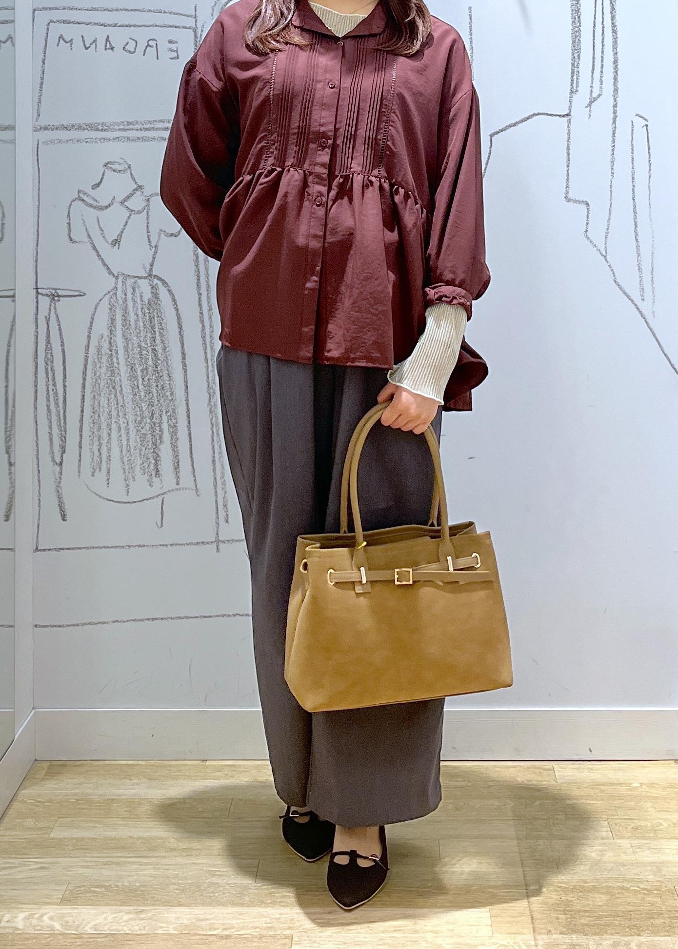 羽織れるピンタックデザインペプラムシャツを活用した着回しコーデを提案!足元と鞄で綺麗めに魅せ、パンツスタイルで動きやすいコーデにしました。中は薄手の長袖で合わせてもかわいいです。