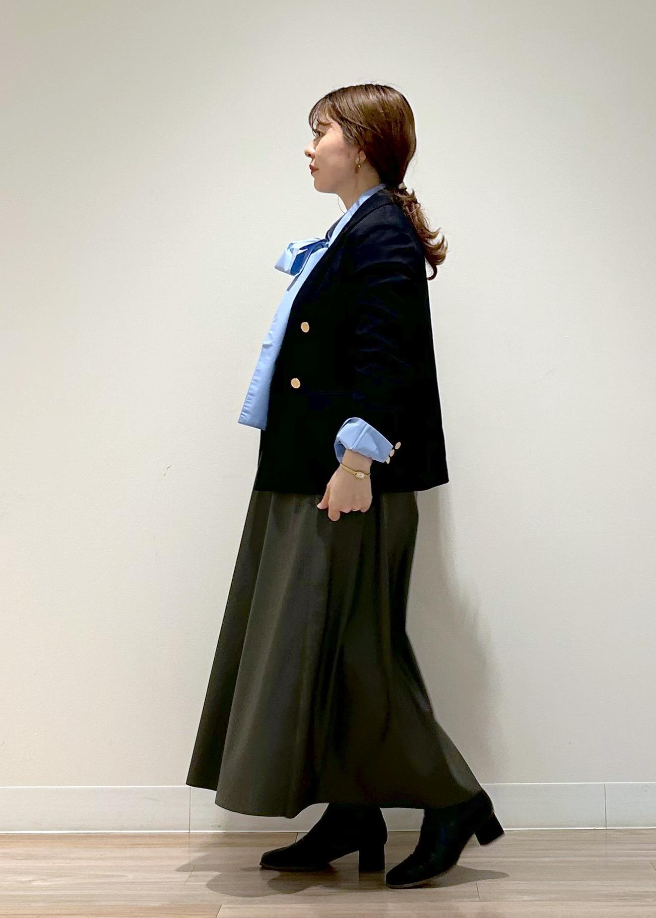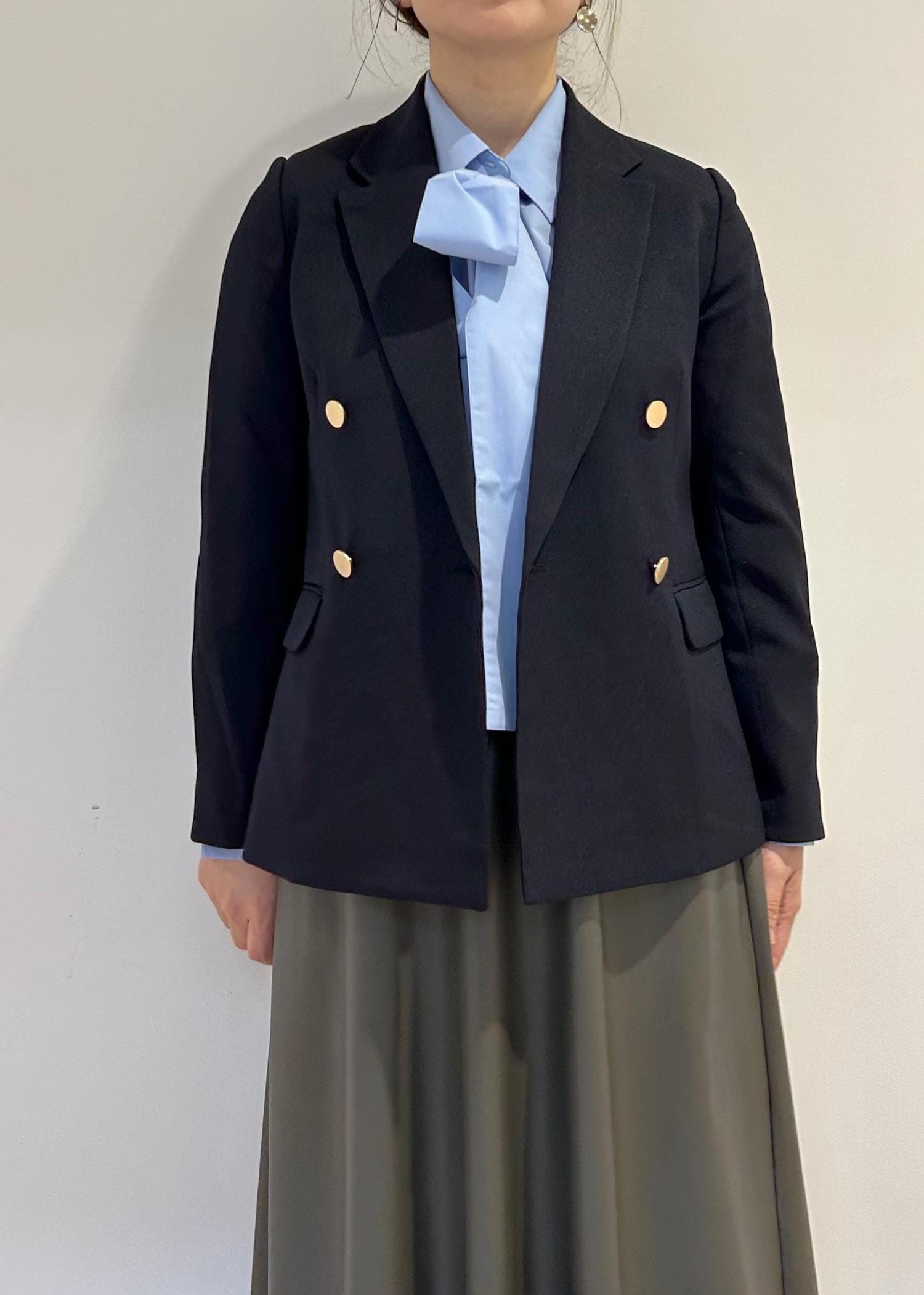 ボウタイブラウスに金釦ジャケットを羽織った、きちんと感のあるコーディネートです。