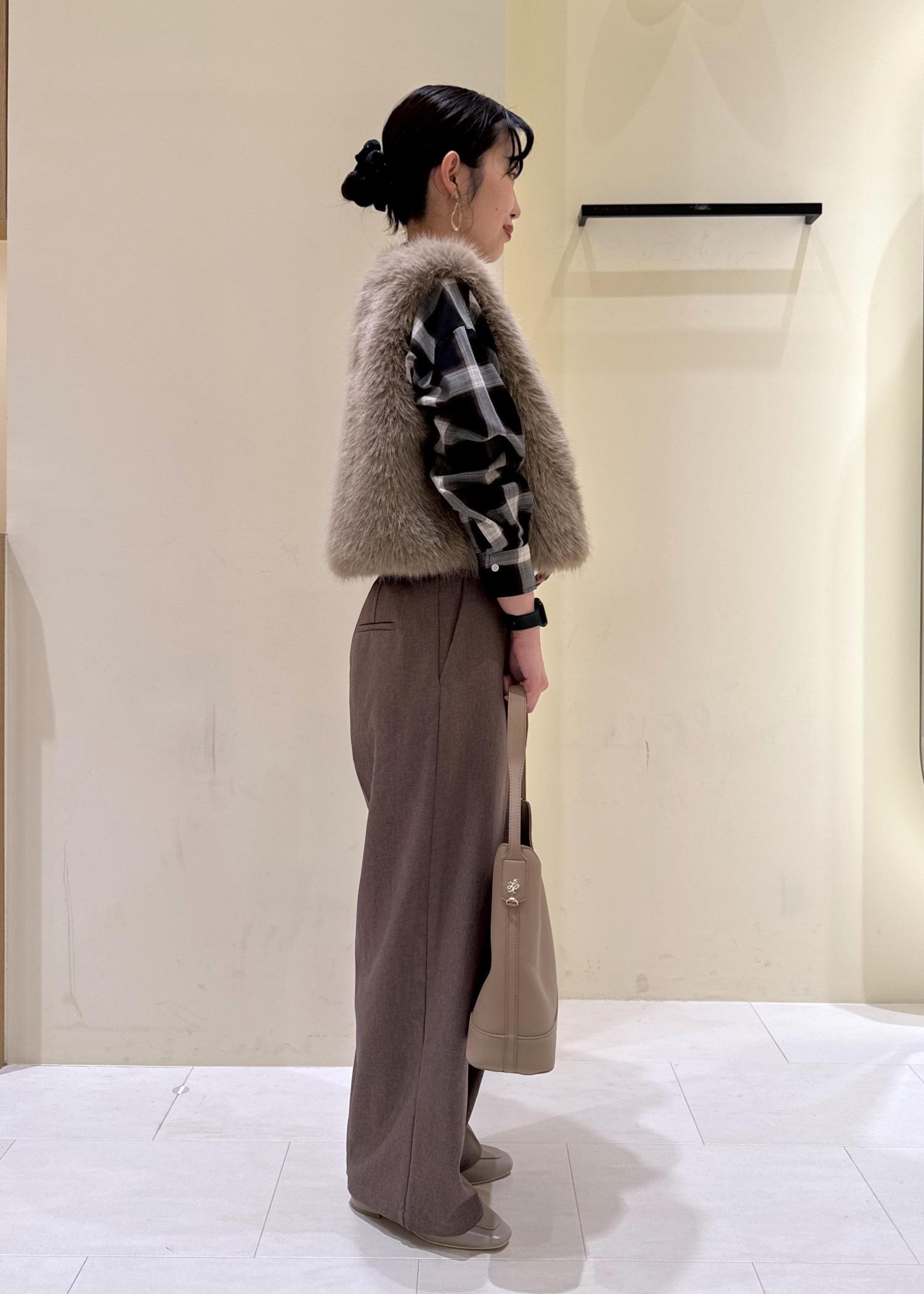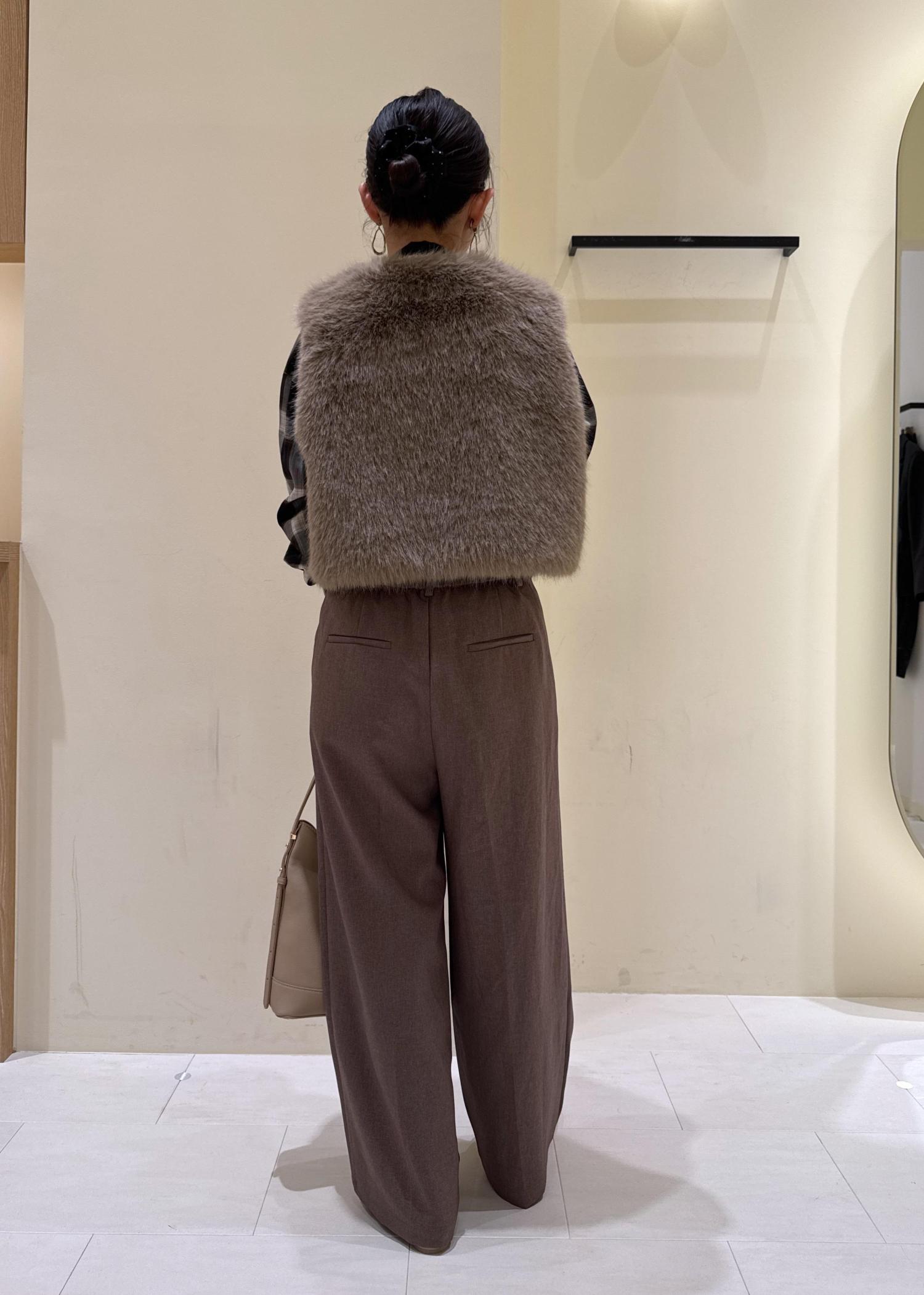 ファーベストの丈が腰に当たるぐらいの短めなので、ワイドパンツと合わせてもすっきりとしたシルエットです◎