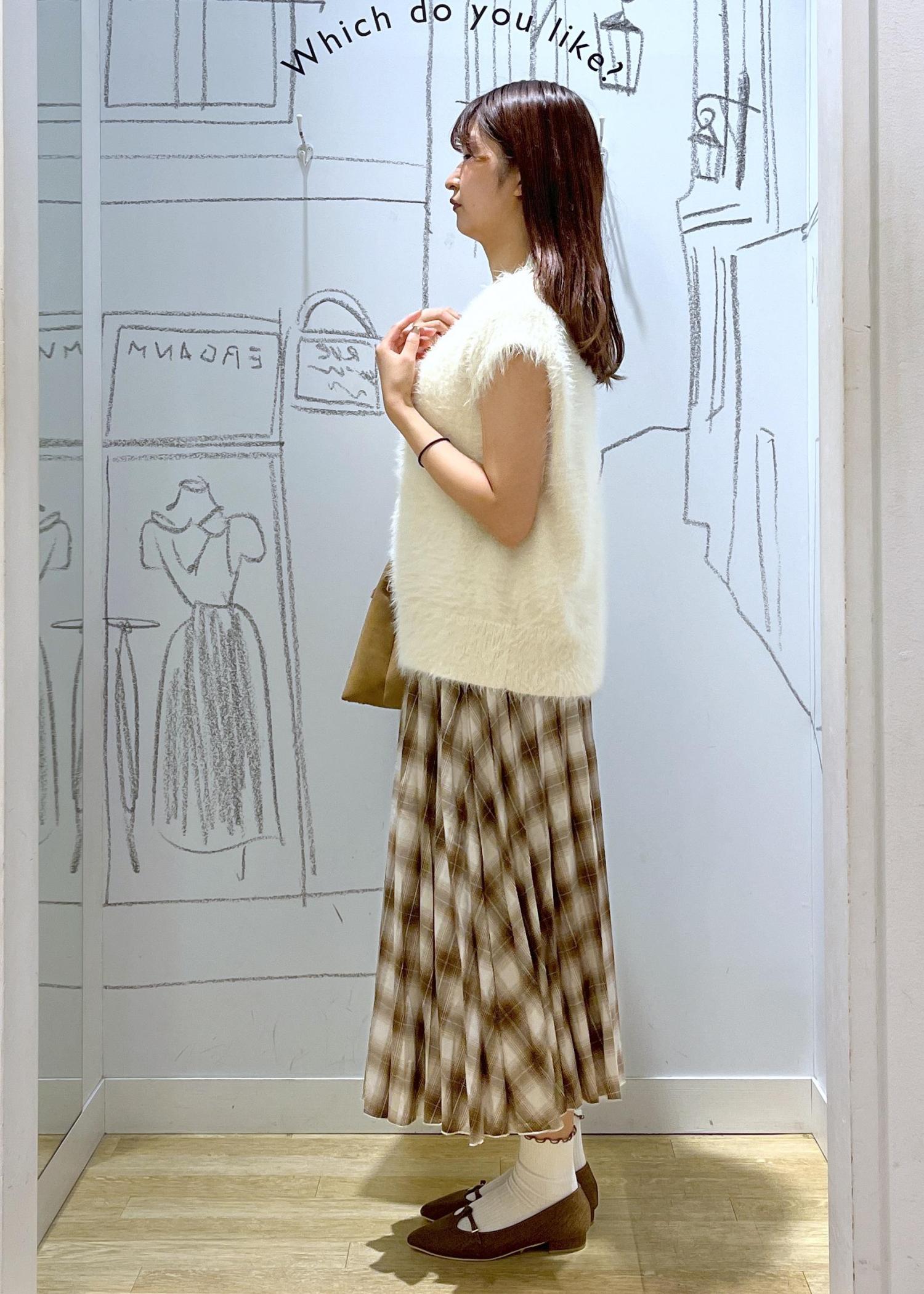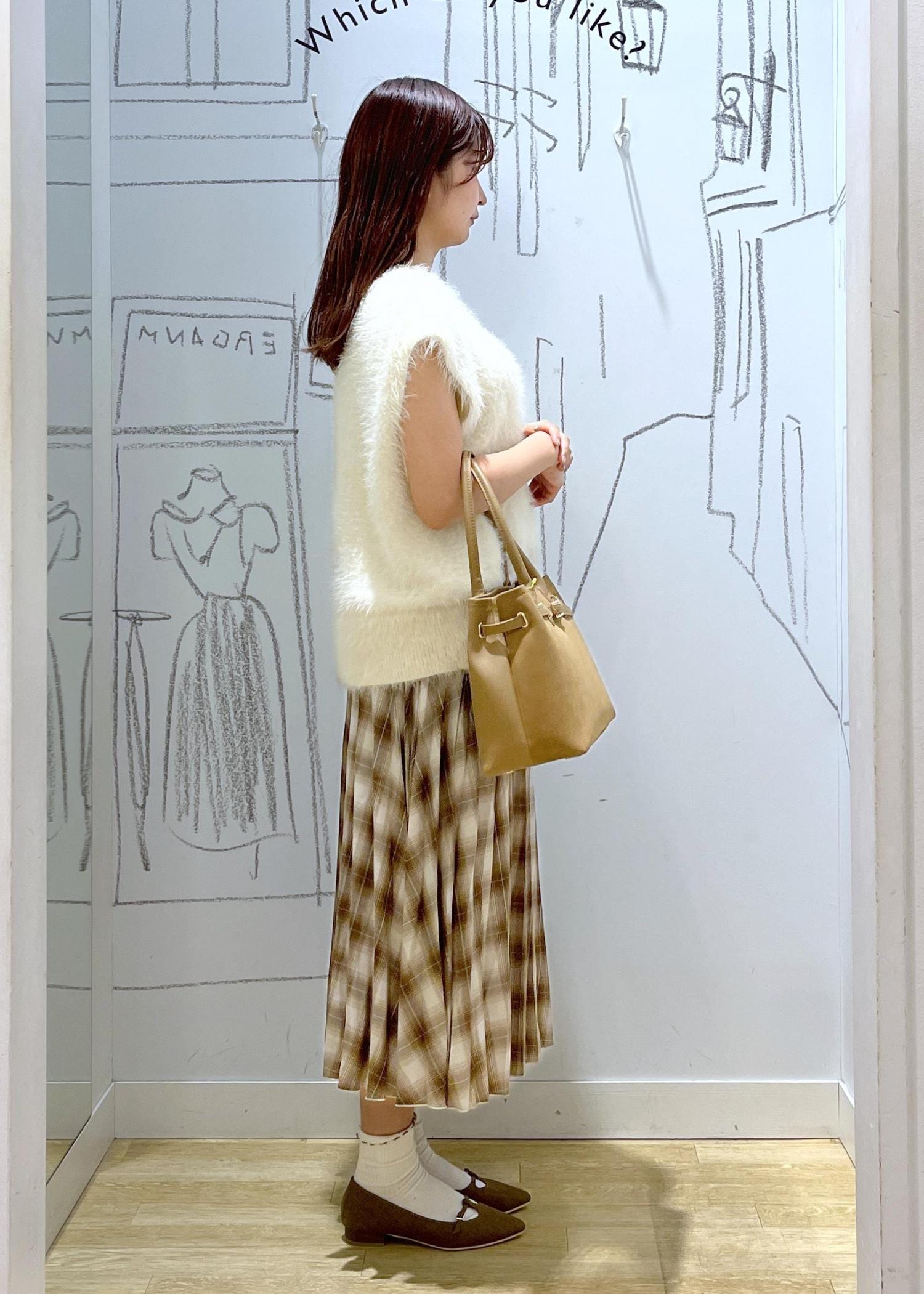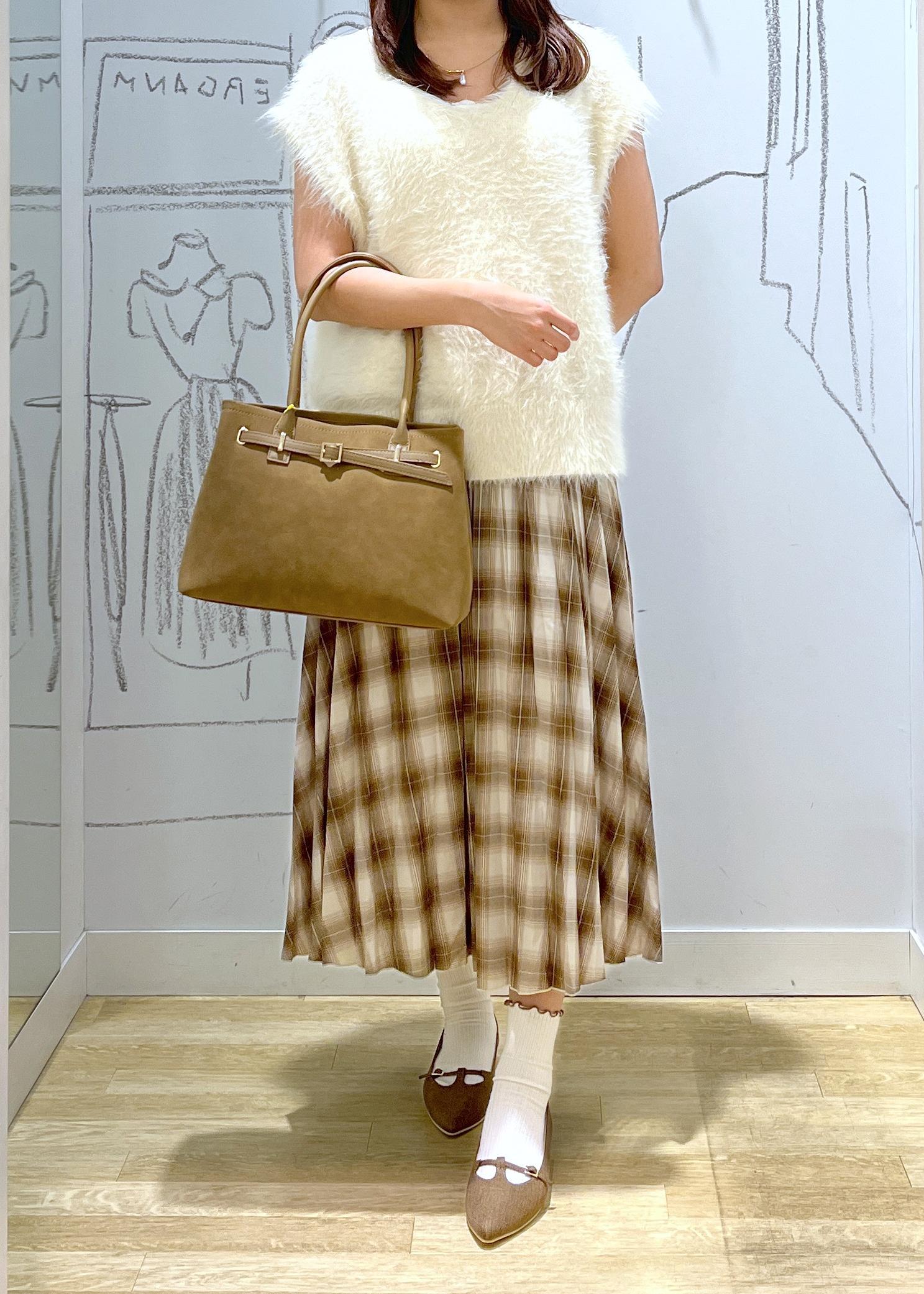 まだまだ暑いですが、秋を感じたい方に取っておきなフェザーニットとチェック柄のスカートを組み合わせ靴元と鞄は統一感の出る綺麗めなベージュスタイルにしました。