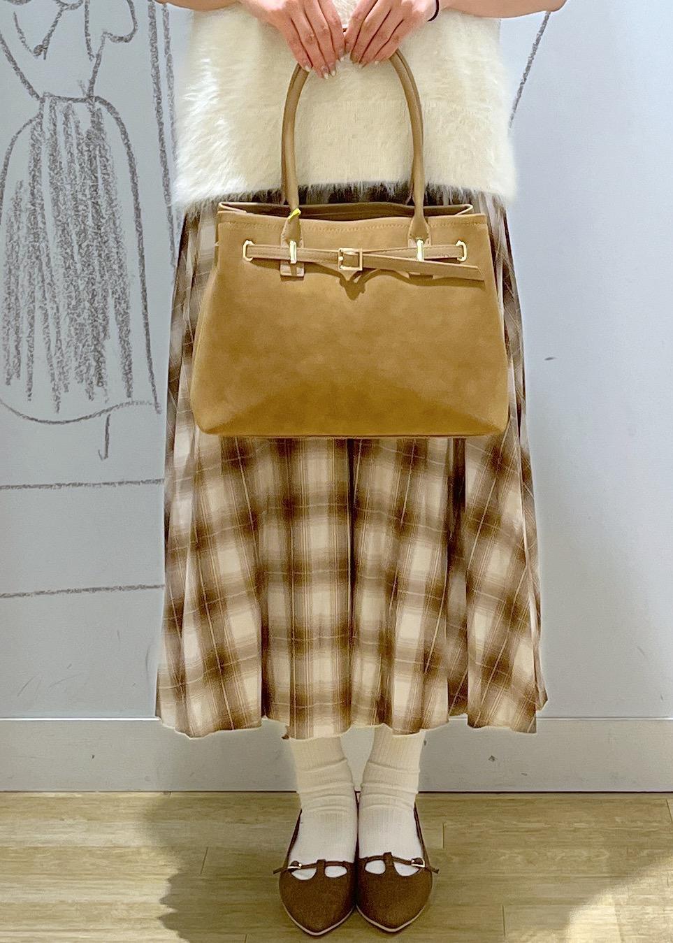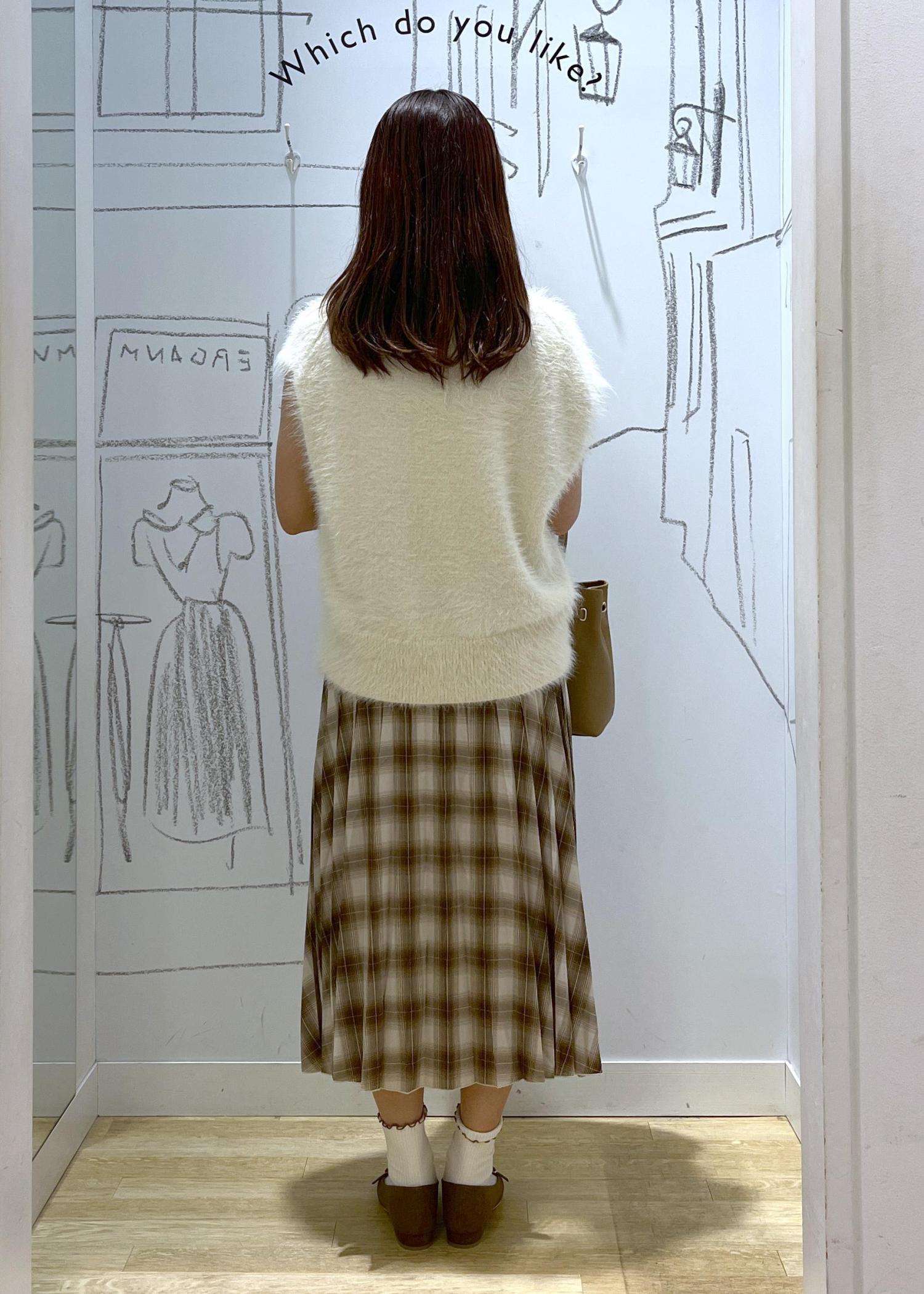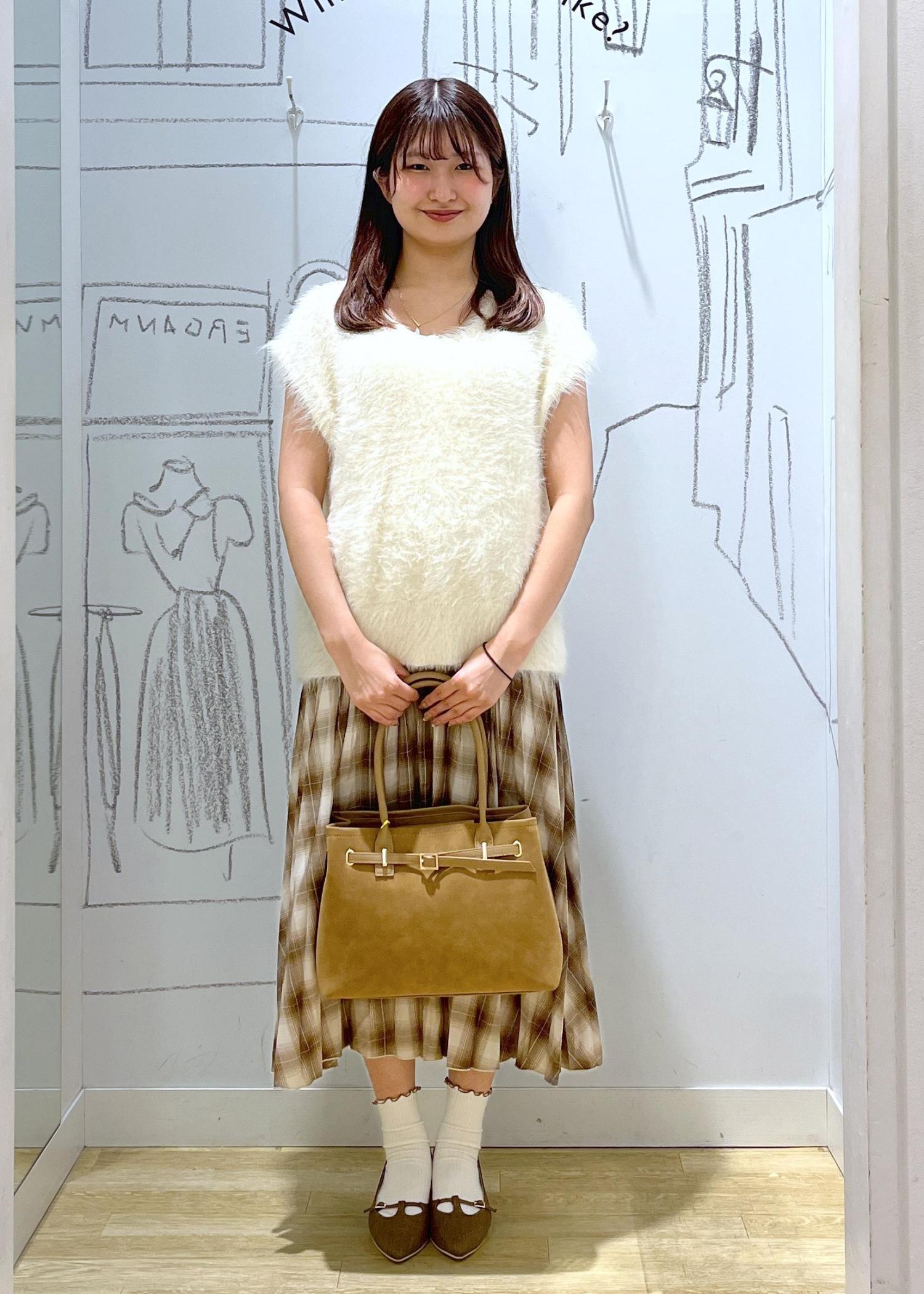 まだまだ暑いですが、秋を感じたい方に取っておきなフェザーニットとチェック柄のスカートを組み合わせ靴元と鞄は統一感の出る綺麗めなベージュスタイルにしました。