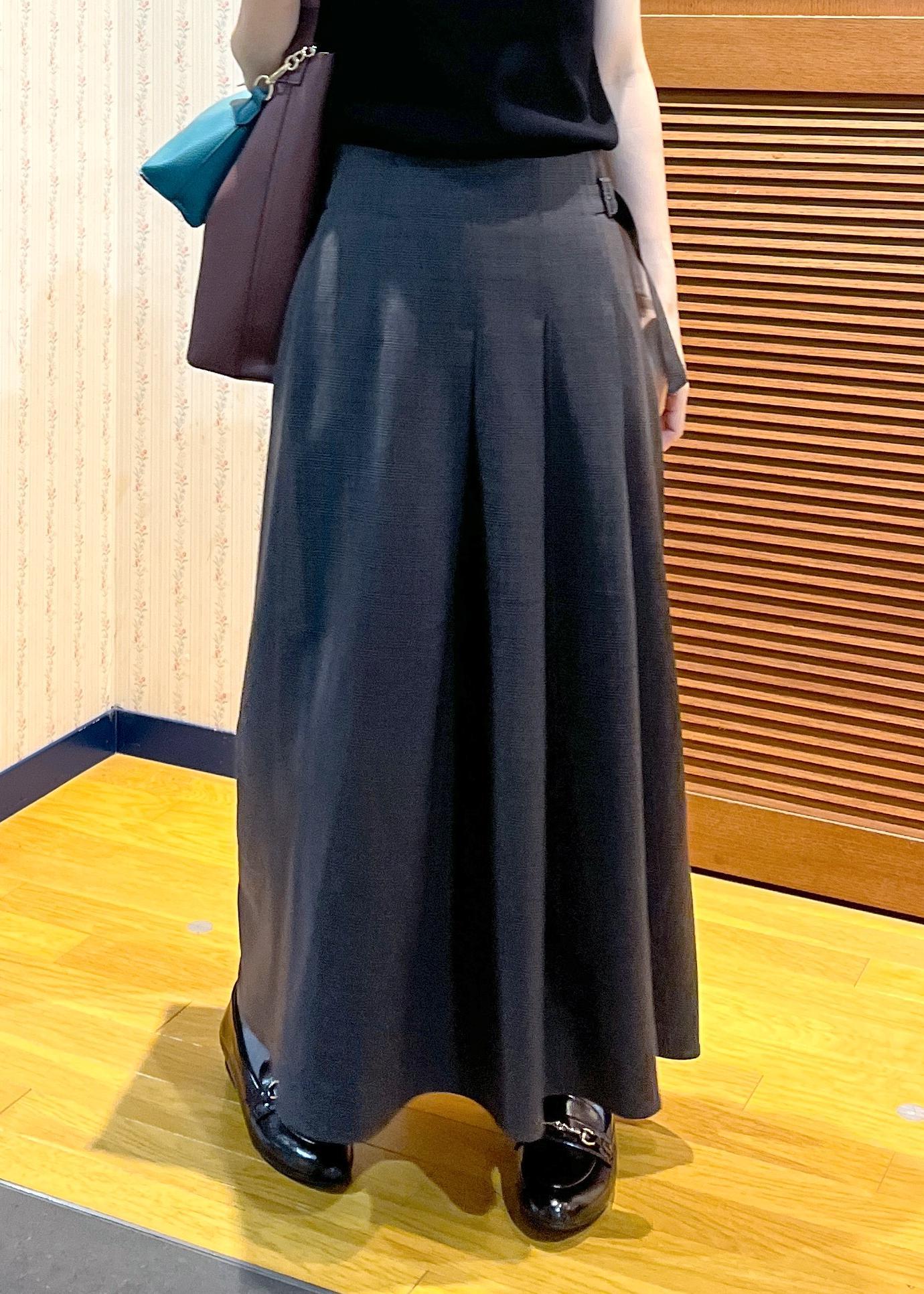 くるぶしが出るくらいの長めの丈感ですが、サイドにベルトもありメリハリがあってすっきりと見えます。 -