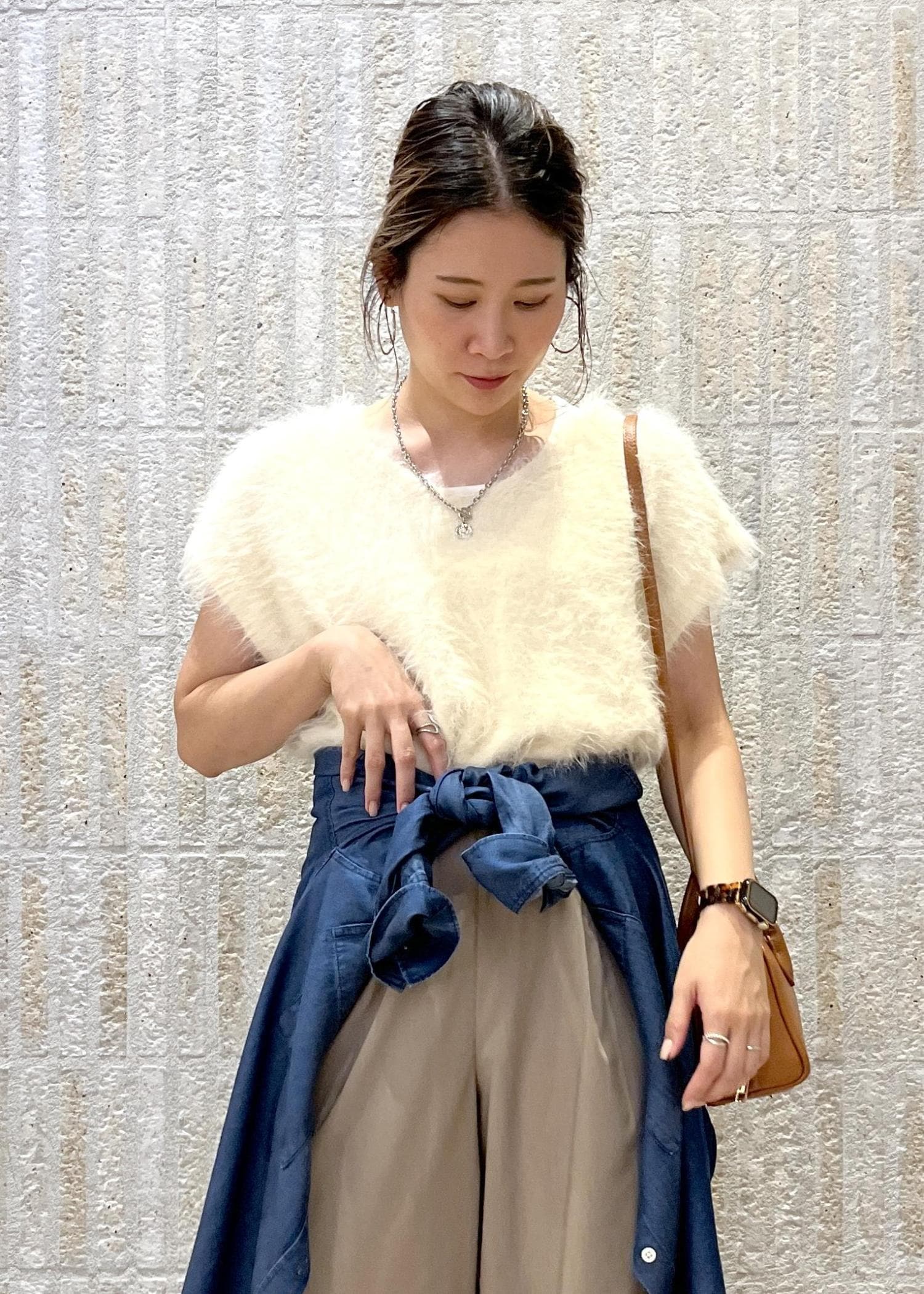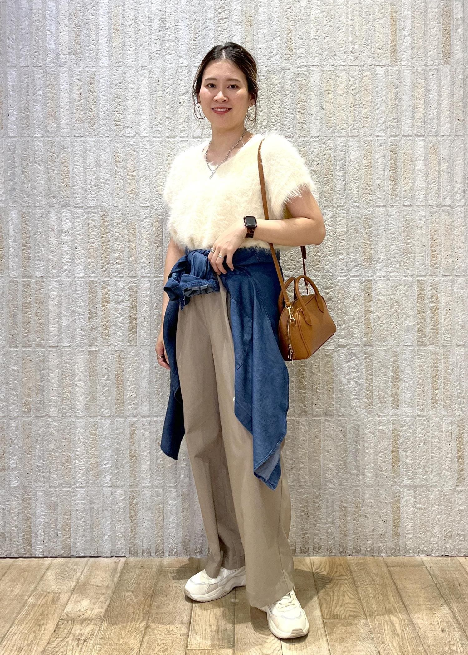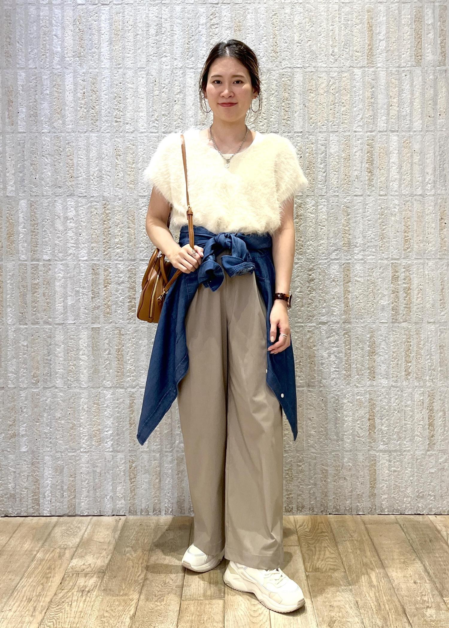 一見甘く見えがちなホワイトカラーのシャギーニットも、ワイドパンツとスニーカー合わせでカジュアルな雰囲気に。