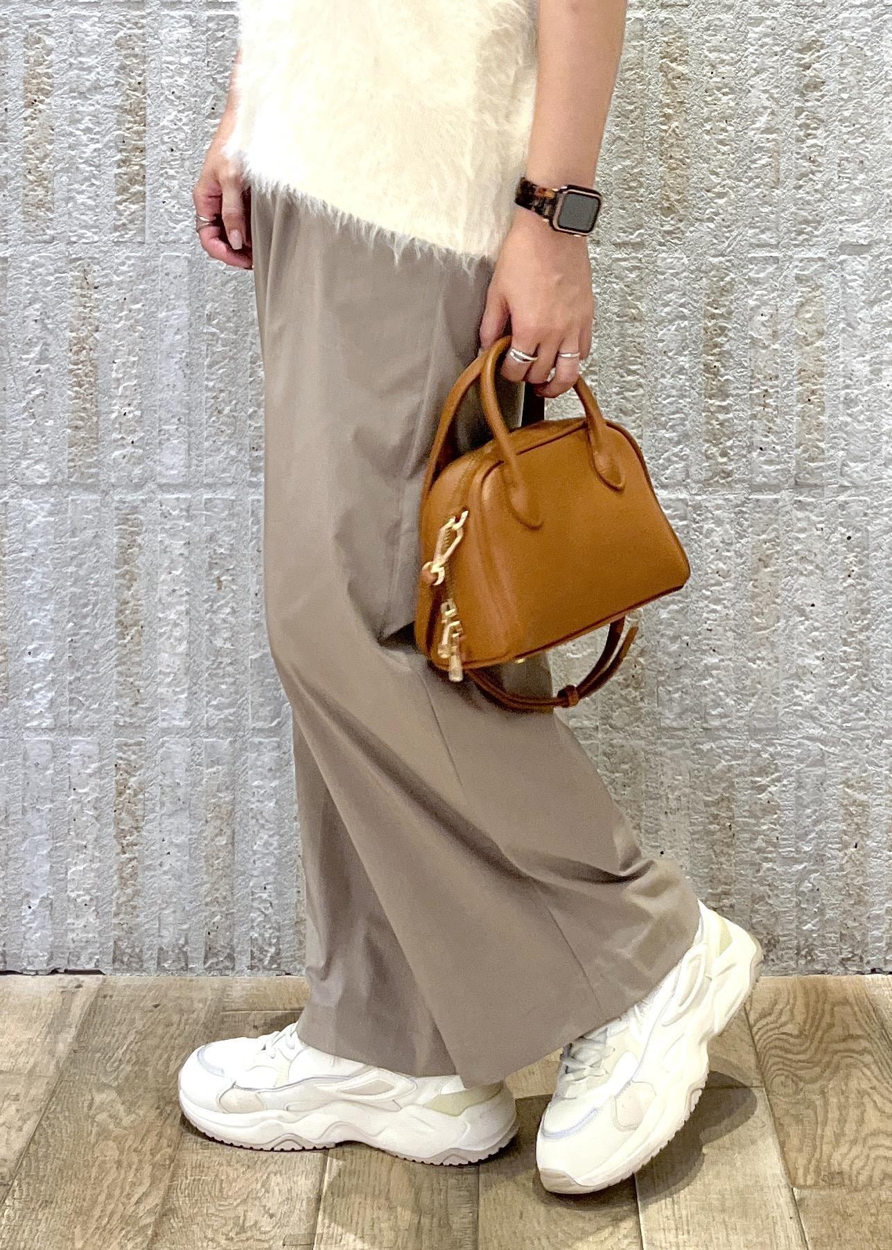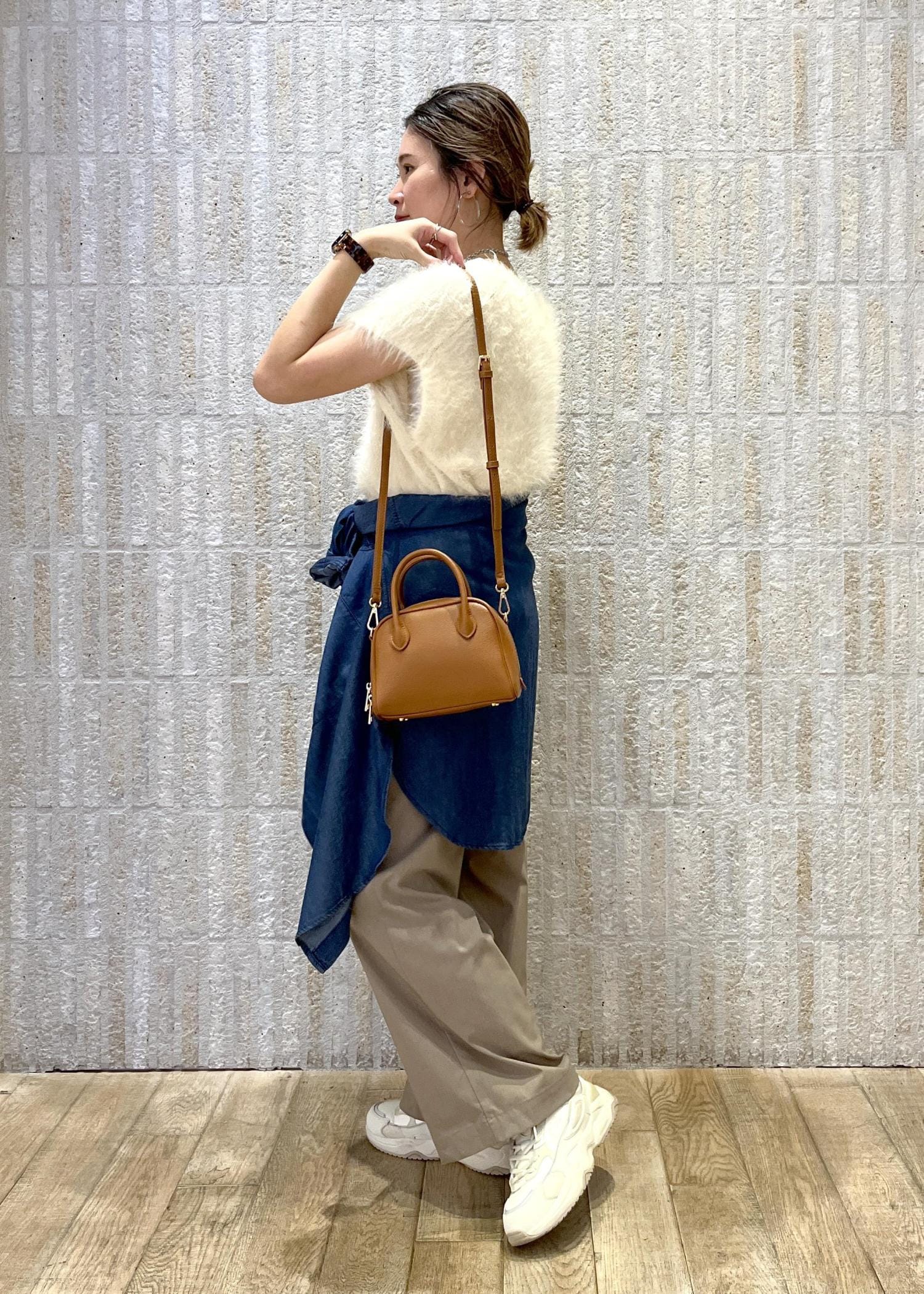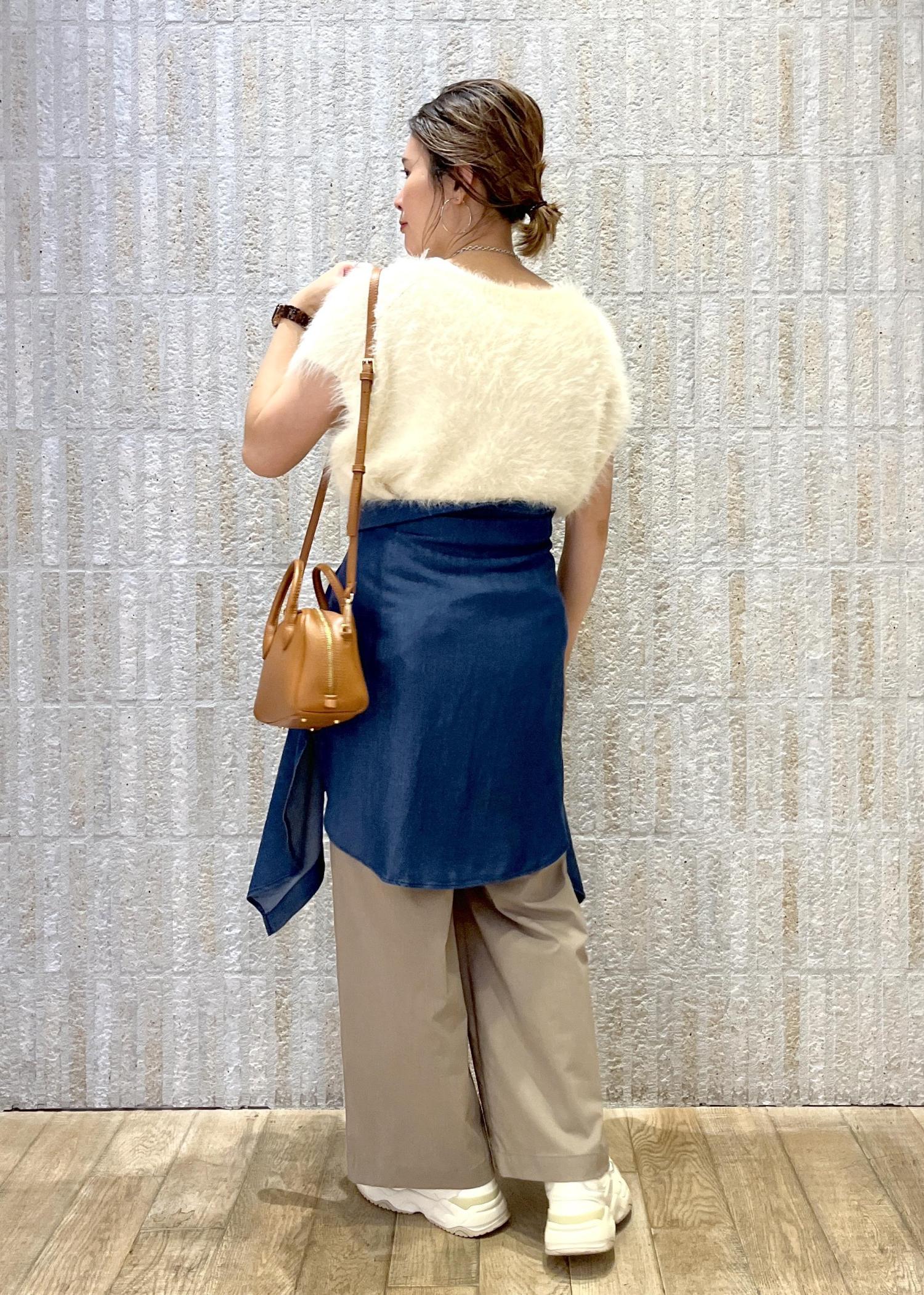 一見甘く見えがちなホワイトカラーのシャギーニットも、ワイドパンツとスニーカー合わせでカジュアルな雰囲気に。