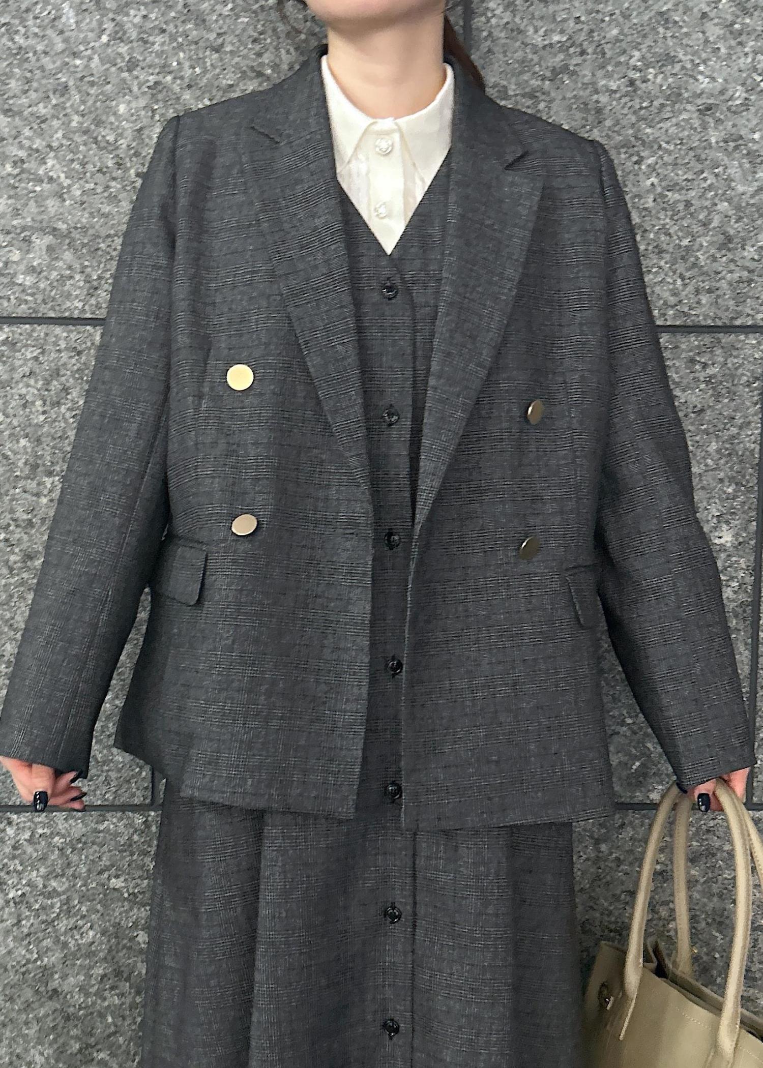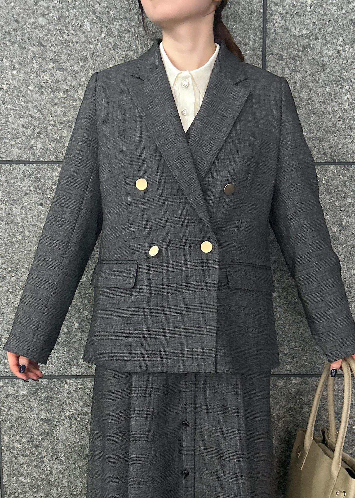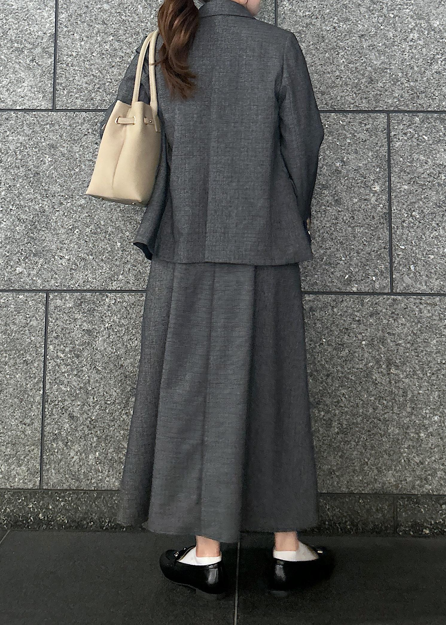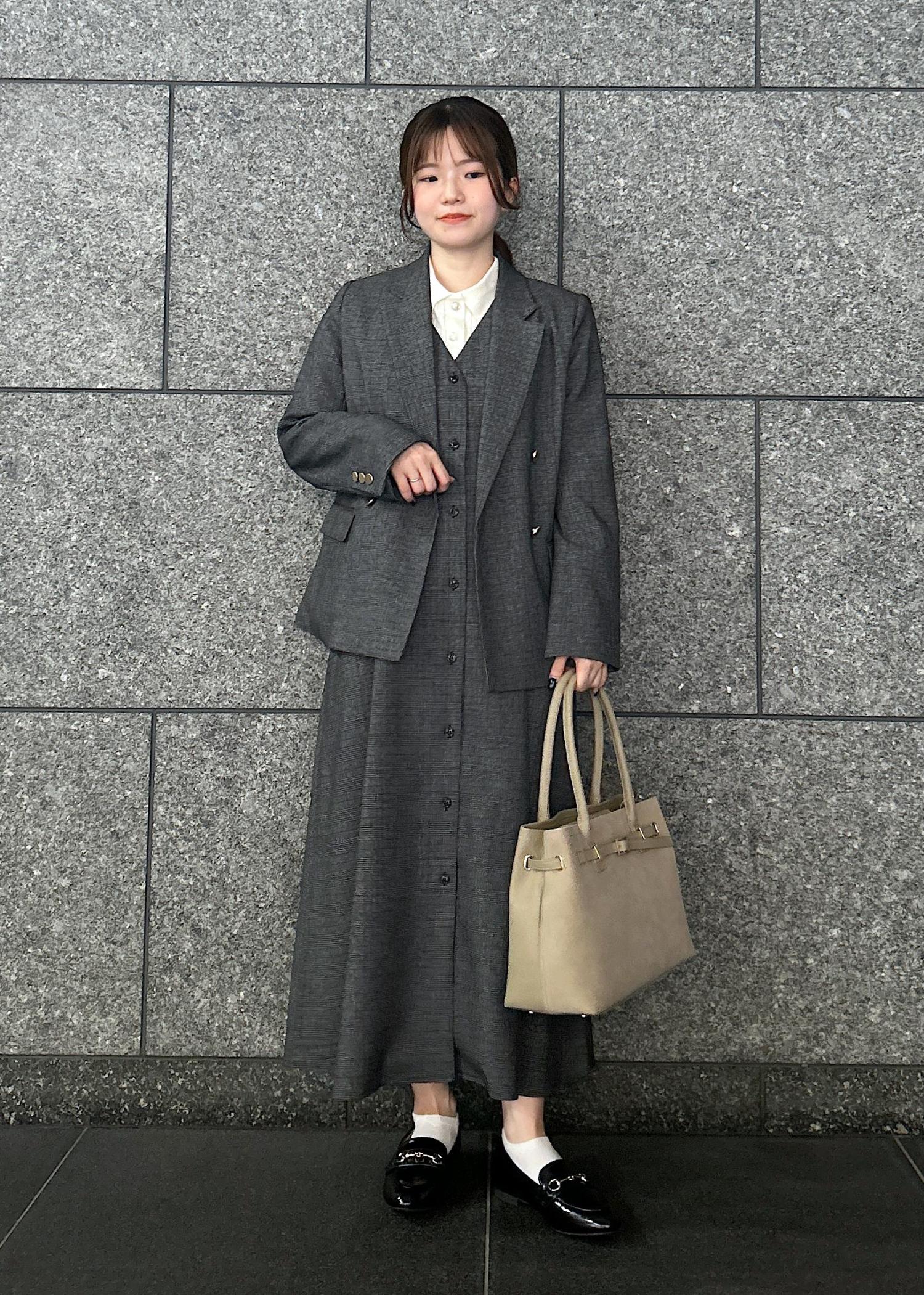 人気のジャケットにセットアップのジャンパースカートを合わせたキレイめコーデです。